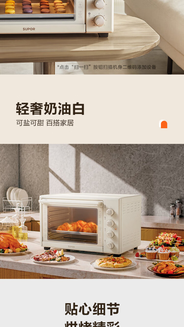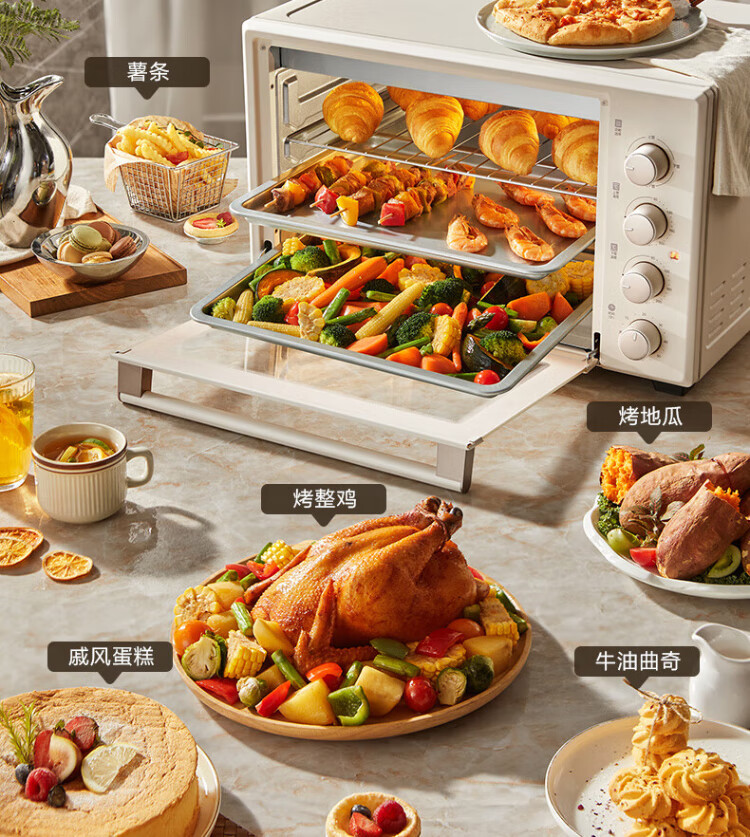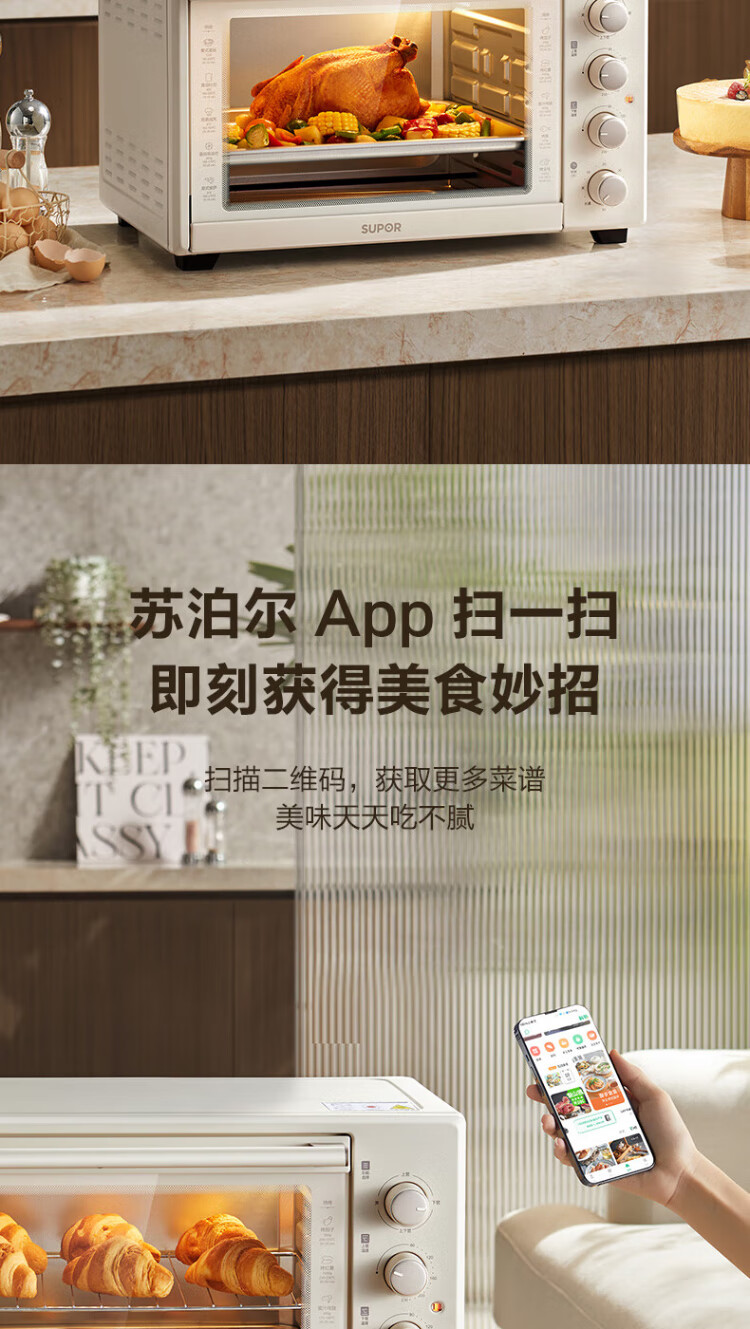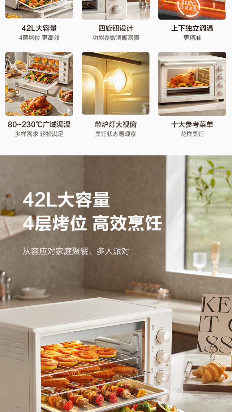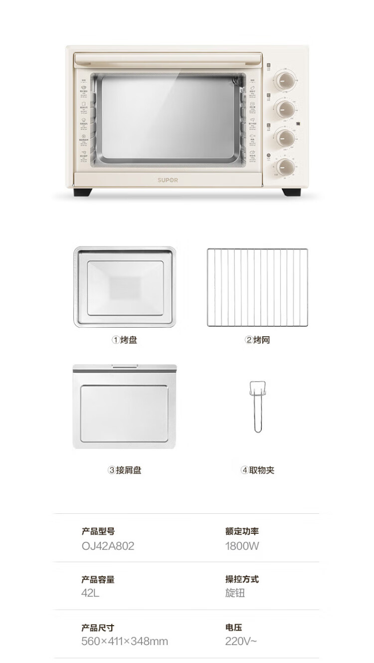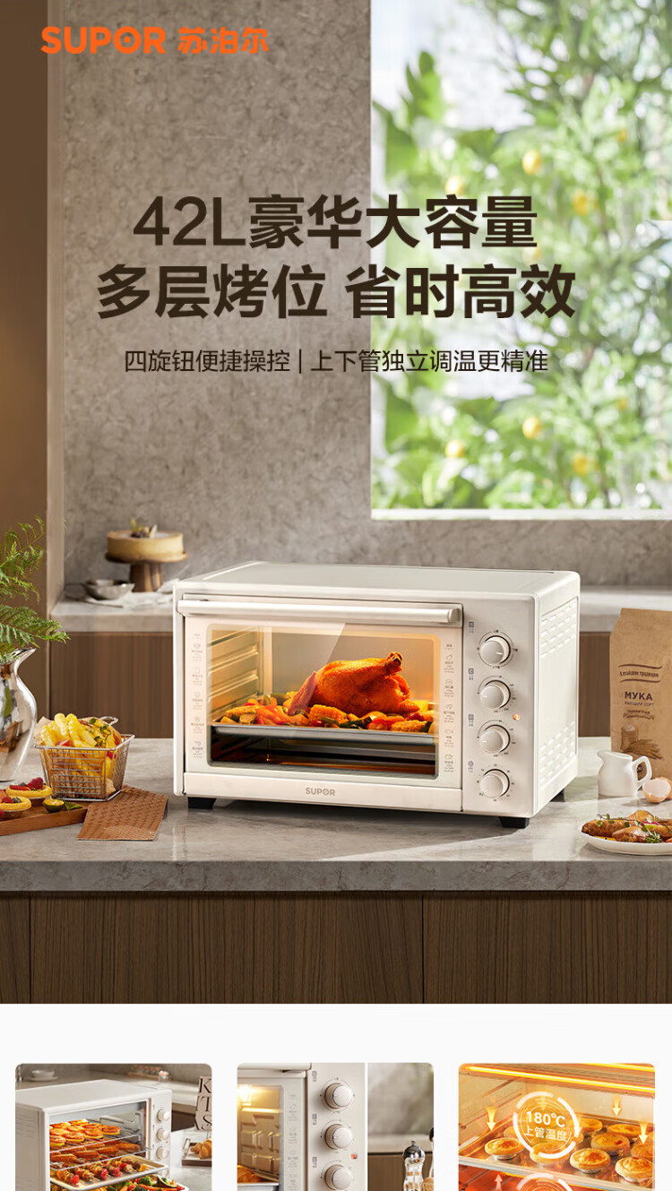 SUPOR national subsidy household multi-functional large-capacity 42L electric oven with upper and lower independent temperature control with oven light multi-layer baking position professional baking cream white OJ42A802