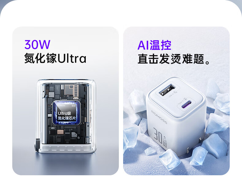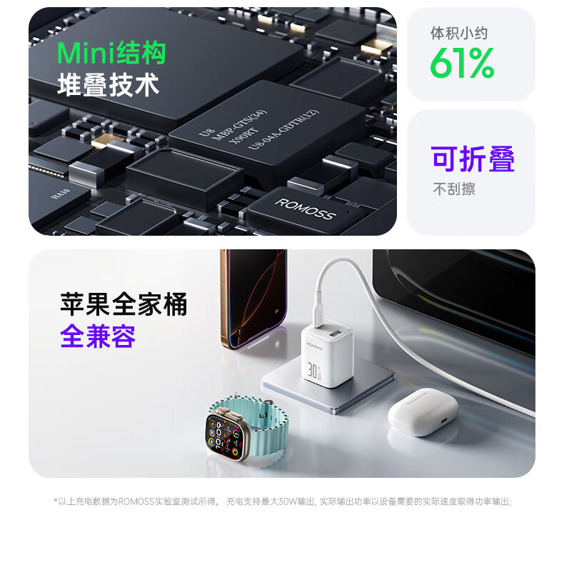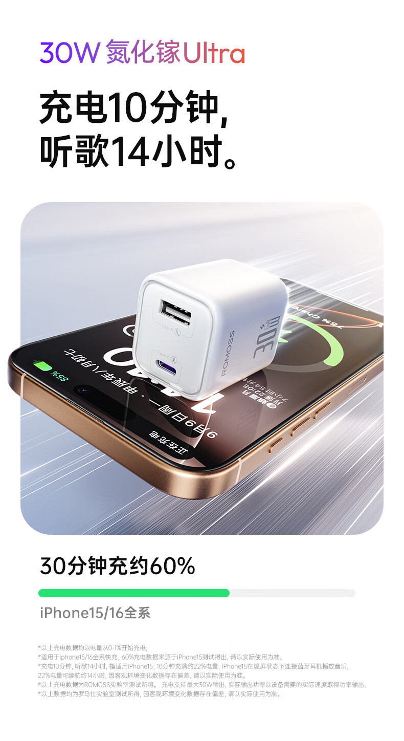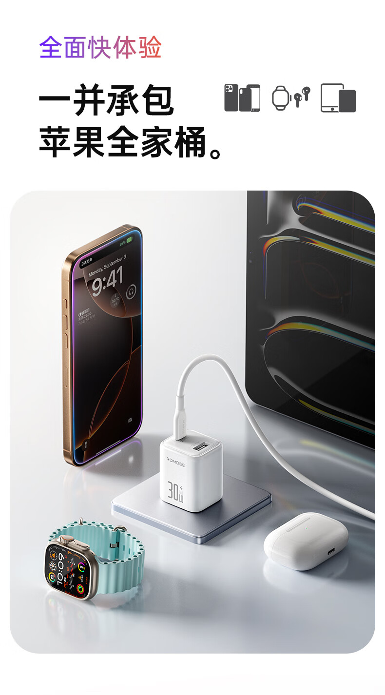 罗马仕苹果充电器30W氮化镓iPhone16/15ProMax快充套装兼容PD20W适用ipad平板Type-C数据线手机快充头