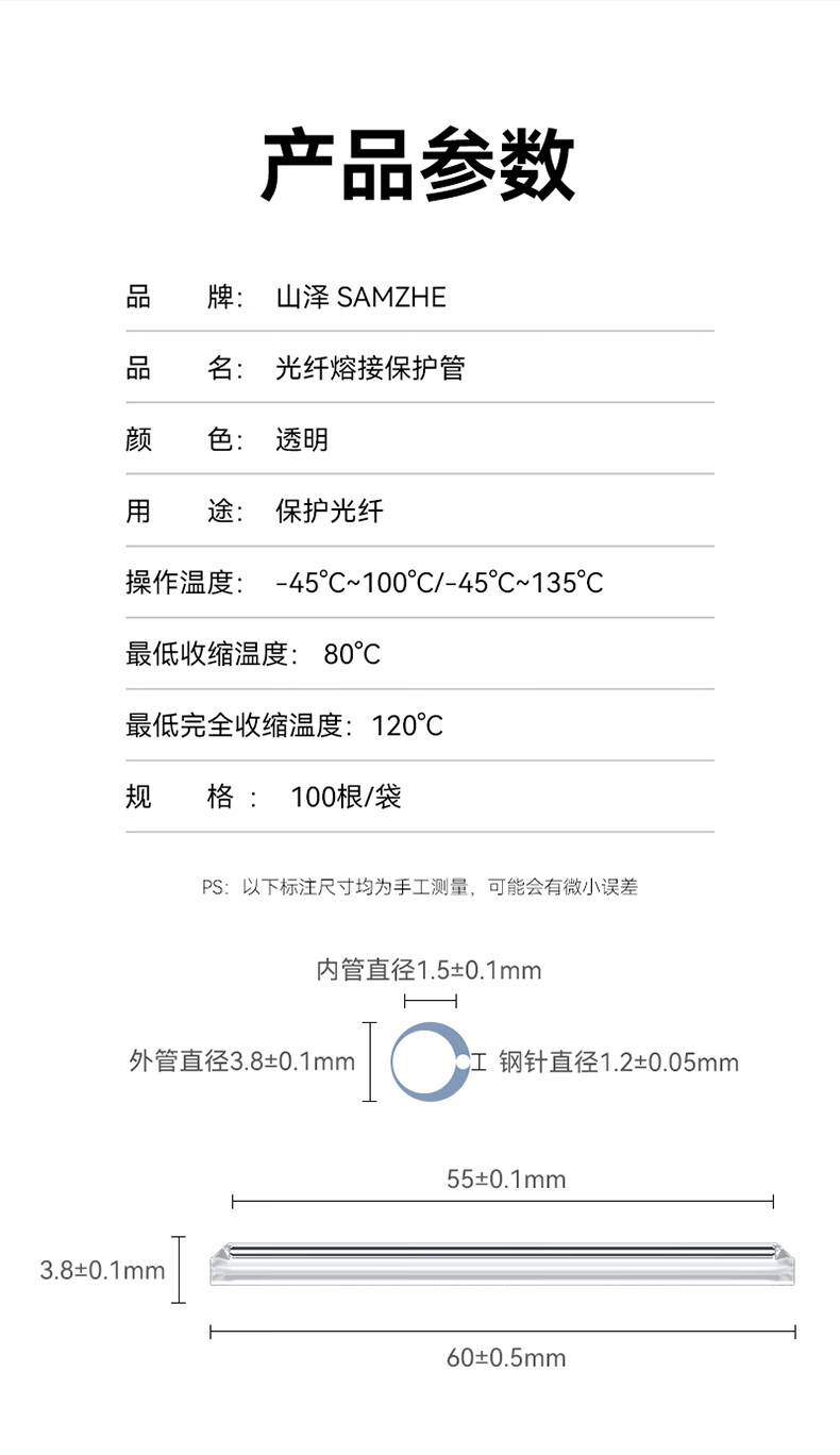 山泽 光纤热缩管光纤热熔管皮线跳线尾纤熔接机热熔套管单芯光缆内径1.4mm(细)100根/包 RSG-01