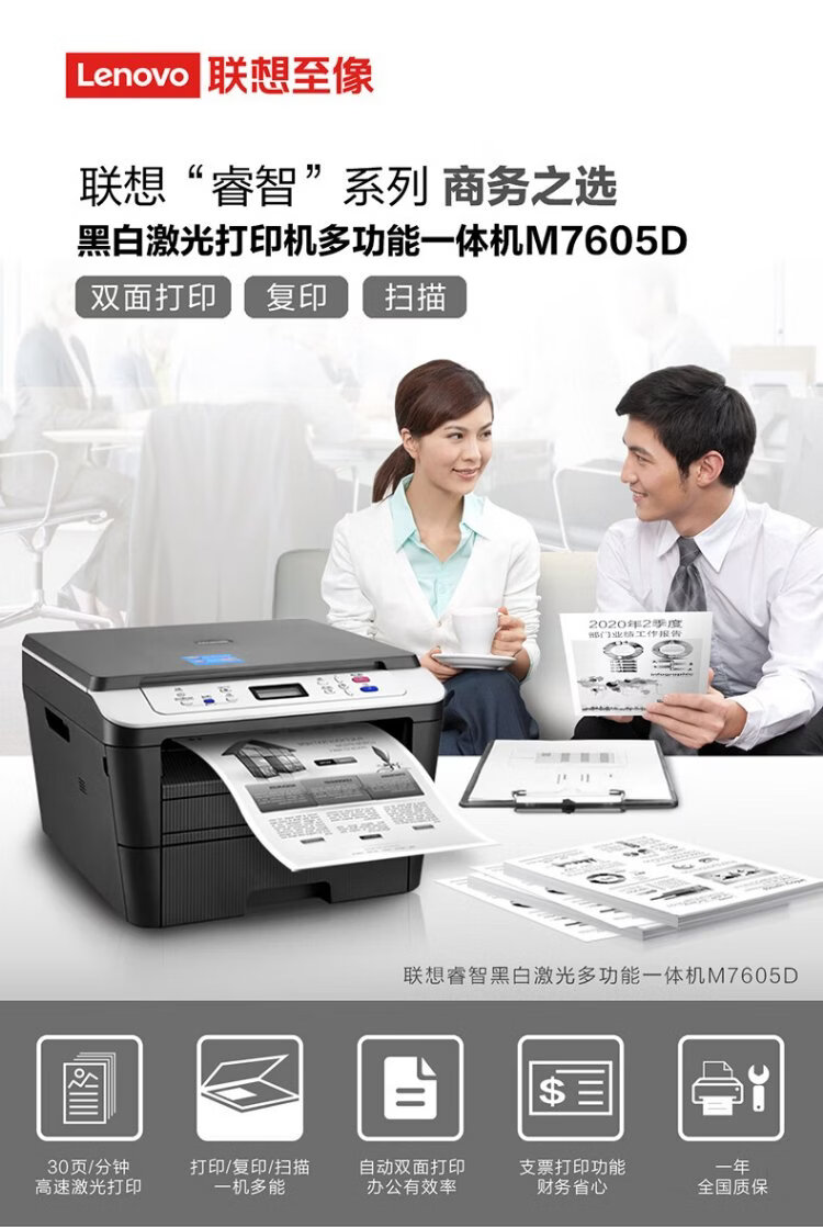 联想(Lenovo)至像M7605D黑白激光自动双面A4多功能打印机复印扫描一体机自动双面/三合一