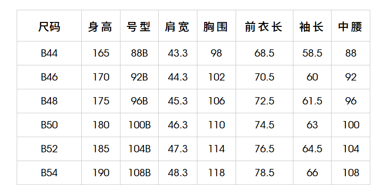 China (cm) 160-165/84-86 165-170 / 88-90 167-172 / 92-96 168-173 / 98-102 170-176 / 106-110