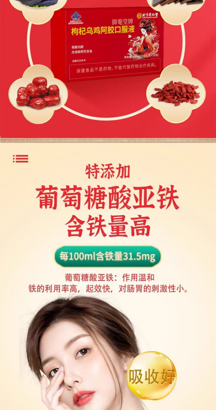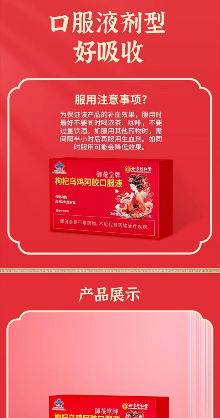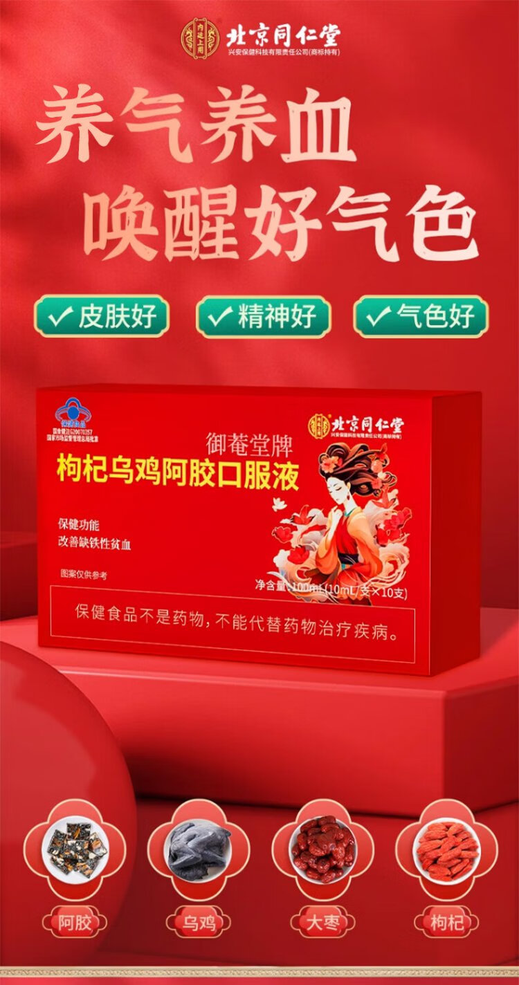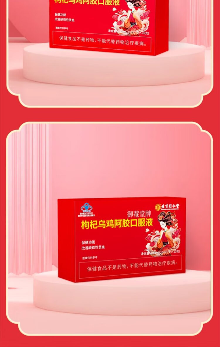 同仁堂枸杞乌鸡阿胶口服液10支装改善女性缺铁贫血失眠调理滋补送礼
