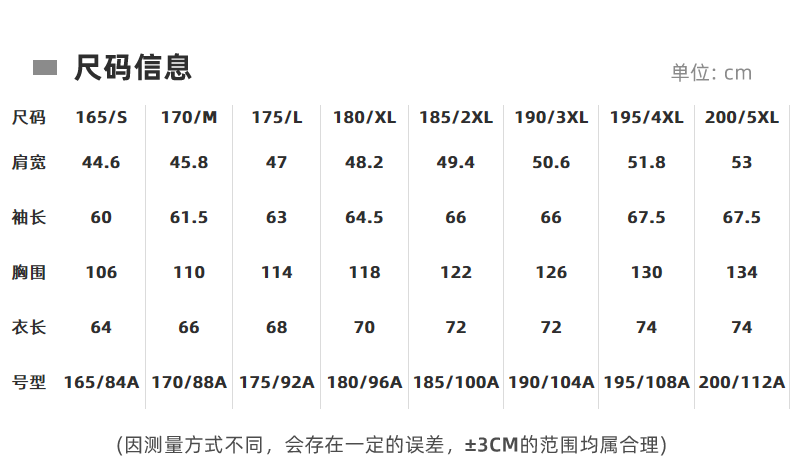 China (cm) 165 / 88-90 170 / 96-98 175 / 108-110 180 / 118-122 185 / 126-130