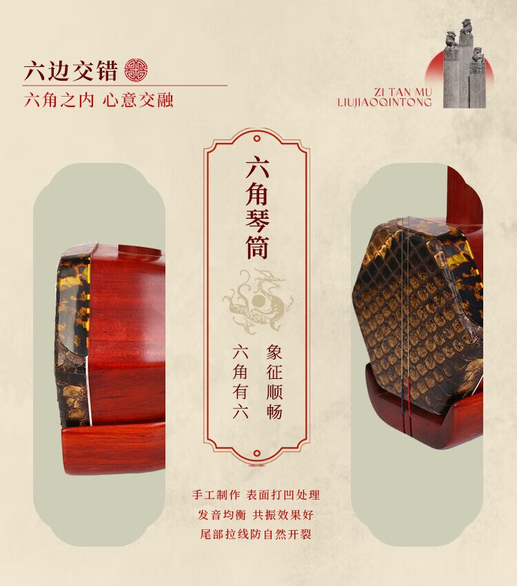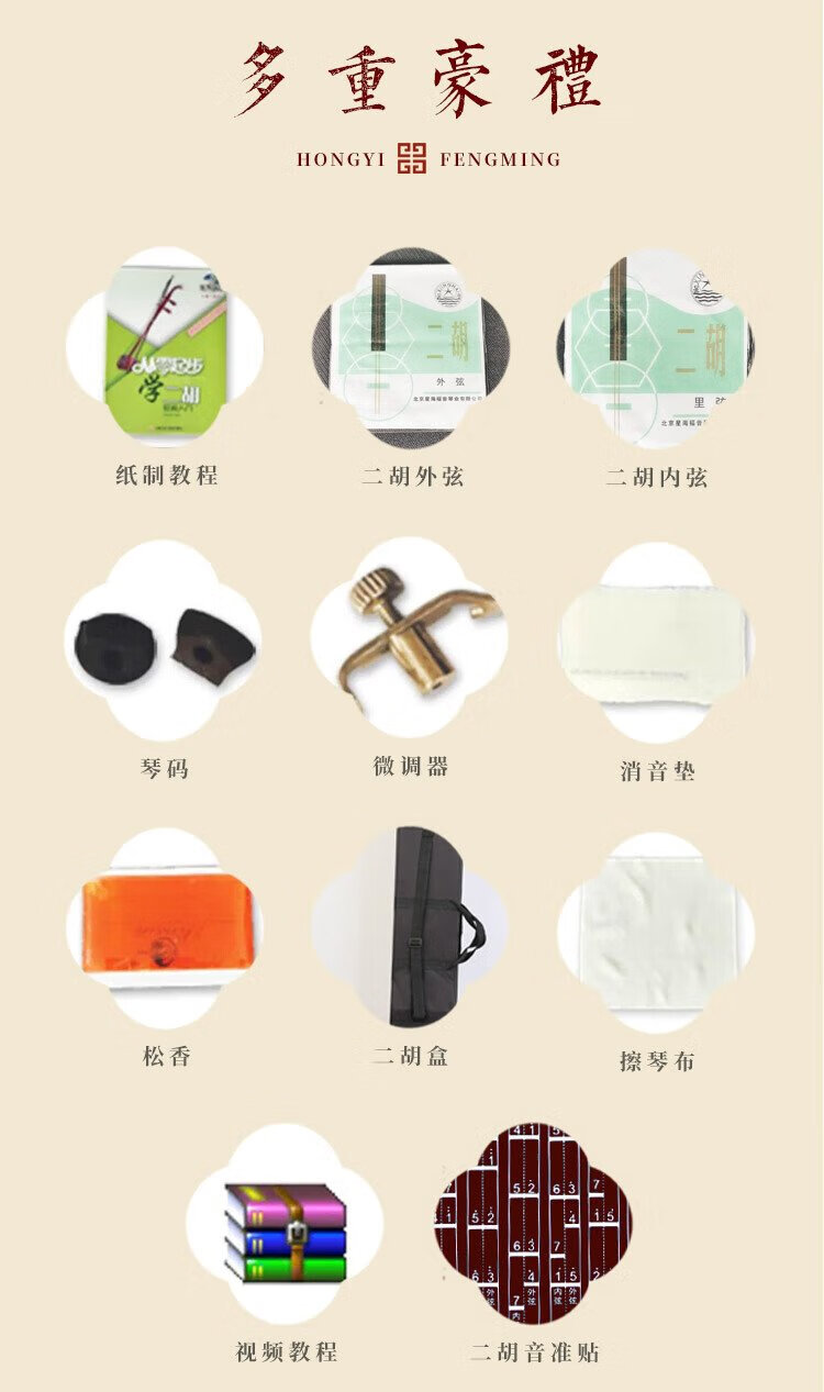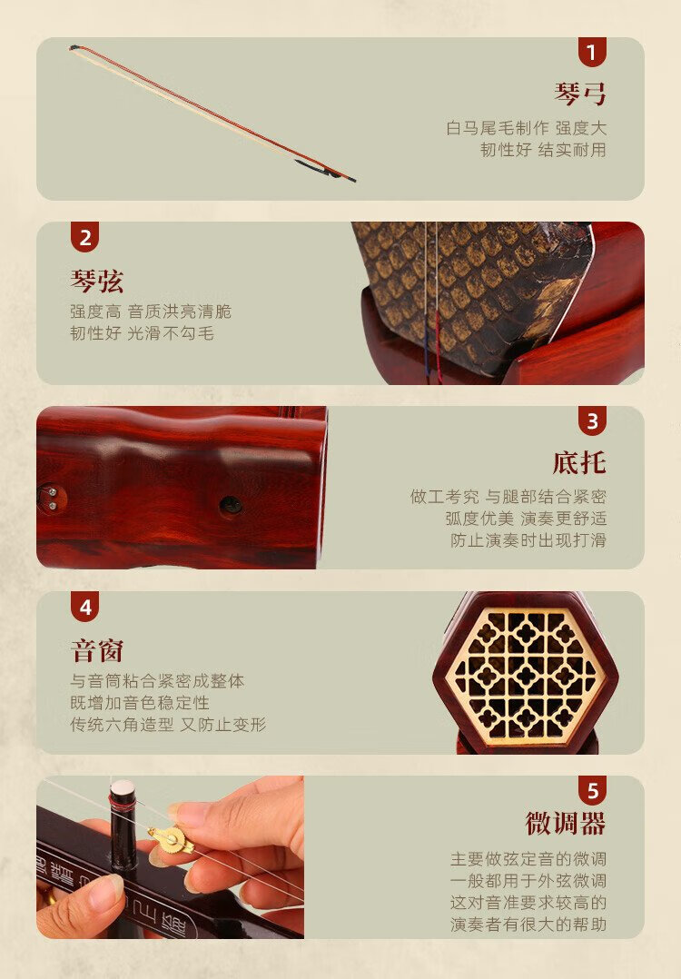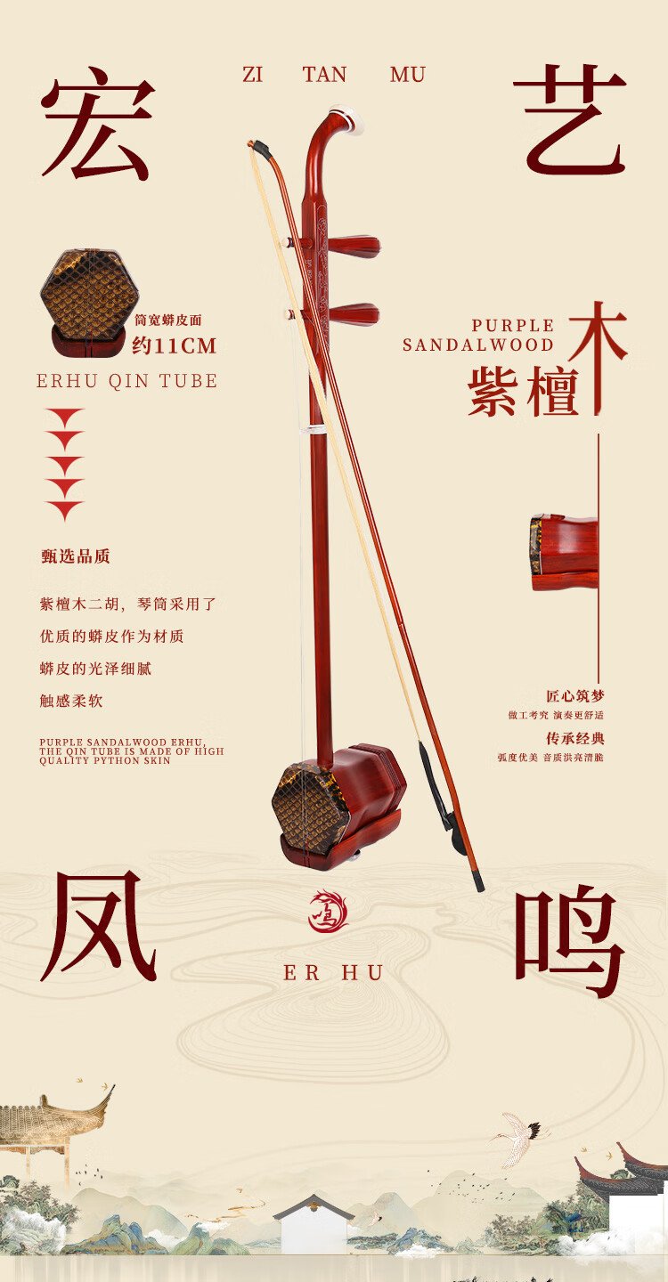 宏艺凤鸣(HongYiFengMing) 非洲紫檀木二胡 蟒皮六方二胡 考级成年人儿童通用民族管弦乐器
