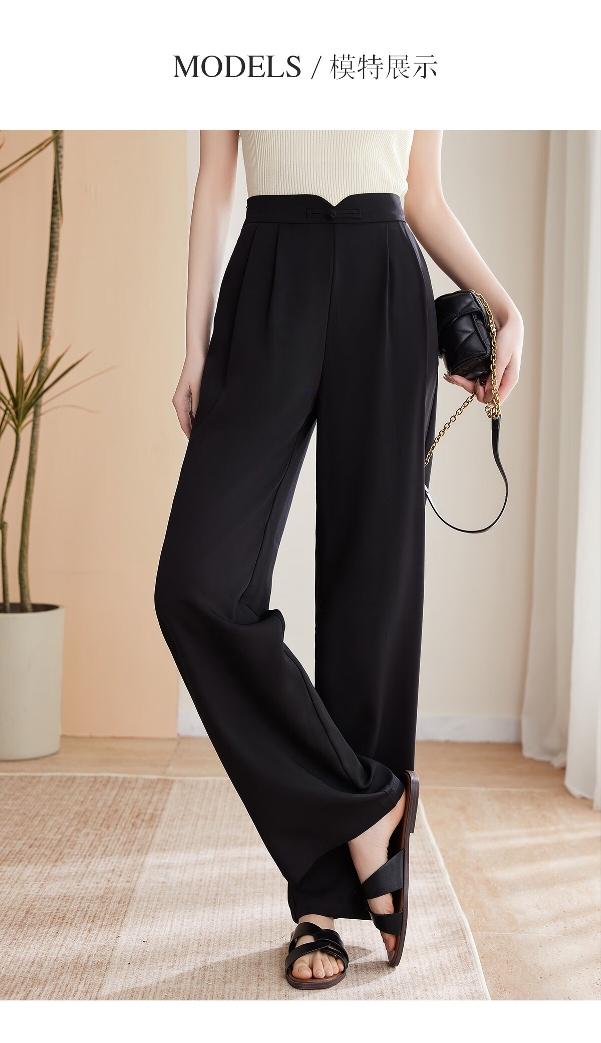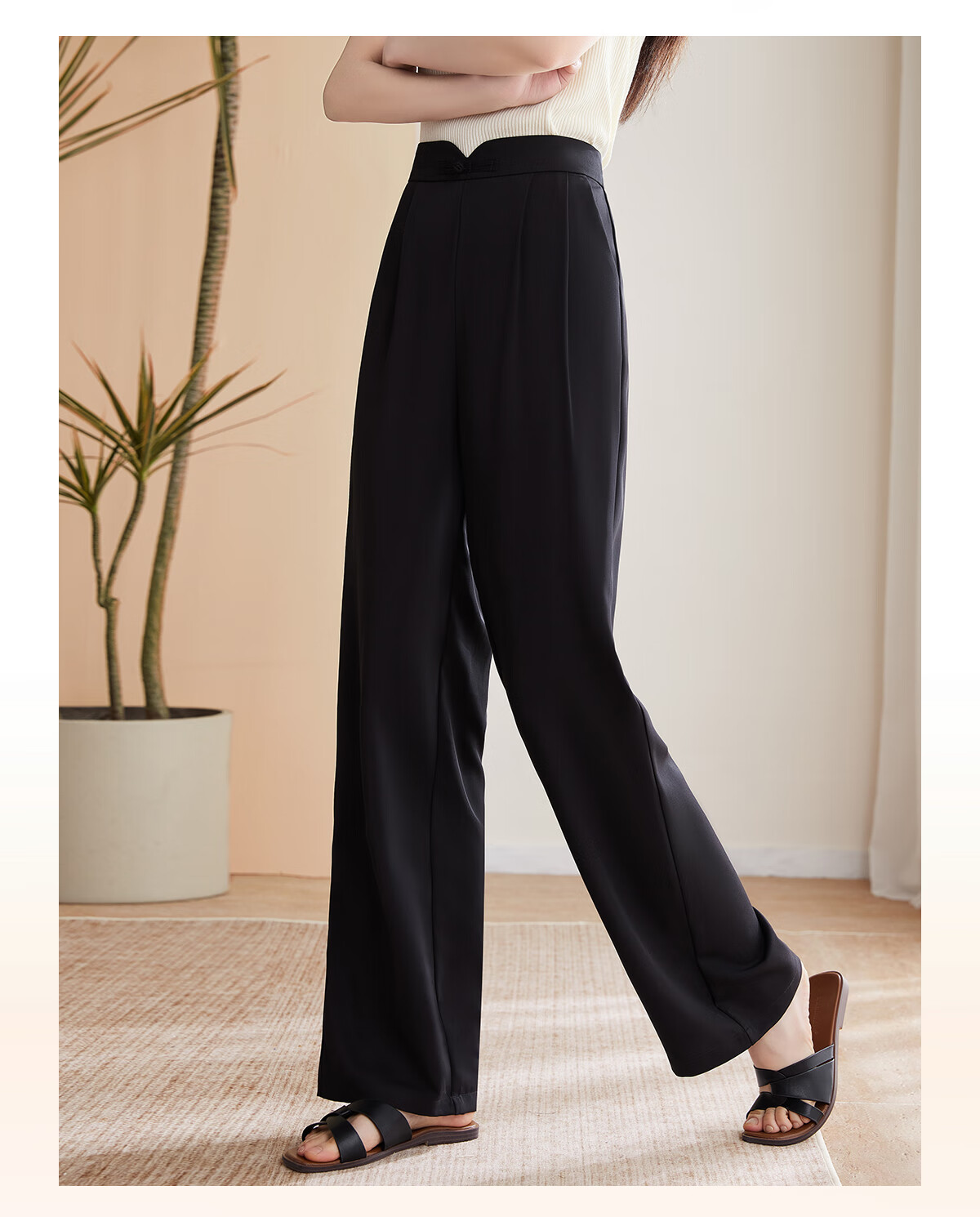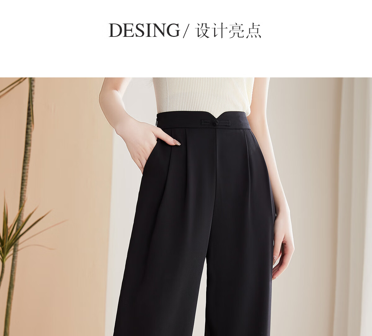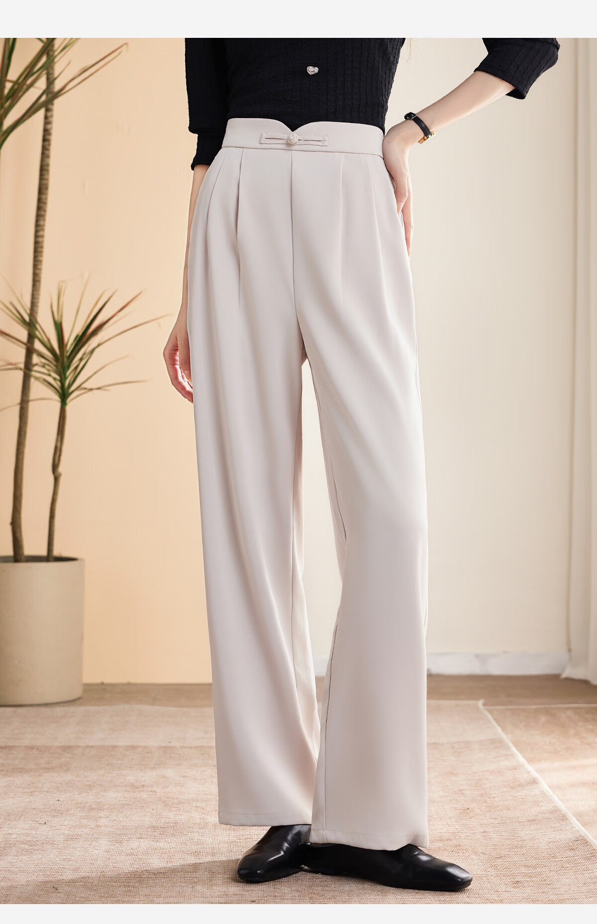 Le gustan los pantalones casuales para mujer, pantalones rectos con hebilla de estilo oriental simple y lujoso, pantalones de pierna ancha con drapeado fino para mujer T144K6623