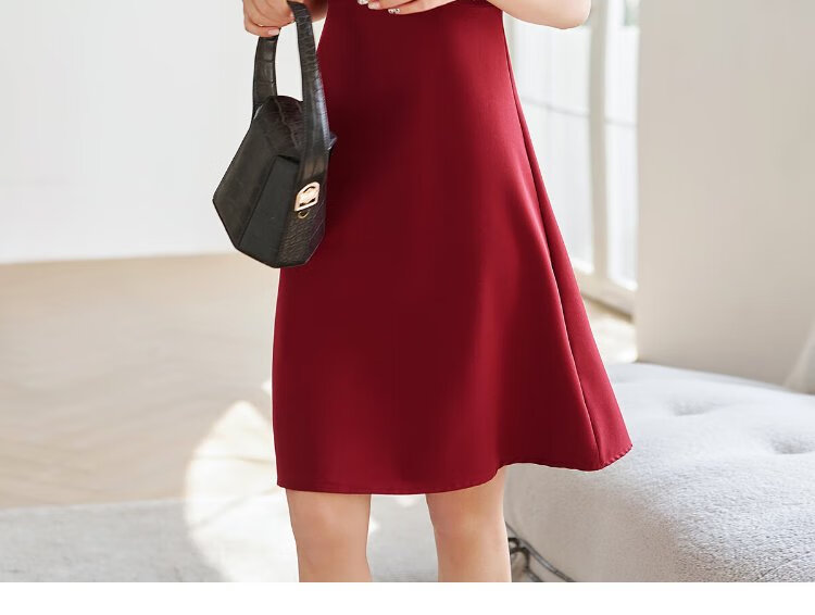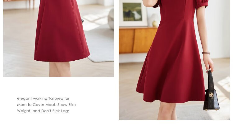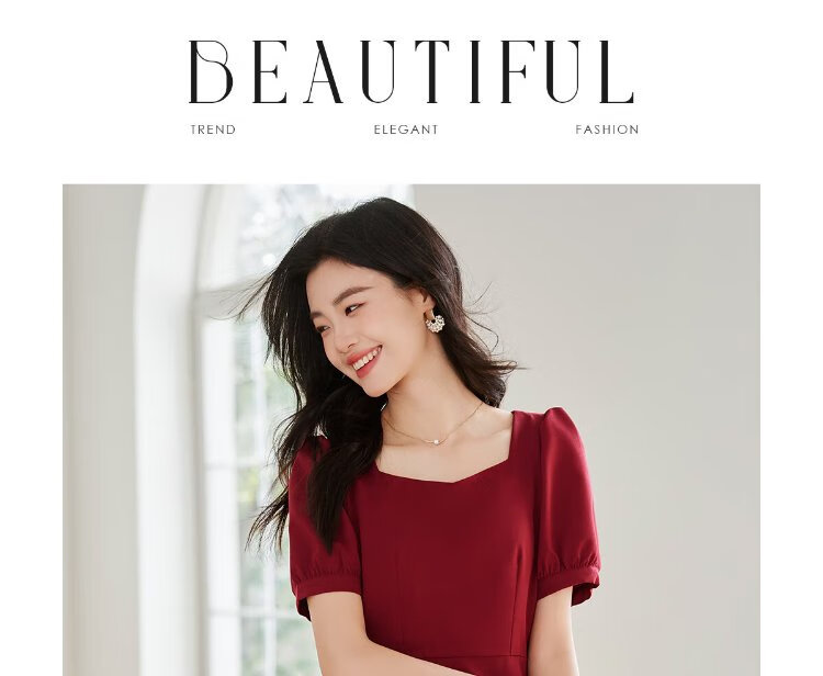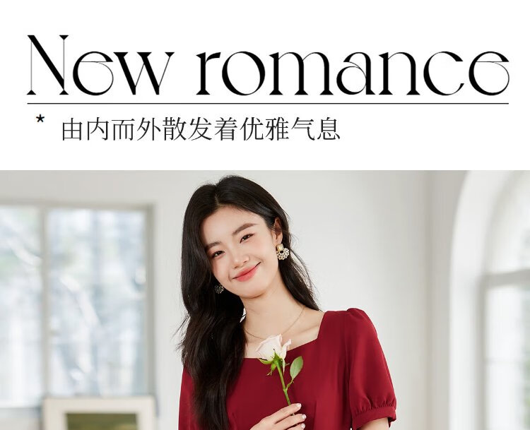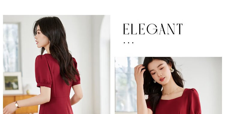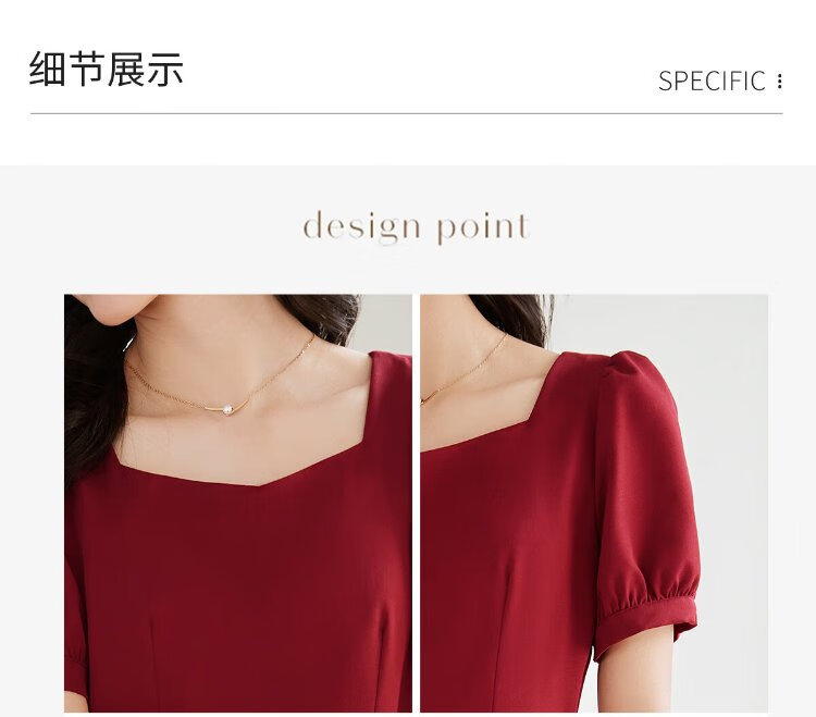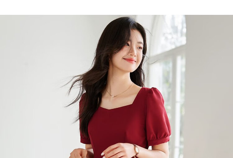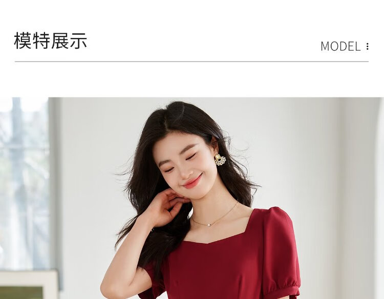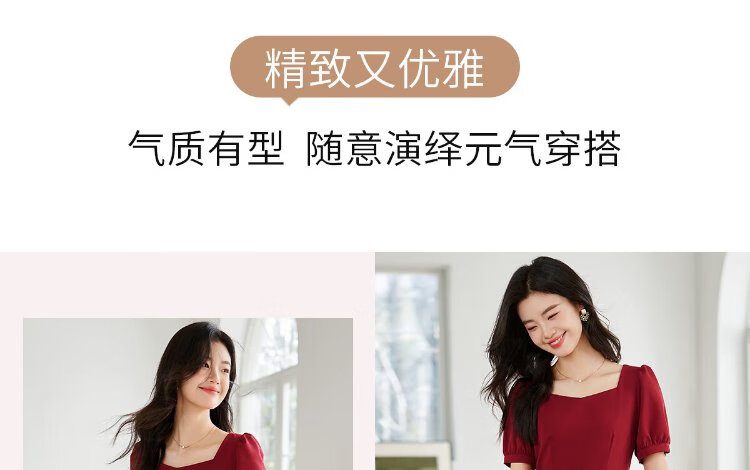 她享短袖连衣裙女方领赫本风小个子高级感时尚红色礼服裙子T143Q1426