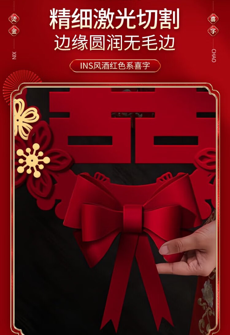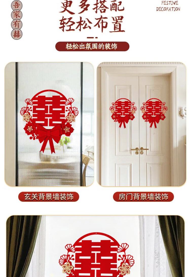 迪普尔喜字贴结婚用品婚房布置装饰窗户婚礼大门卧室房门门贴蝴蝶结囍字
