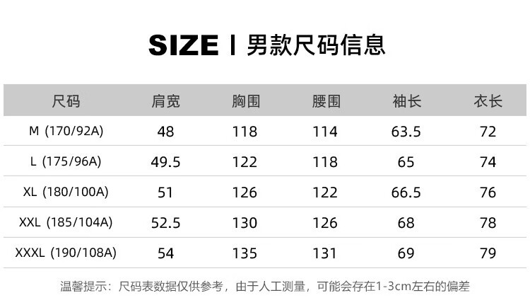 China (cm) 165 / 88-90 170 / 96-98 175 / 108-110 180 / 118-122 185 / 126-130