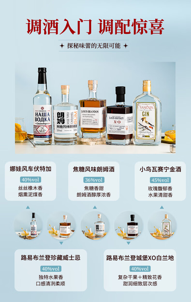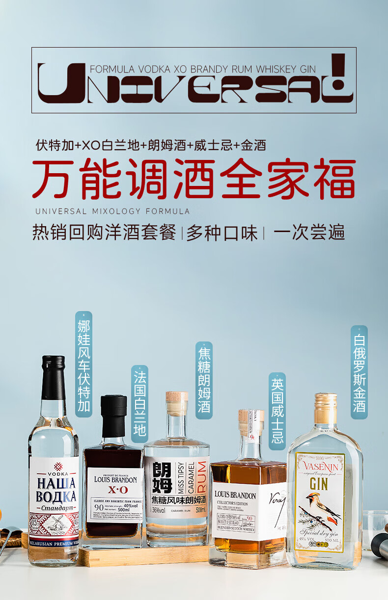 Galampas whiskey, brandy, rum, gin, vodka, 5 bottles of bartending base liquor, five-pack