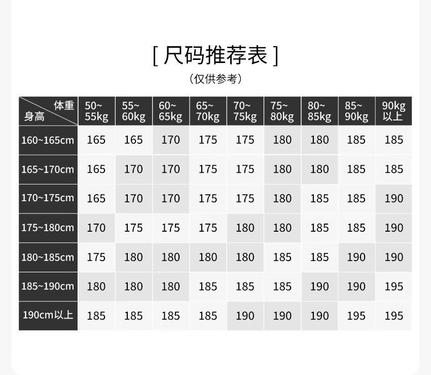 China (cm) 165 / 88-90 170 / 96-98 175 / 108-110 180 / 118-122 185 / 126-130