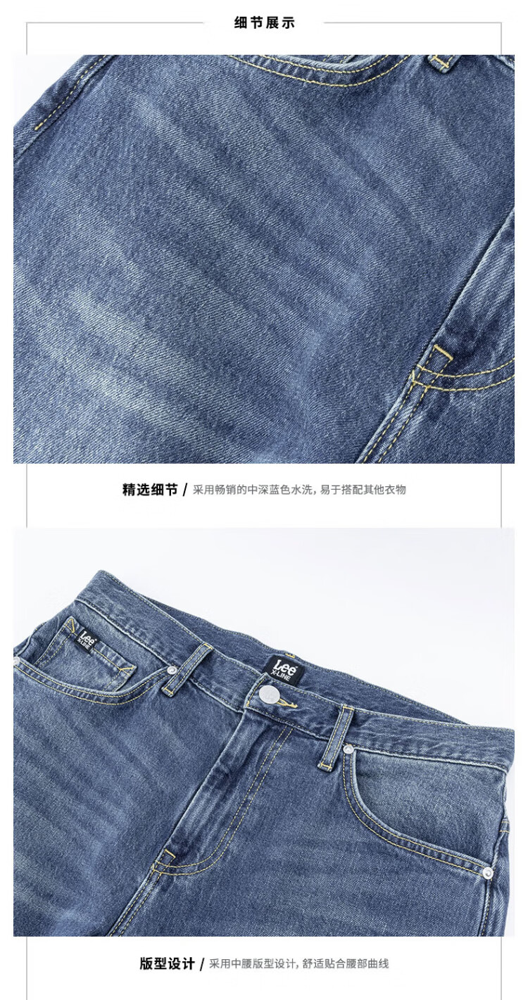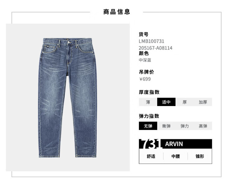 Lee25新品五袋款设计731舒适锥形牛仔裤中深蓝男 中深蓝 33尺码偏大