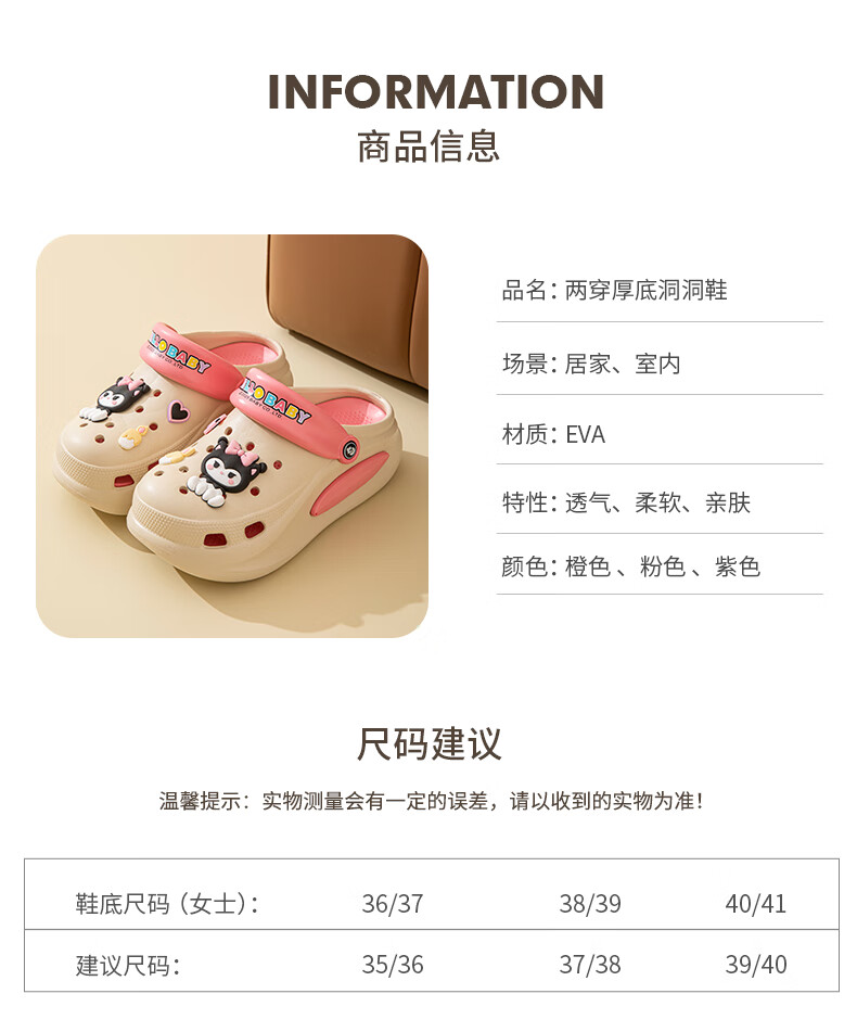 俞兆林(YUZHAOLIN)洞洞鞋女三丽鸥正版授权厚底增高外穿拖鞋 YE684 紫色 35/36