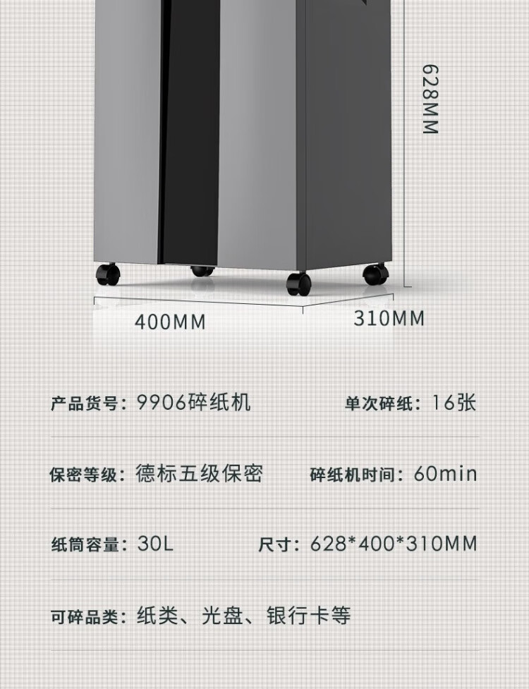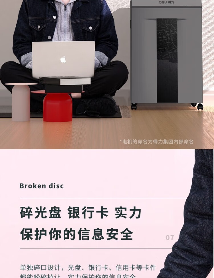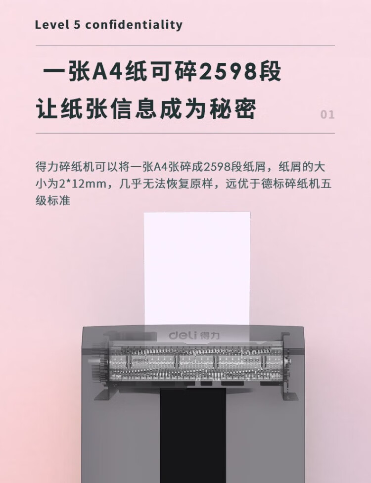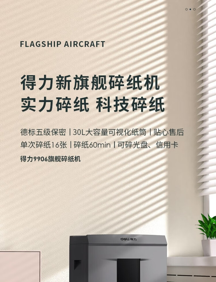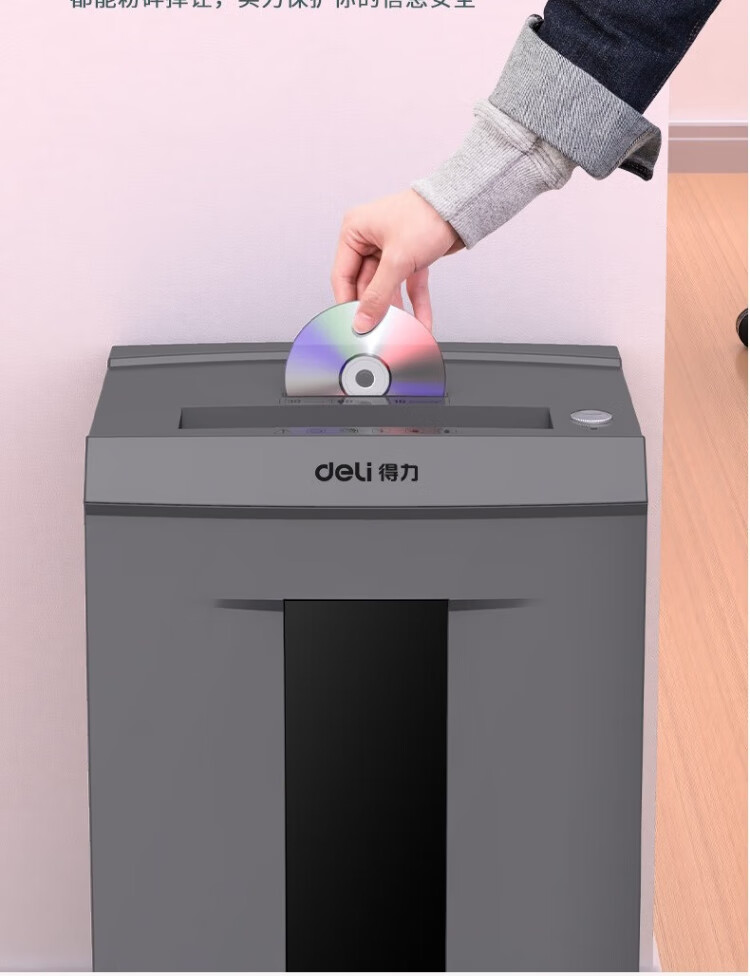 得力(deli)碎纸机 5级保密商务办公家用粉碎机 碎cd卡片单次16张 30L可视容量 连碎60分钟9906