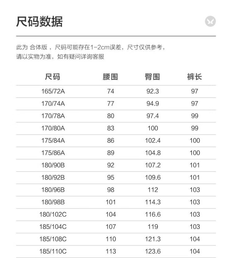 China (cm) 160-165/84-86 165-170 / 88-90 167-172 / 92-96 168-173 / 98-102 170-176 / 106-110