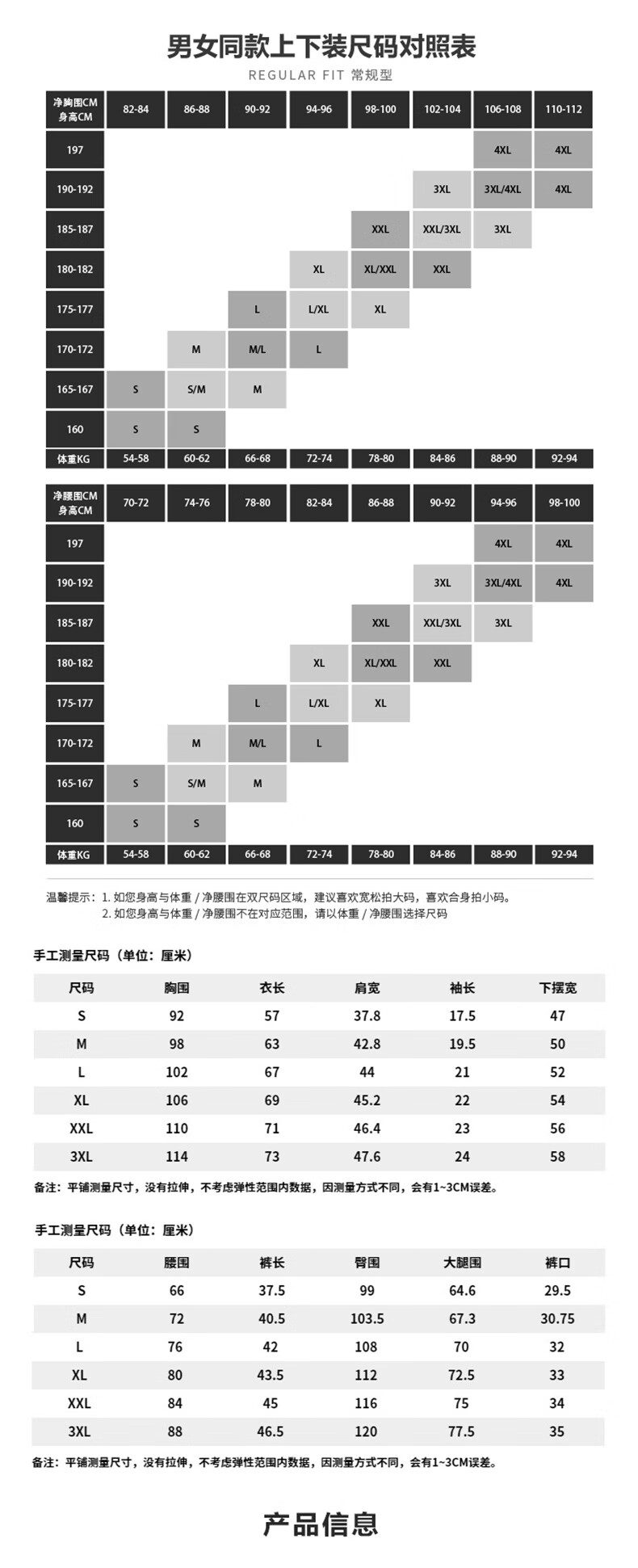 China (cm) 160-165/84-86 165-170 / 88-90 167-172 / 92-96 168-173 / 98-102 170-176 / 106-110
