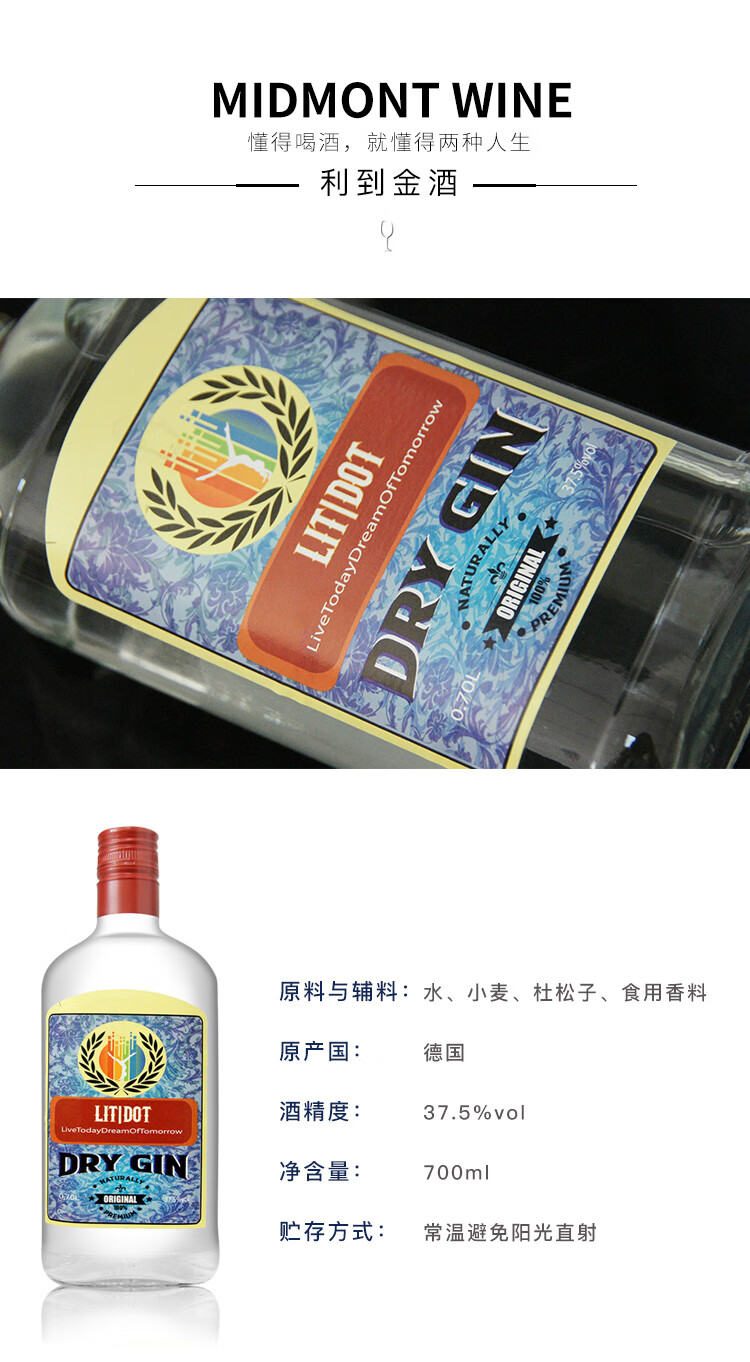 利到金酒 LITDOT DRY GIN 杜松子酒琴酒毡酒 德国原装进口 调酒金汤力 金酒 700毫升