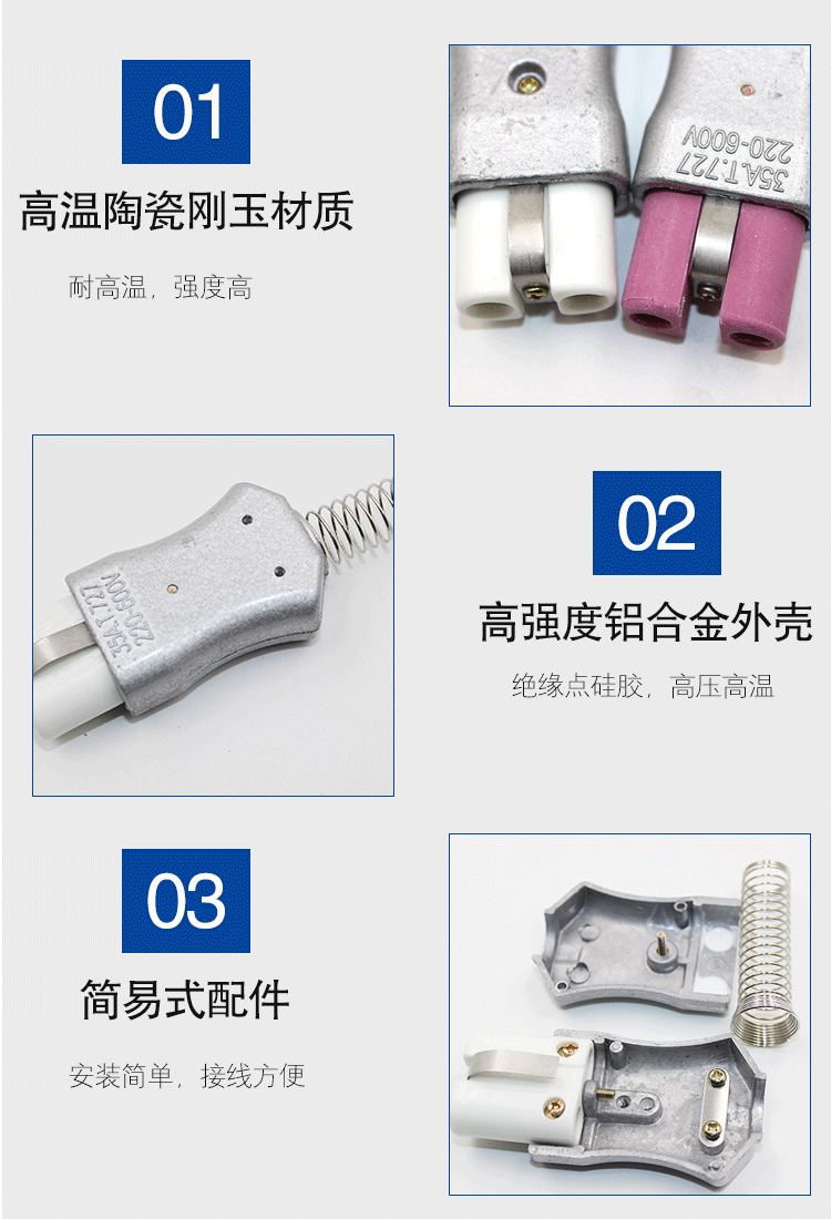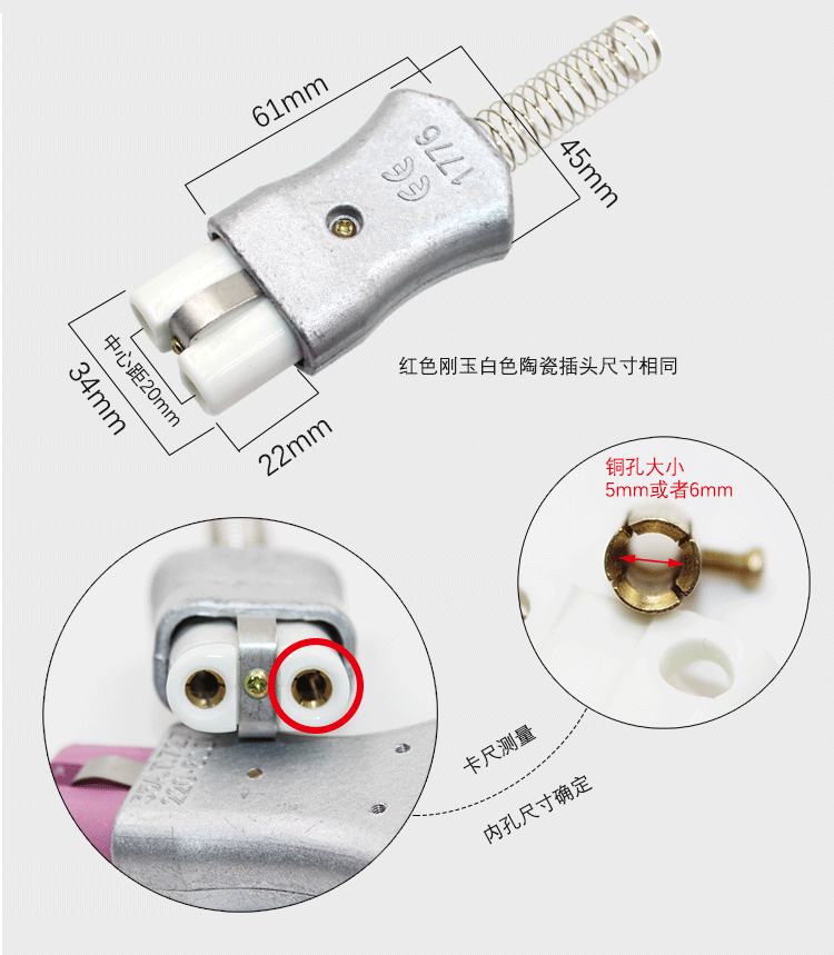 赞璐桐T727铝合金高温插头 35A加热圈陶瓷电炉插头 工业耐高温插头插座 白色陶瓷插孔6mm
