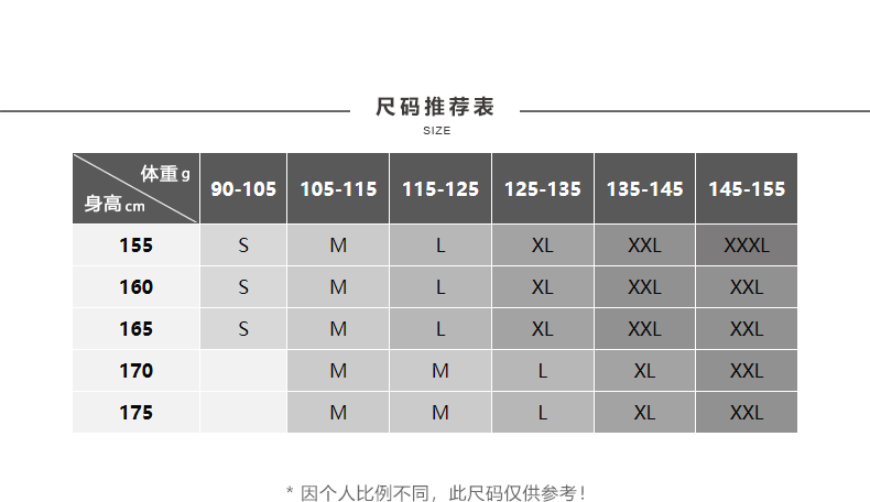 China (cm) 160-165/84-86 165-170 / 88-90 167-172 / 92-96 168-173 / 98-102 170-176 / 106-110