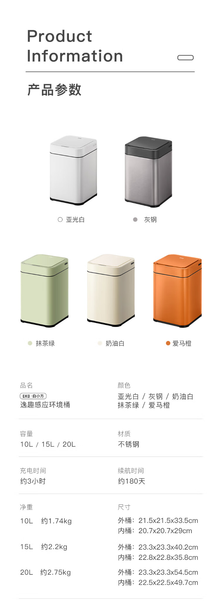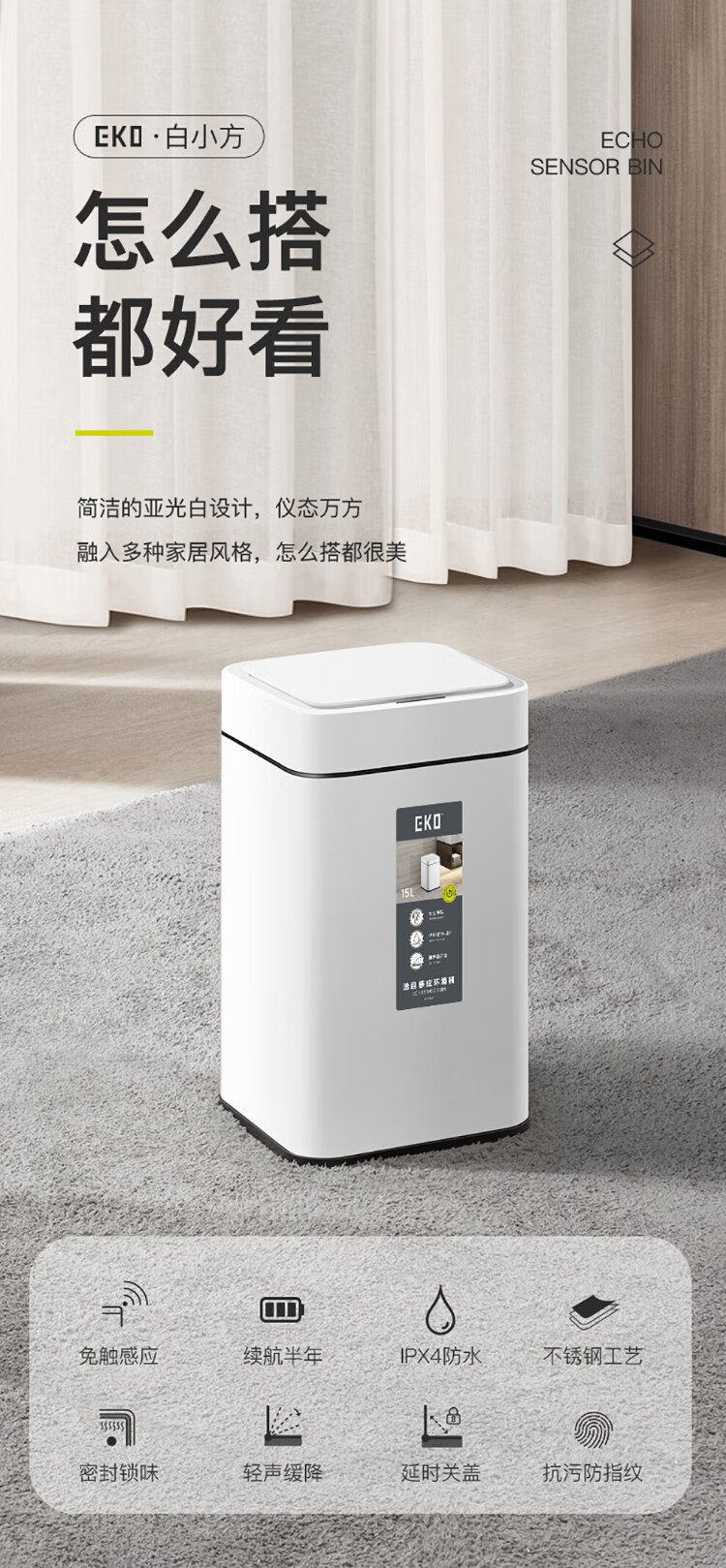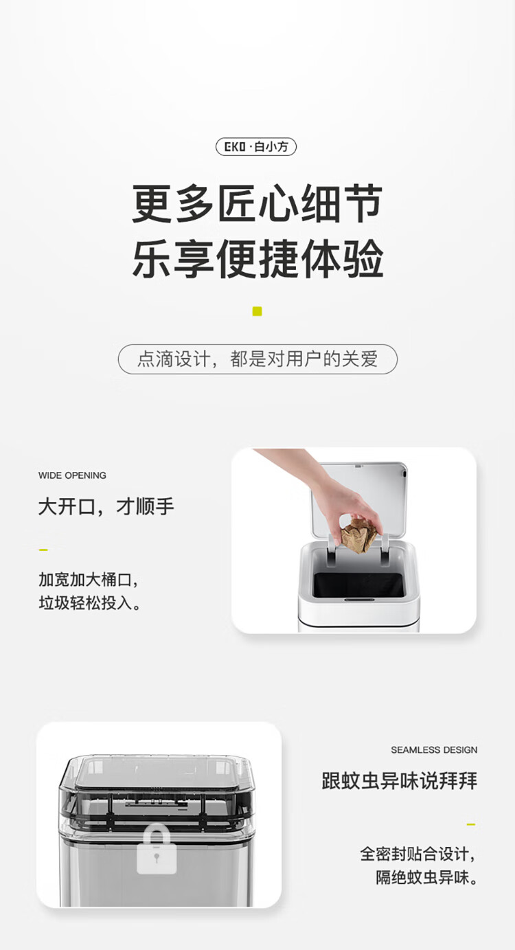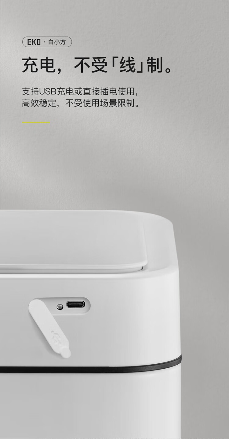EKO张若昀推荐 智能垃圾桶自动感应夹缝大号 客厅卫生间厨房 9208-10L灰钢【锂电池款】