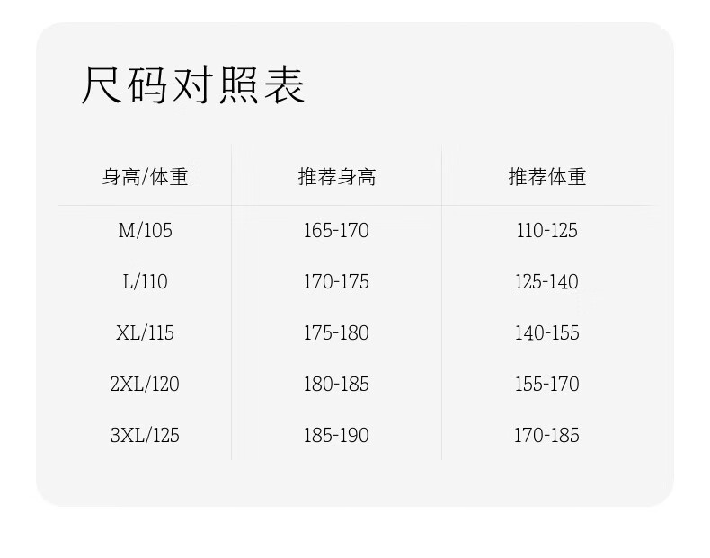 China (cm) 165 / 88-90 170 / 96-98 175 / 108-110 180 / 118-122 185 / 126-130