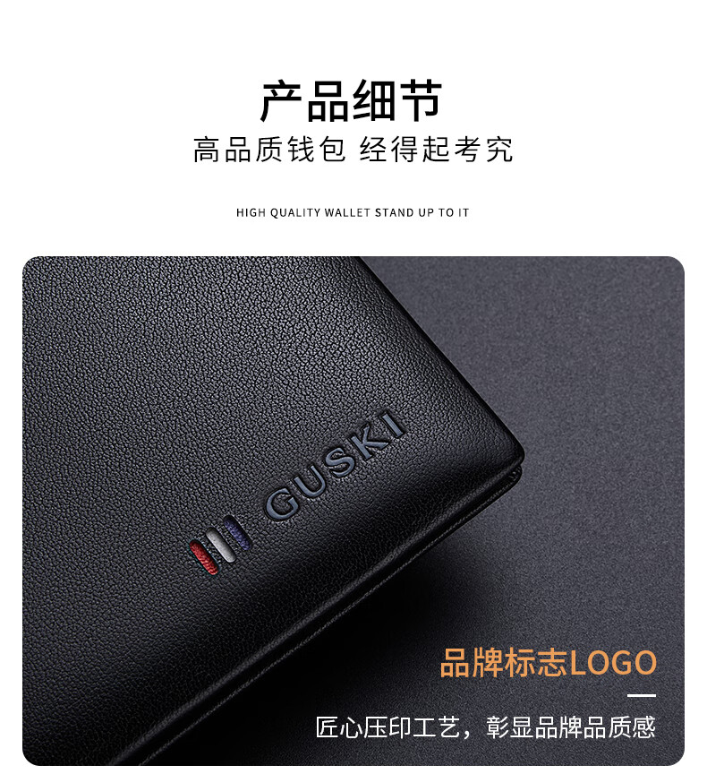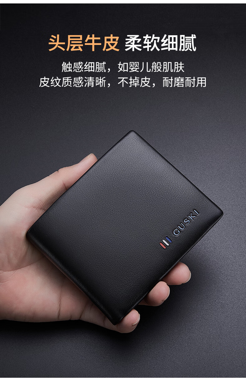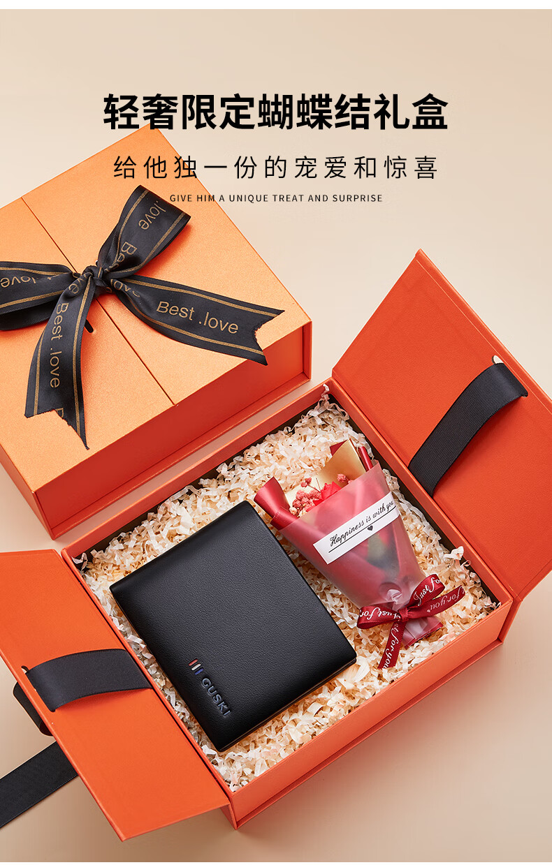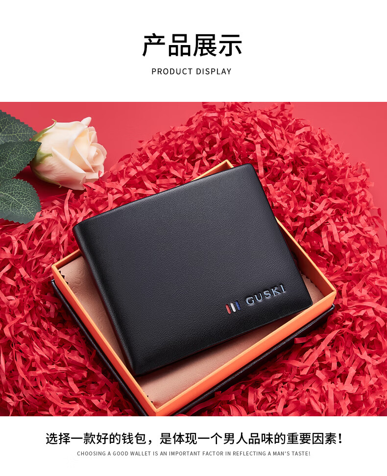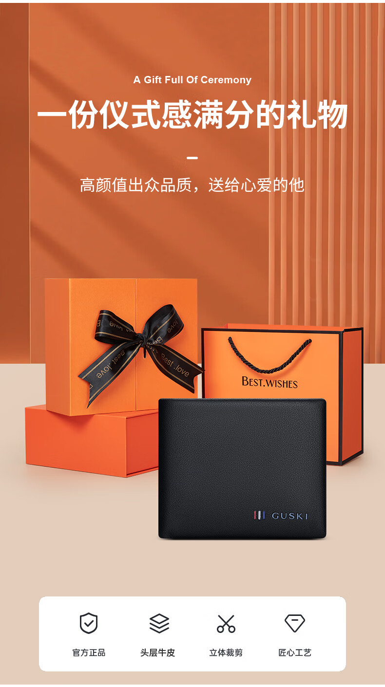 GUSKI brand men's wallet, men's genuine leather short style, high-end leather jacket, first-layer cowhide card bag gift box, birthday gift, Qiji red, orange heart, exclusive for you, fashionable short style