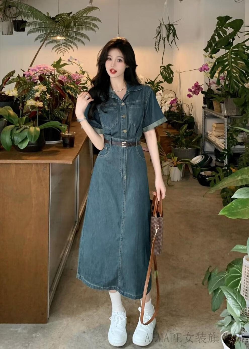 AEMAPE牛仔连衣裙女2025夏季新款小众设计高级感气质港味复古长裙子女装 MX-1-3201_复古蓝 XL
