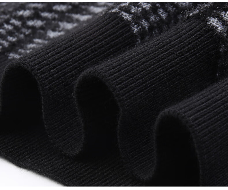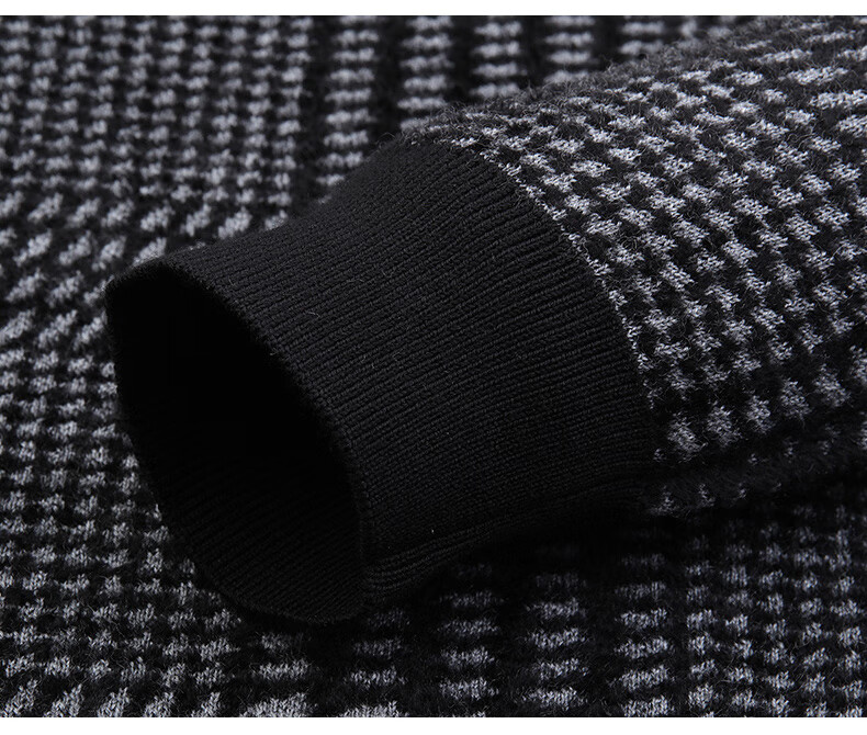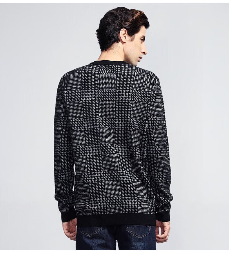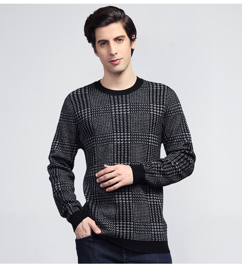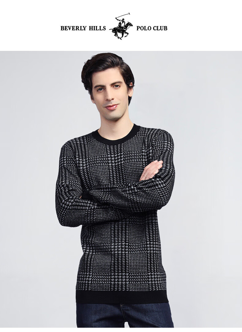 比华利保罗秋冬新款套头羊毛衫男休闲保暖方格纹男士圆领毛衣 黑色 S
