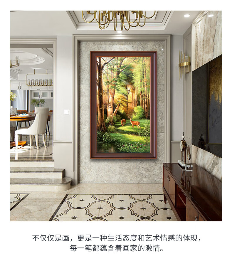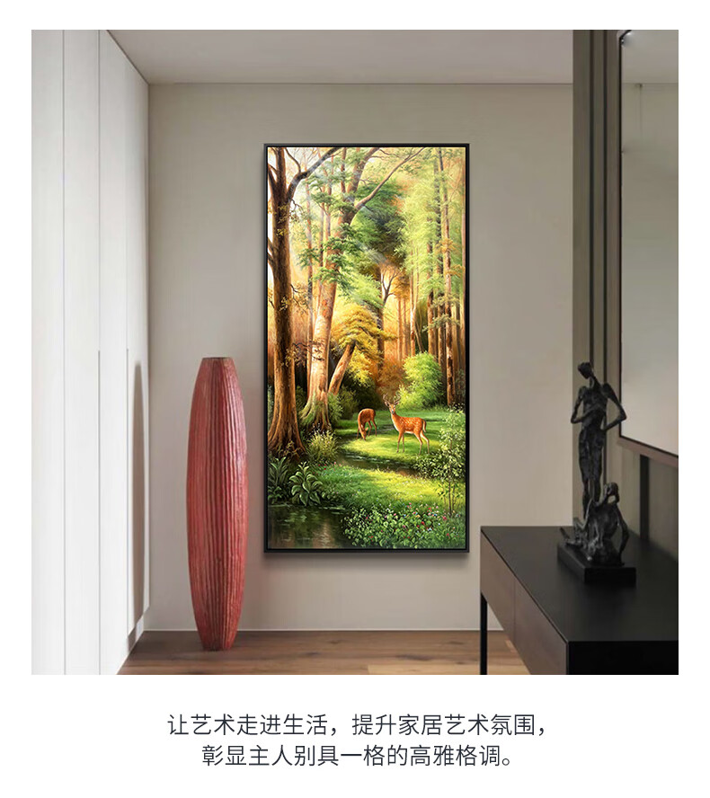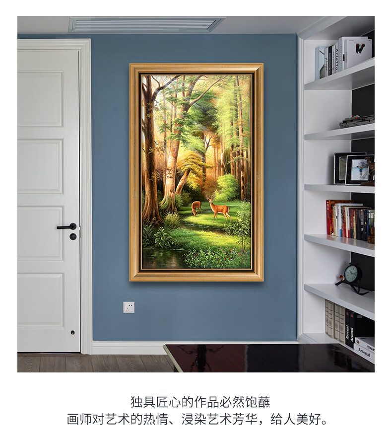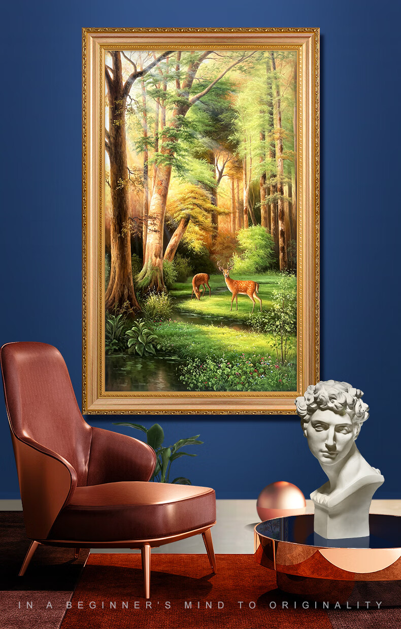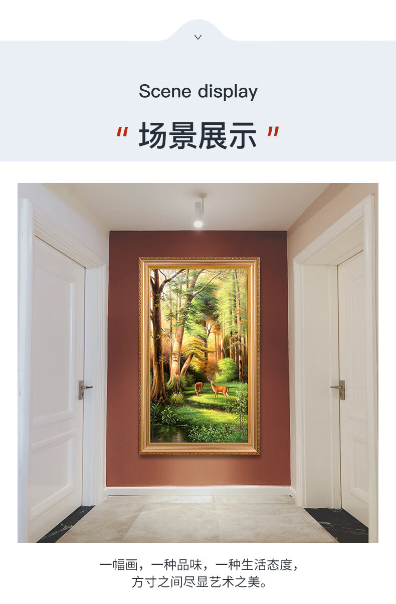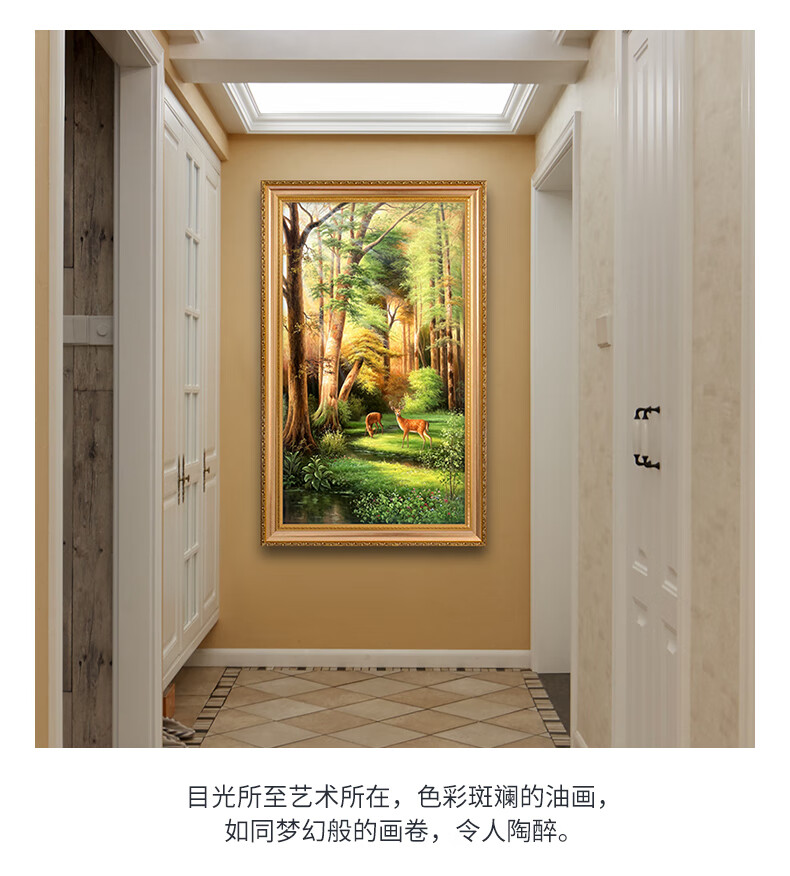 帝旗 高端原创手绘麋鹿风景油画欧式入户玄关装饰画走廊过道挂画竖版 692金实木框 80X160