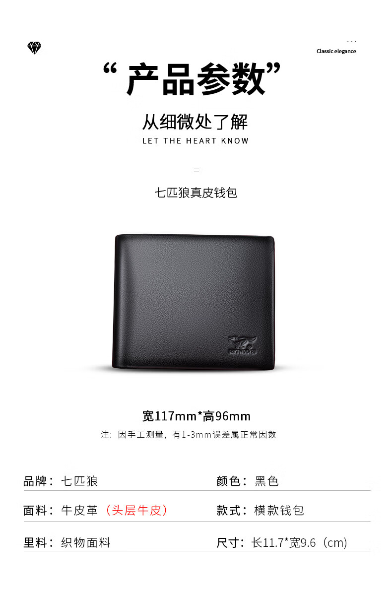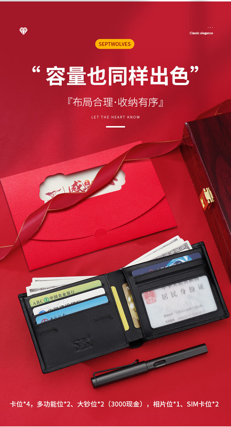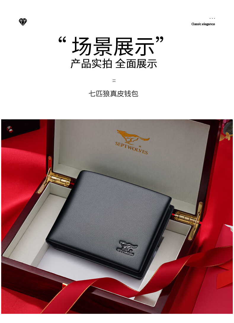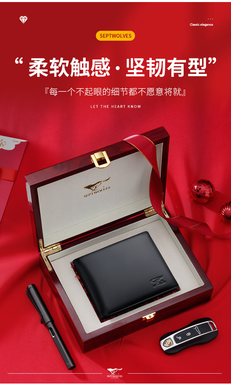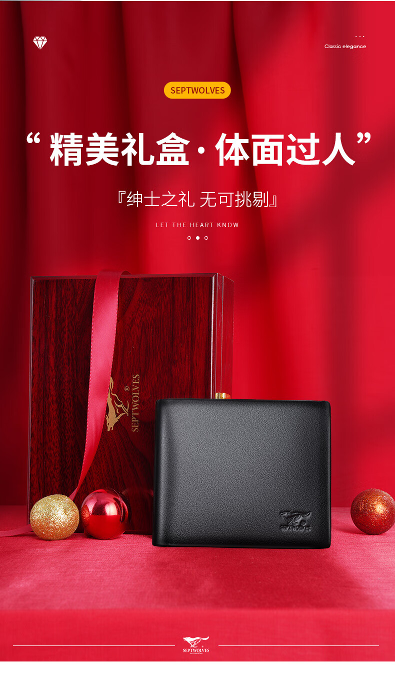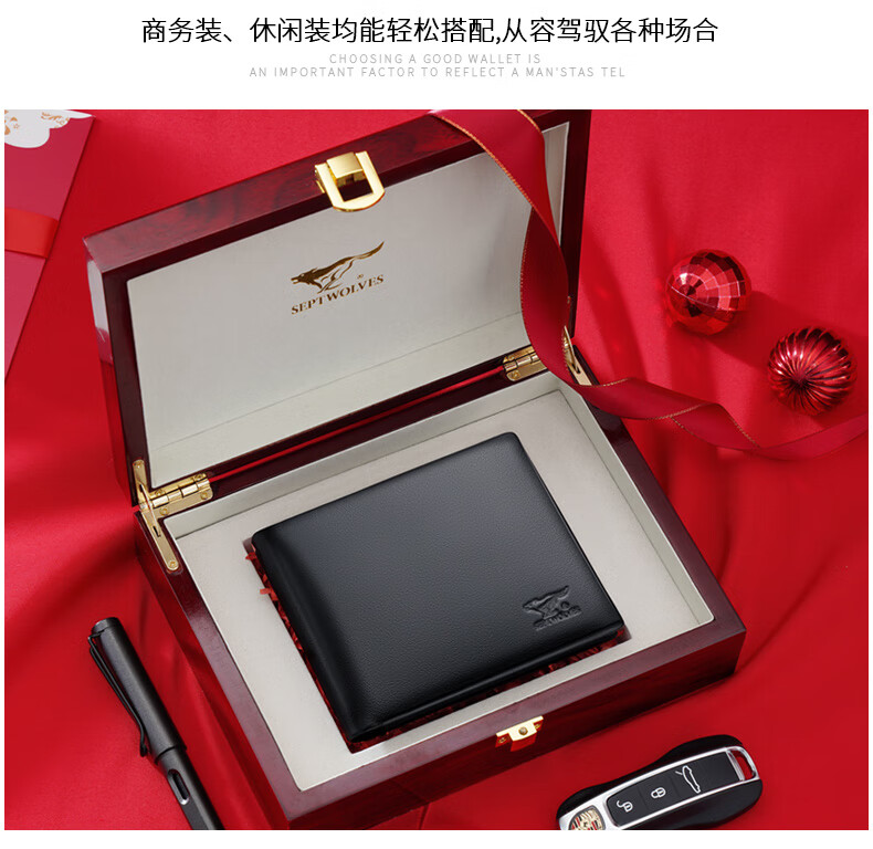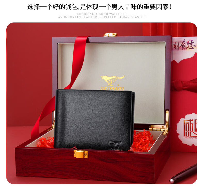 七匹狼(SEPTWOLVES)男士钱包男短款真皮钱夹商务休闲卡包实用生日礼物送男友老公老公 黑色款【 红色木礼盒套装】