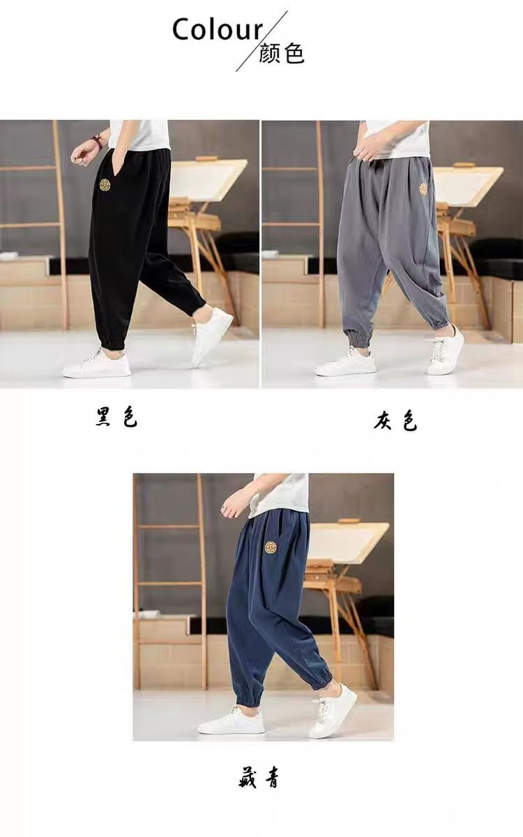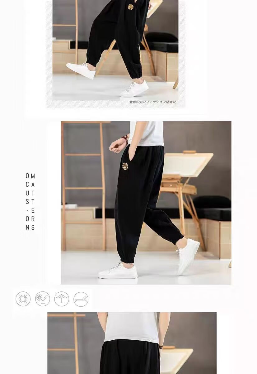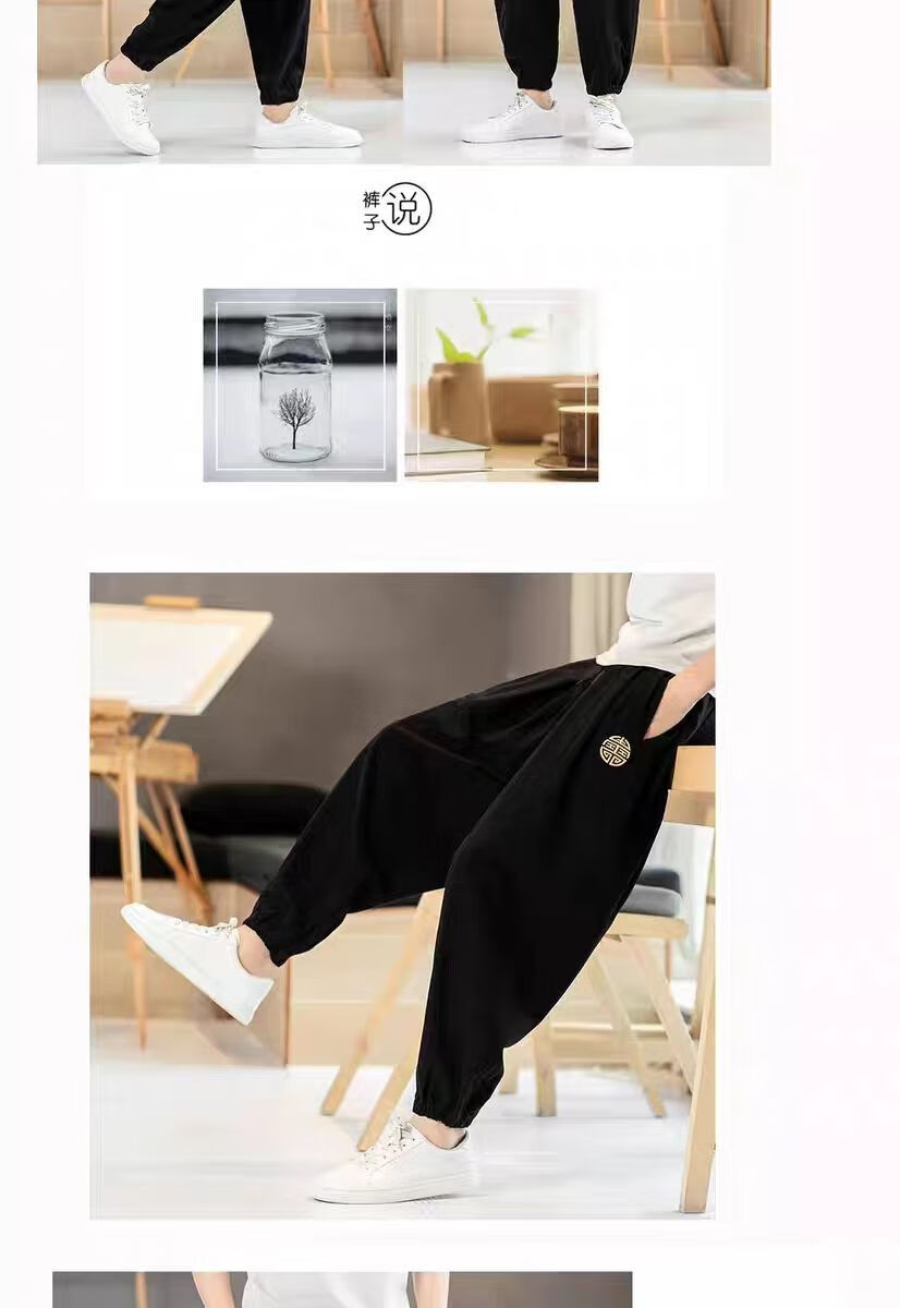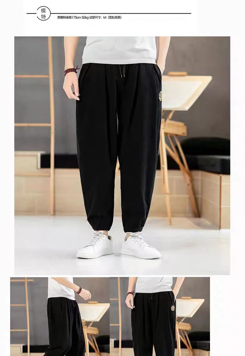 皮尔卡丹(pierre cardin)灯笼裤男宽松中国风休闲九分裤夏季薄款刺绣束脚裤棉麻针织 黑色 2XL 145斤-160斤