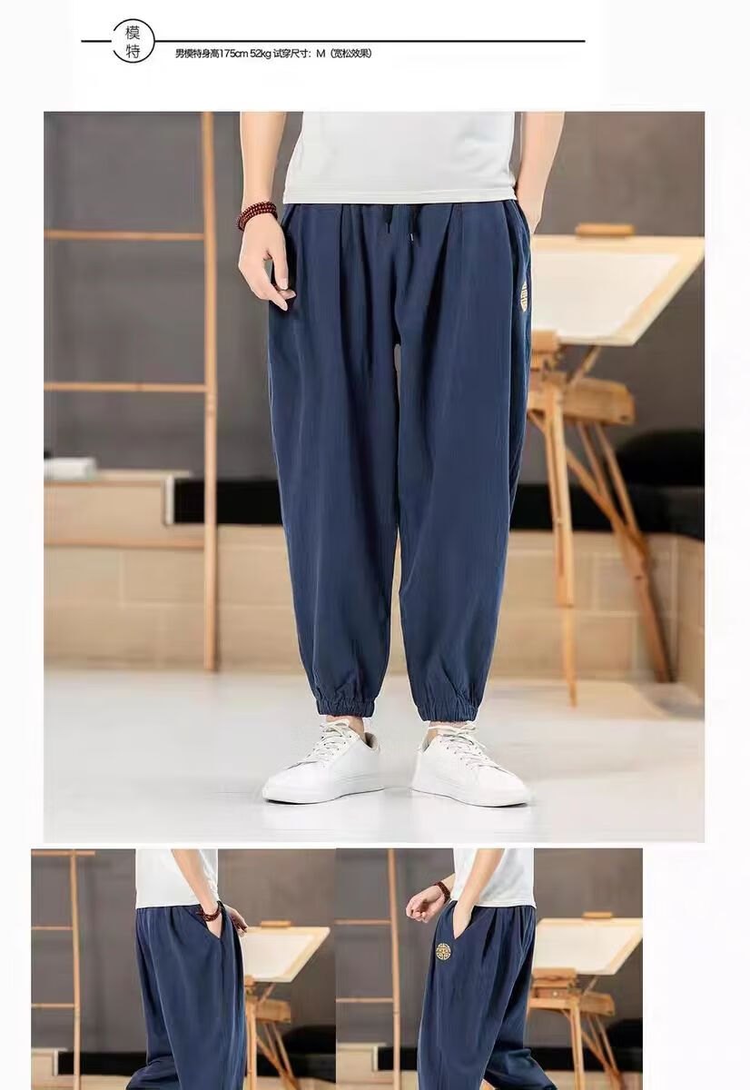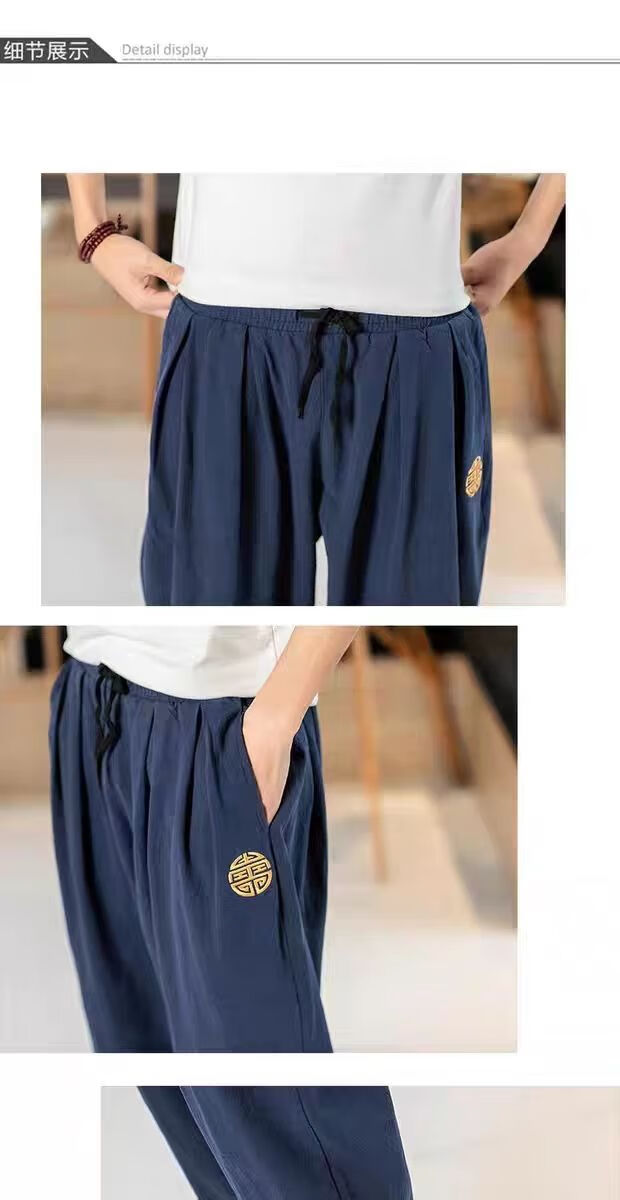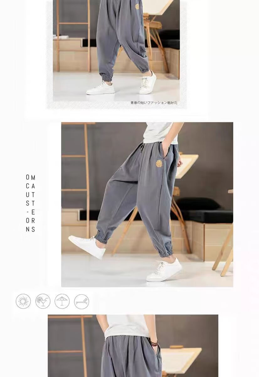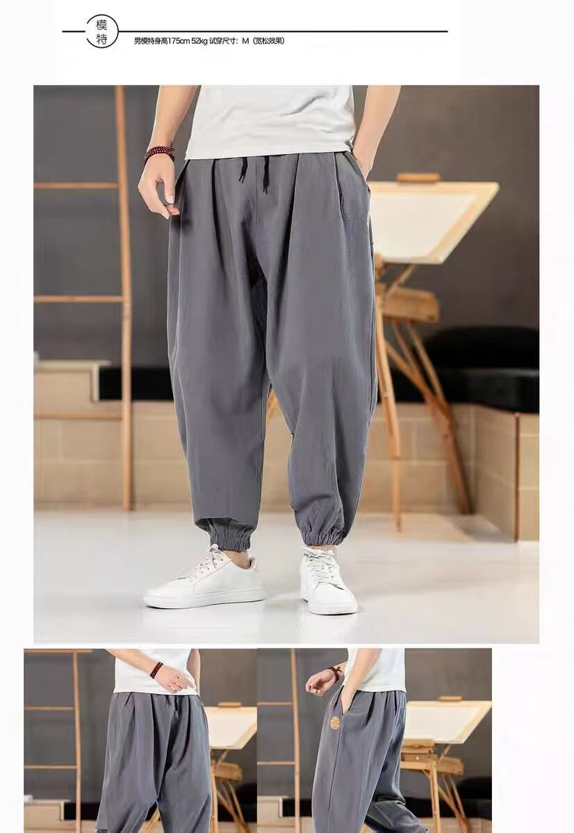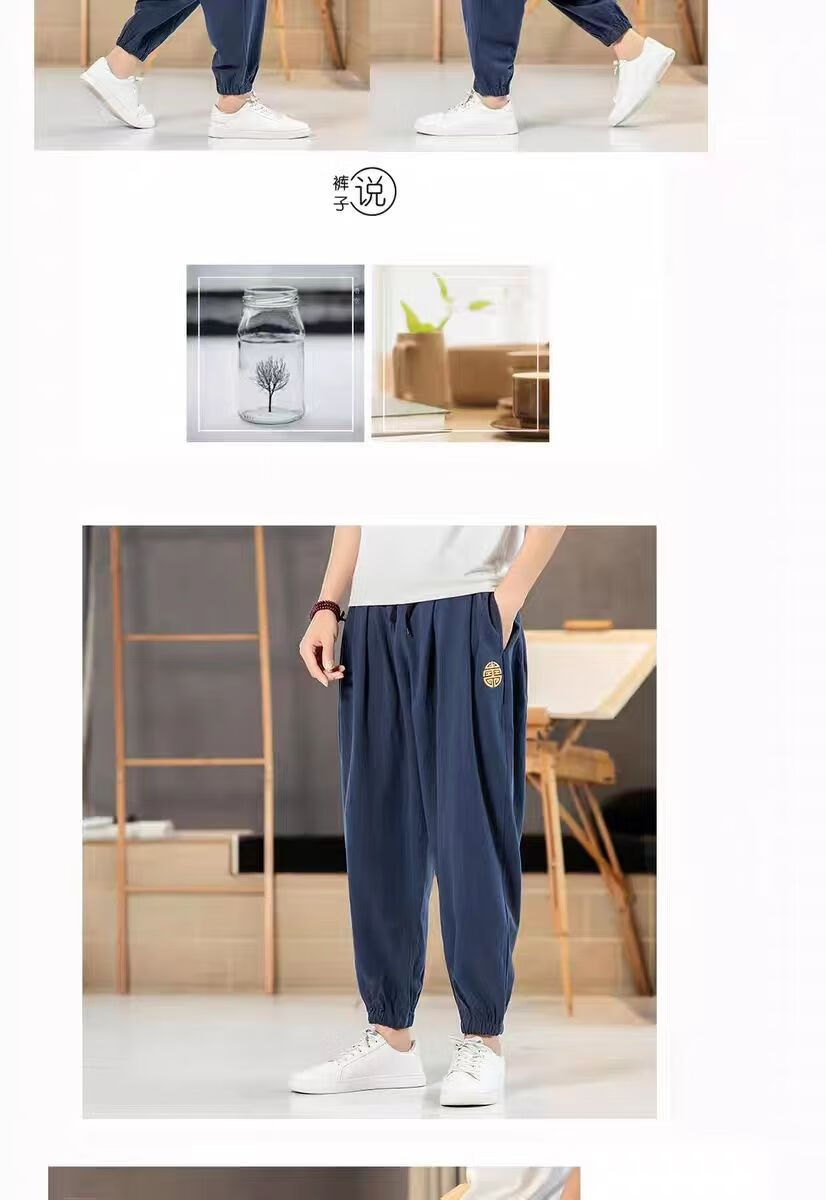 皮尔卡丹(pierre cardin)灯笼裤男宽松中国风休闲九分裤夏季薄款刺绣束脚裤棉麻针织 黑色 2XL 145斤-160斤
