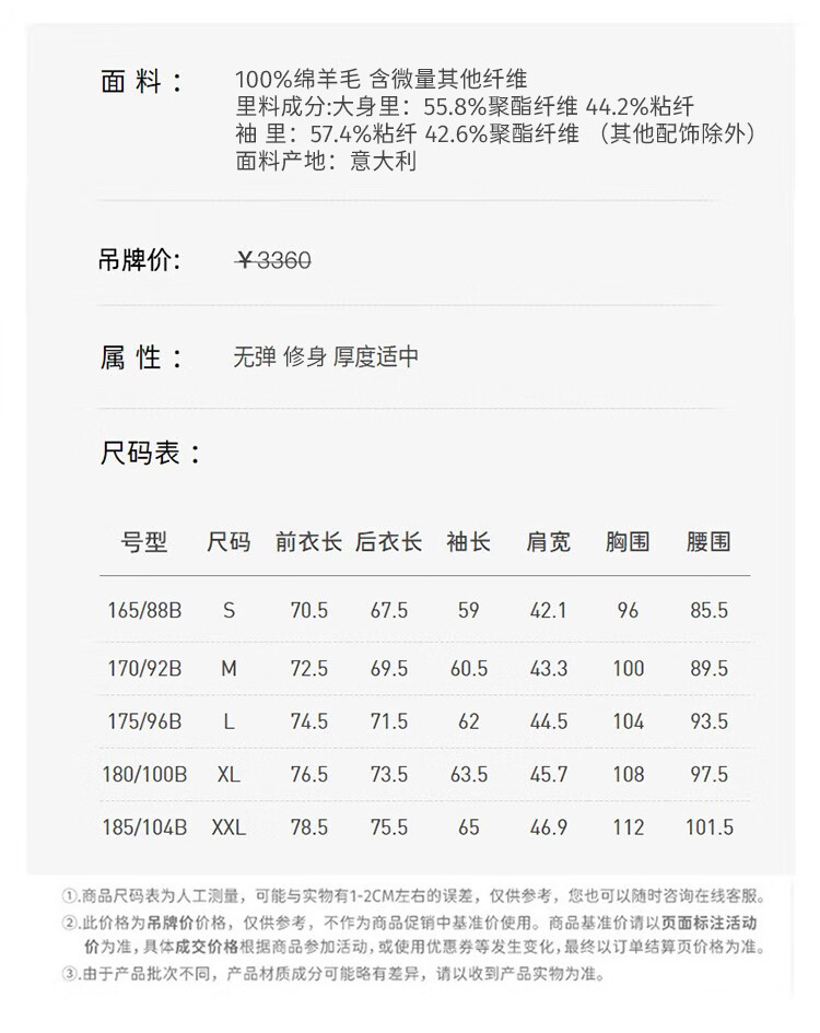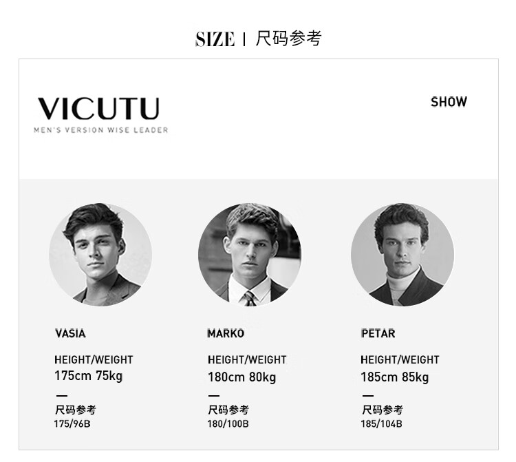 China (cm) 165 / 88-90 170 / 96-98 175 / 108-110 180 / 118-122 185 / 126-130
