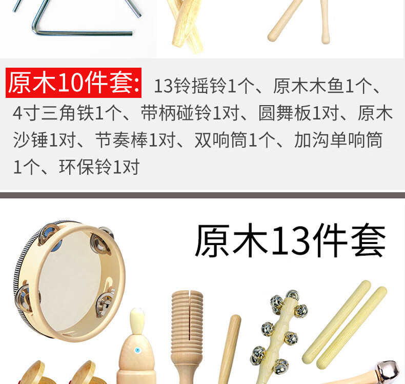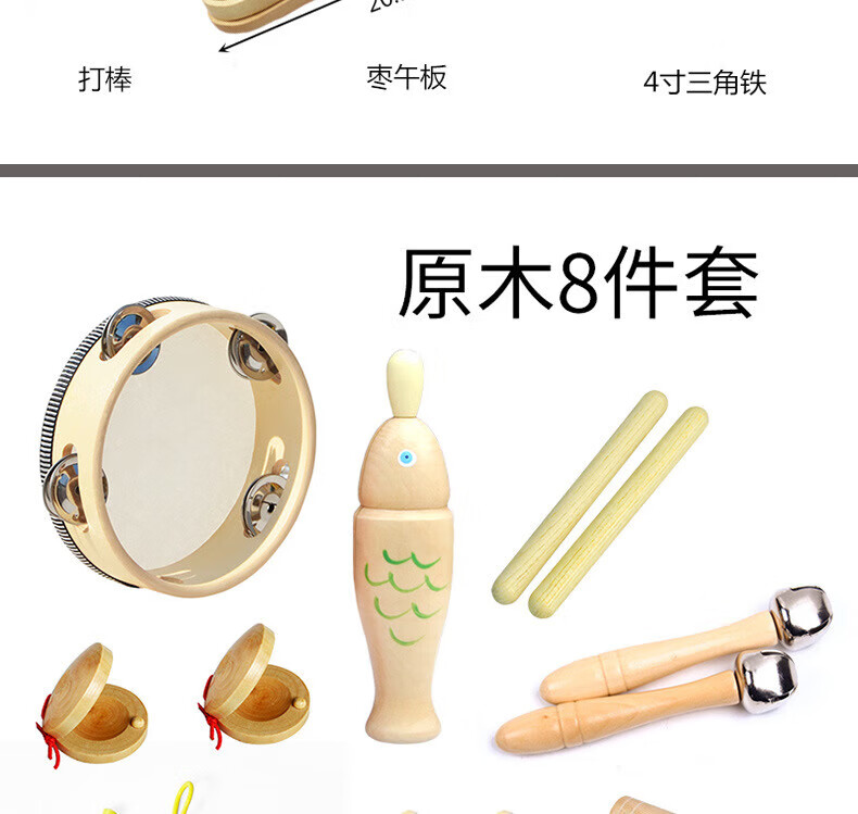 幼儿园原木奥尔夫打击乐器套装儿童玩具碰铃响板沙锤手拍鼓双响筒 原木波浪鼓
