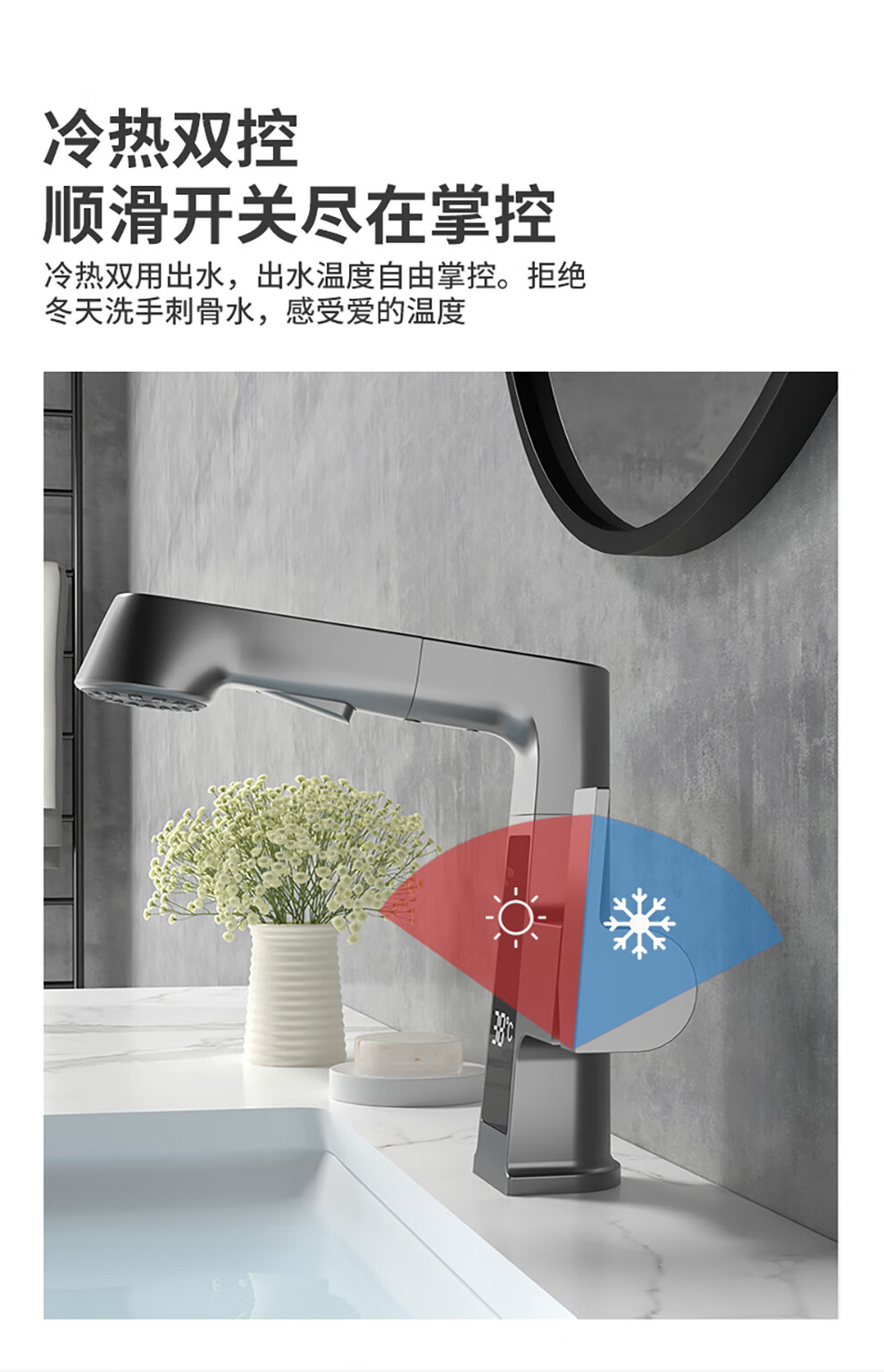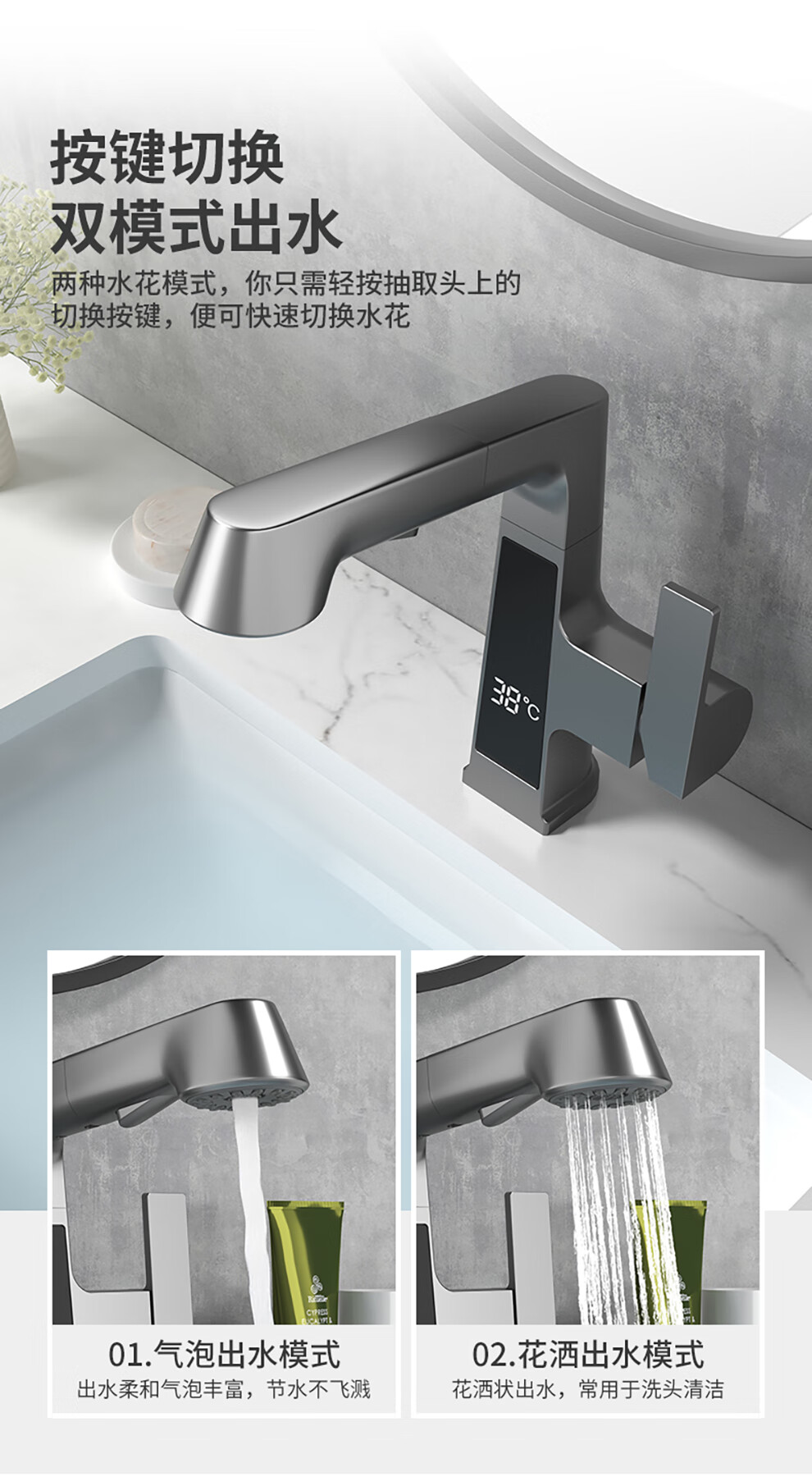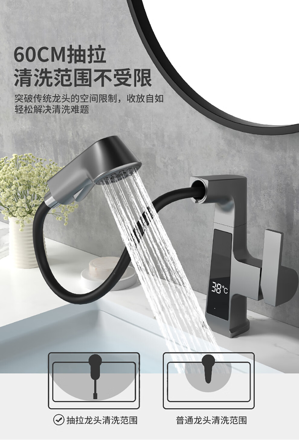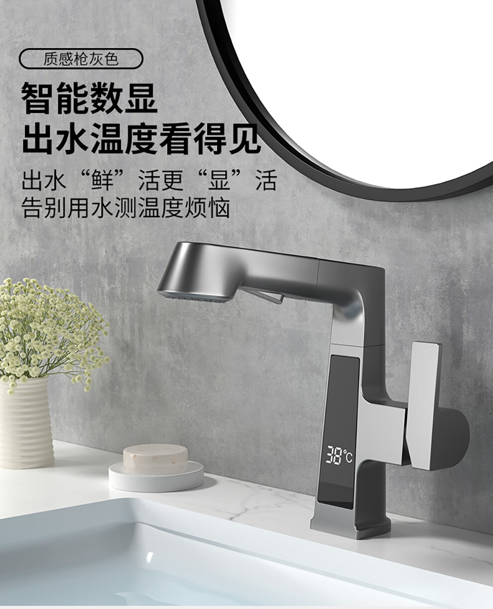 RTO fine copper basin faucet pull-out 360 rotating faucet bathroom basin faucet hot and cold dual-use faucet gray TLS5012 hot and cold digital display lifting pull-out nationwide joint warranty