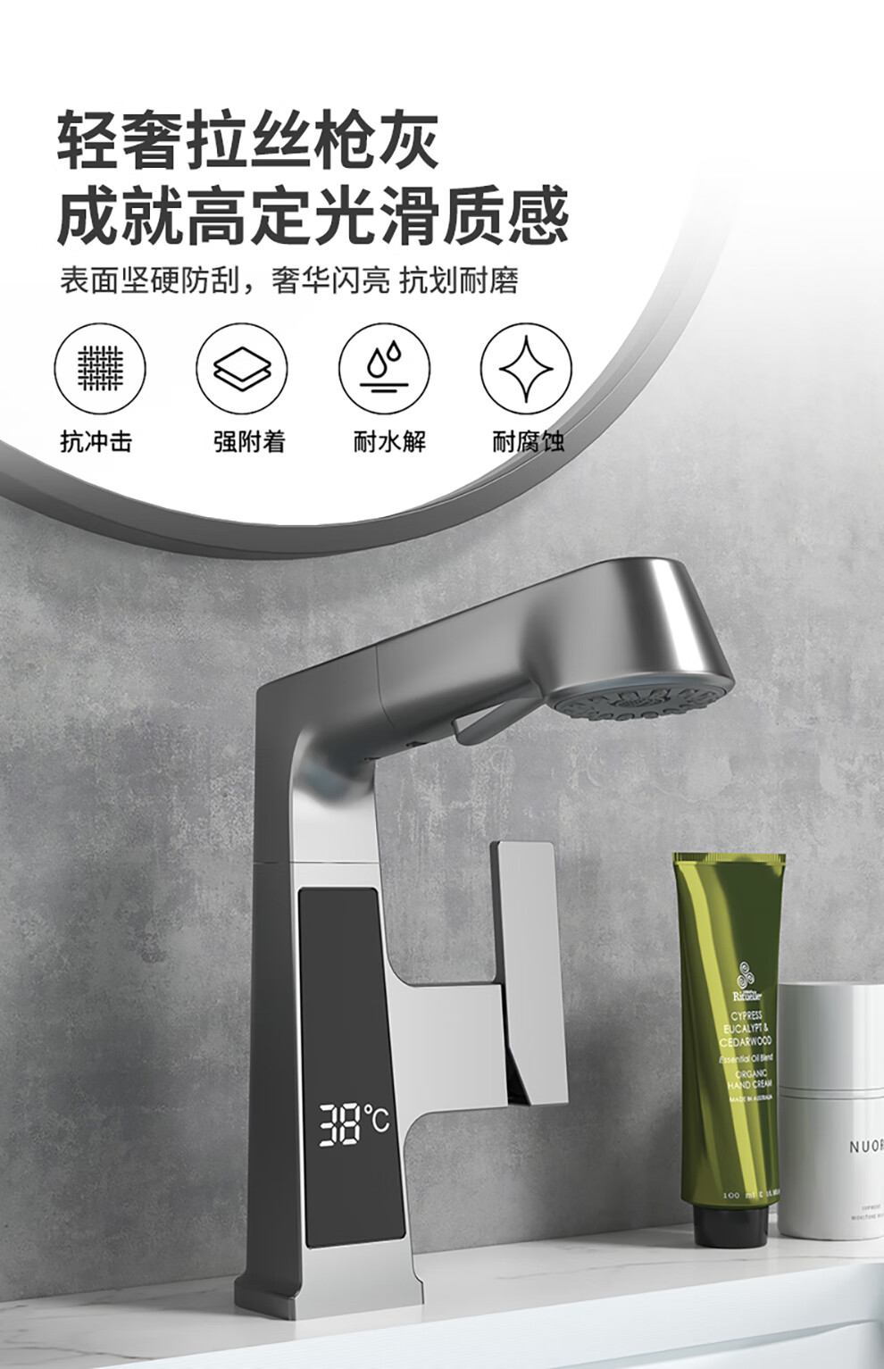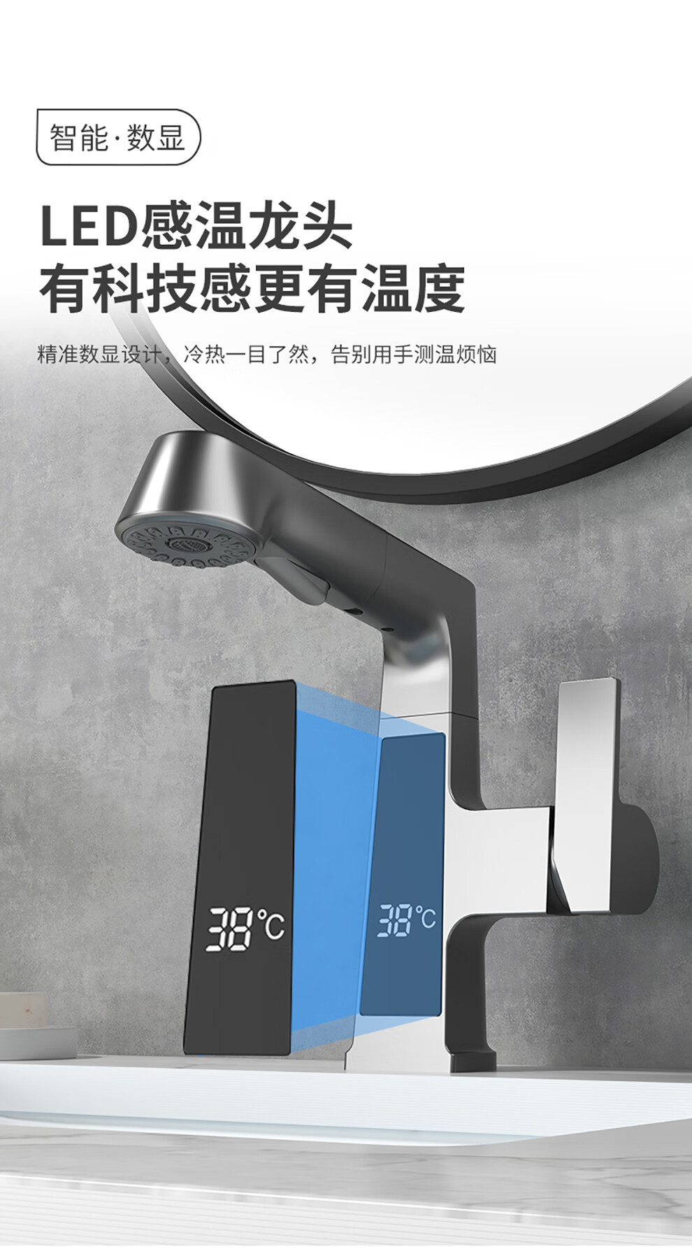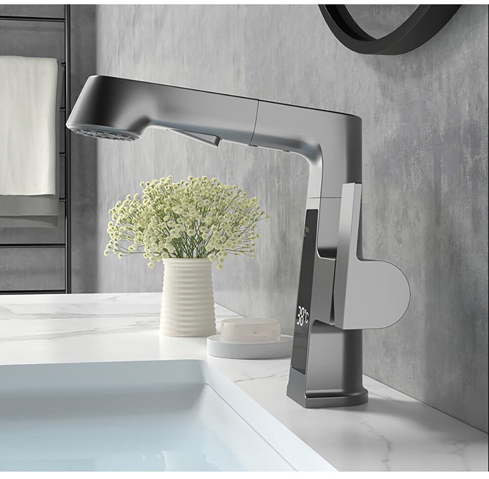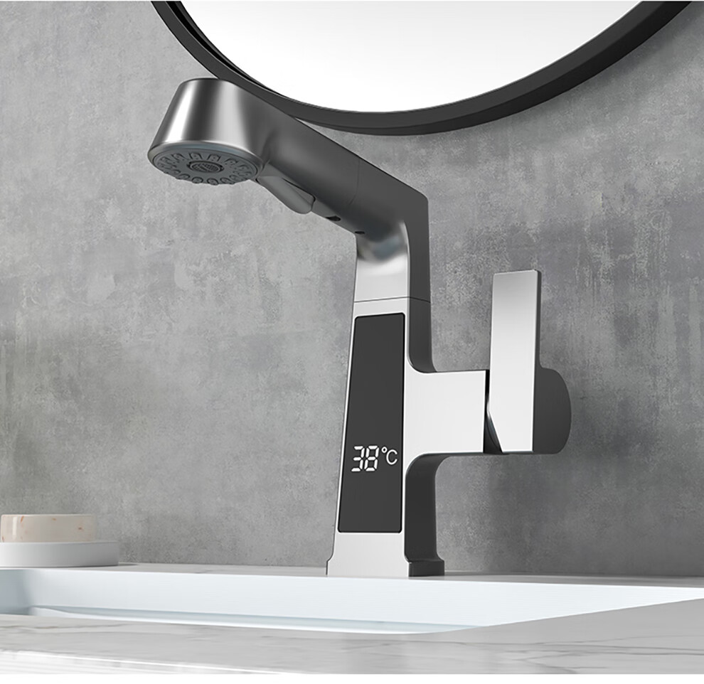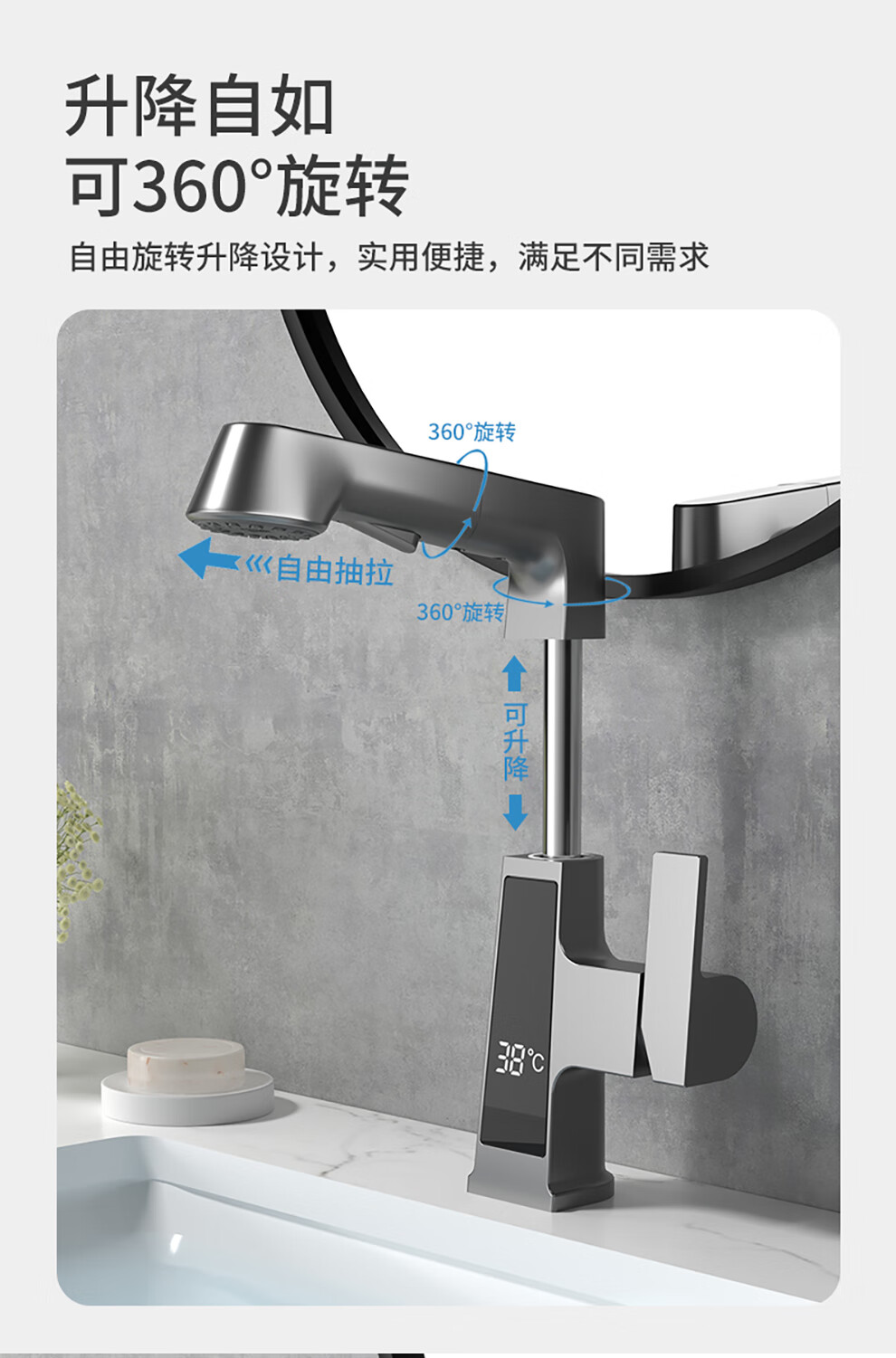 RTO fine copper basin faucet pull-out 360 rotating faucet bathroom basin faucet hot and cold dual-use faucet gray TLS5012 hot and cold digital display lifting pull-out nationwide joint warranty