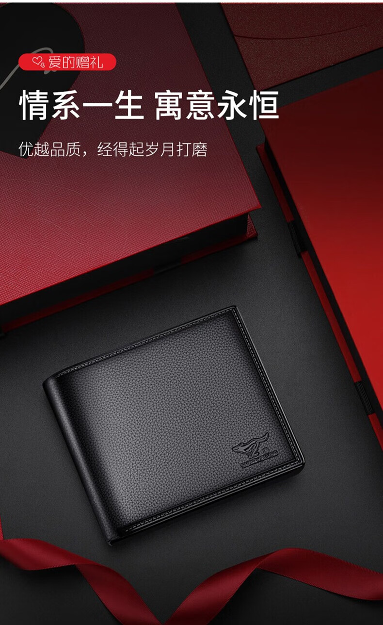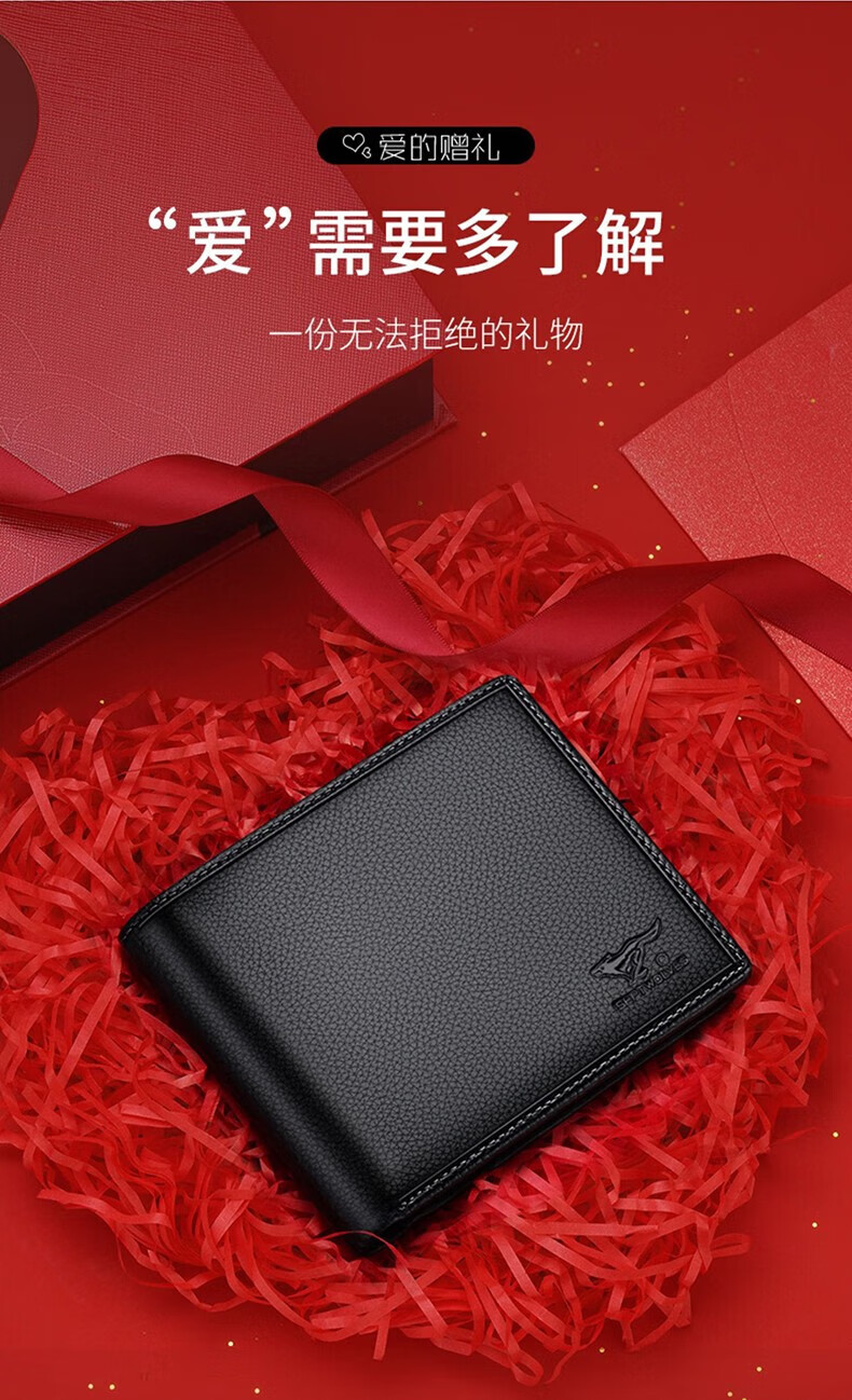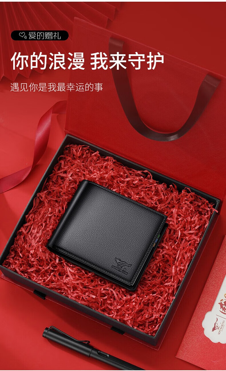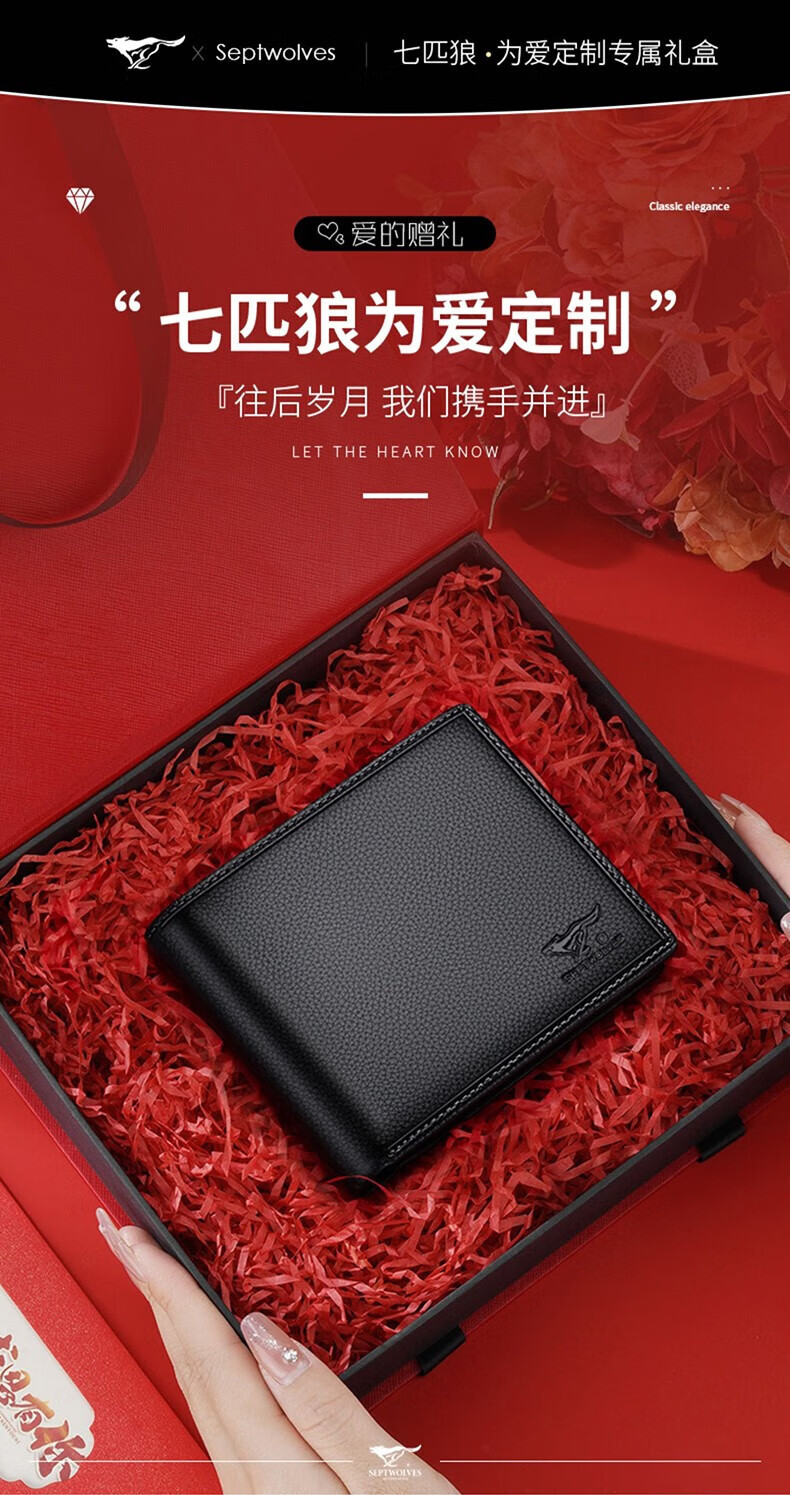 七匹狼(SEPTWOLVES)钱包男真牛皮男士皮夹钱夹短款高档实用生日礼物送男友老公老公 时尚黑色(情人节限定爱心礼盒)