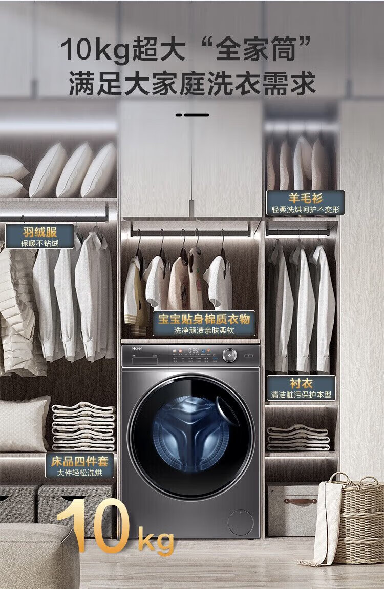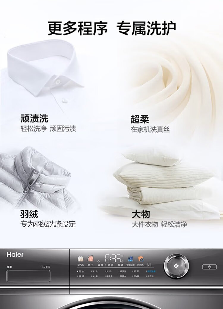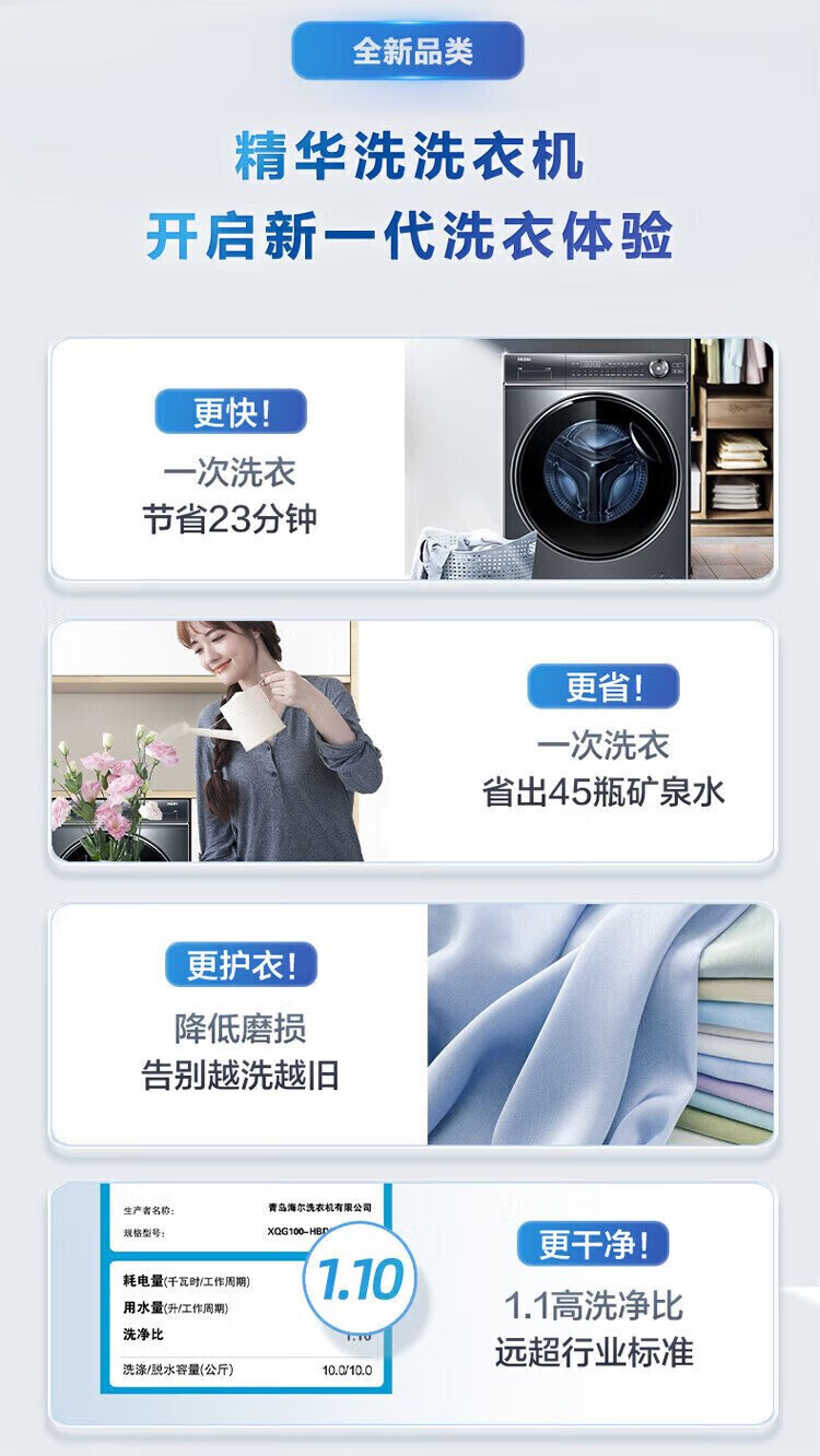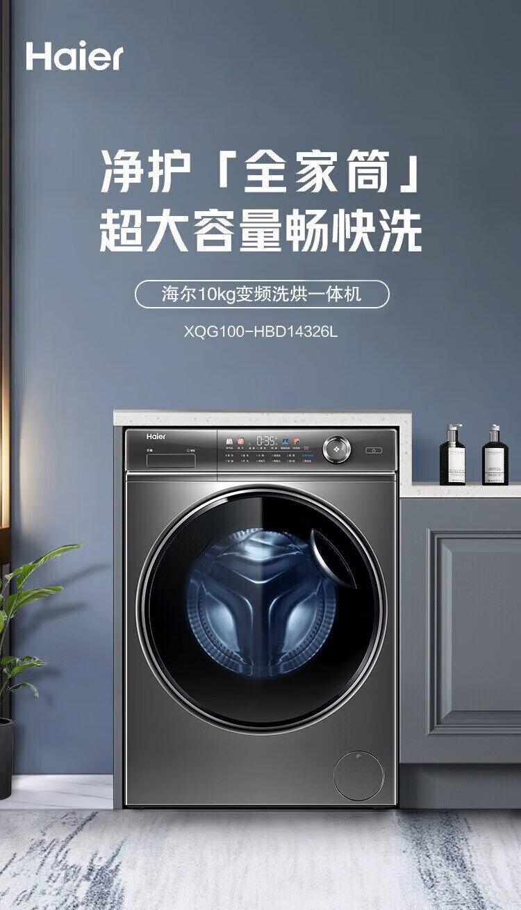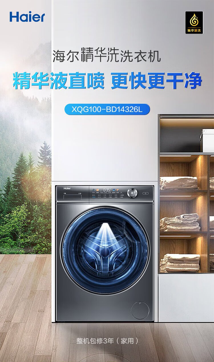 海尔(Haier)【14126升级款精华洗】纤美超薄洗衣机10KG全自动超薄滚筒洗衣机变频智能投放525mm大筒径双喷淋 14326洗烘【升级精华洗2.0】全触控炫彩大屏