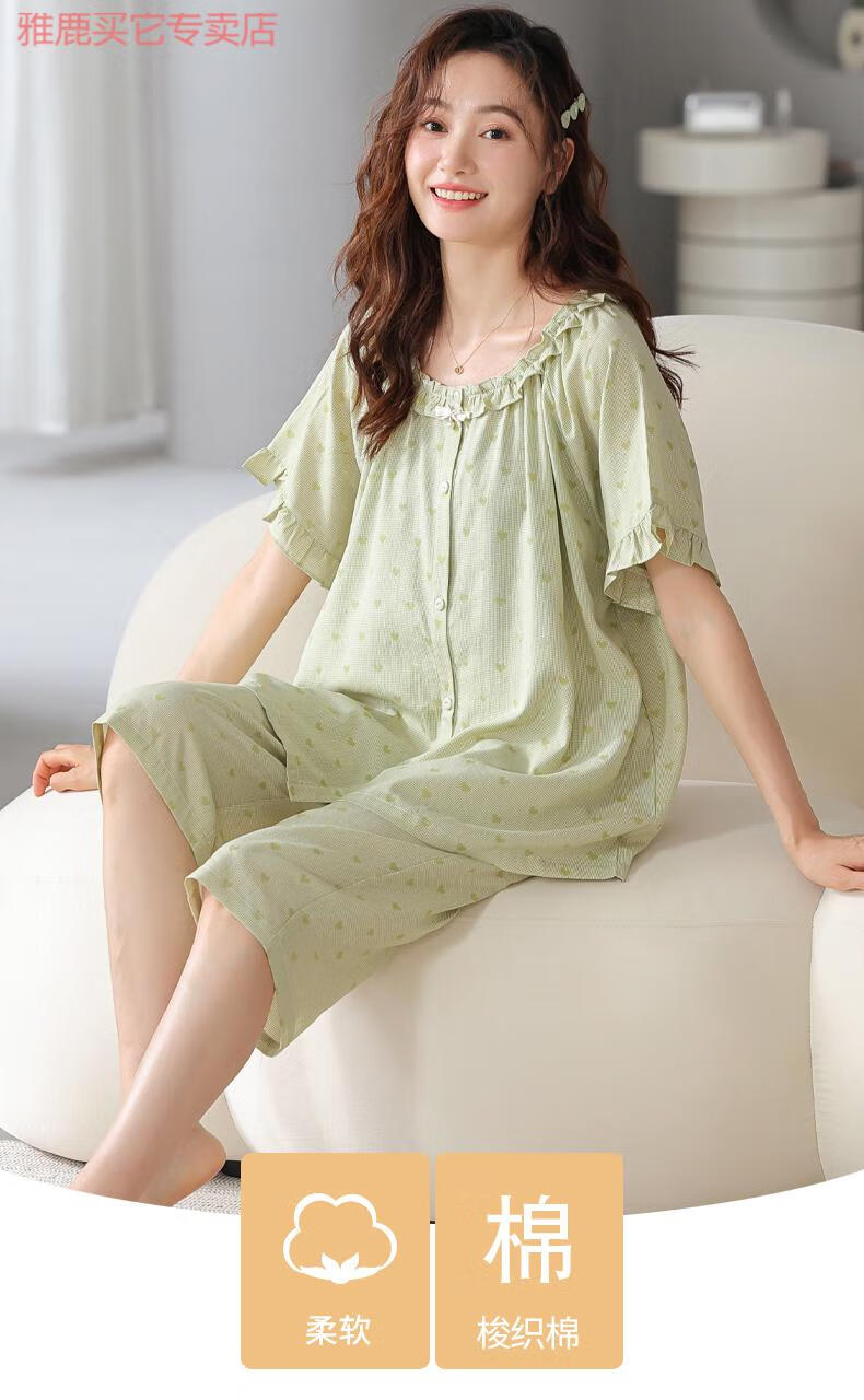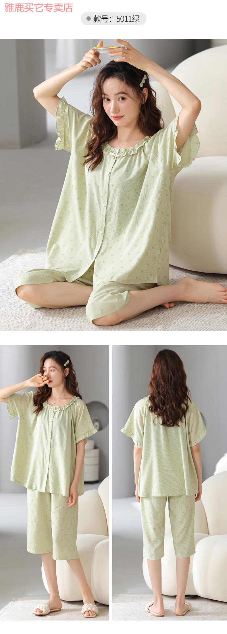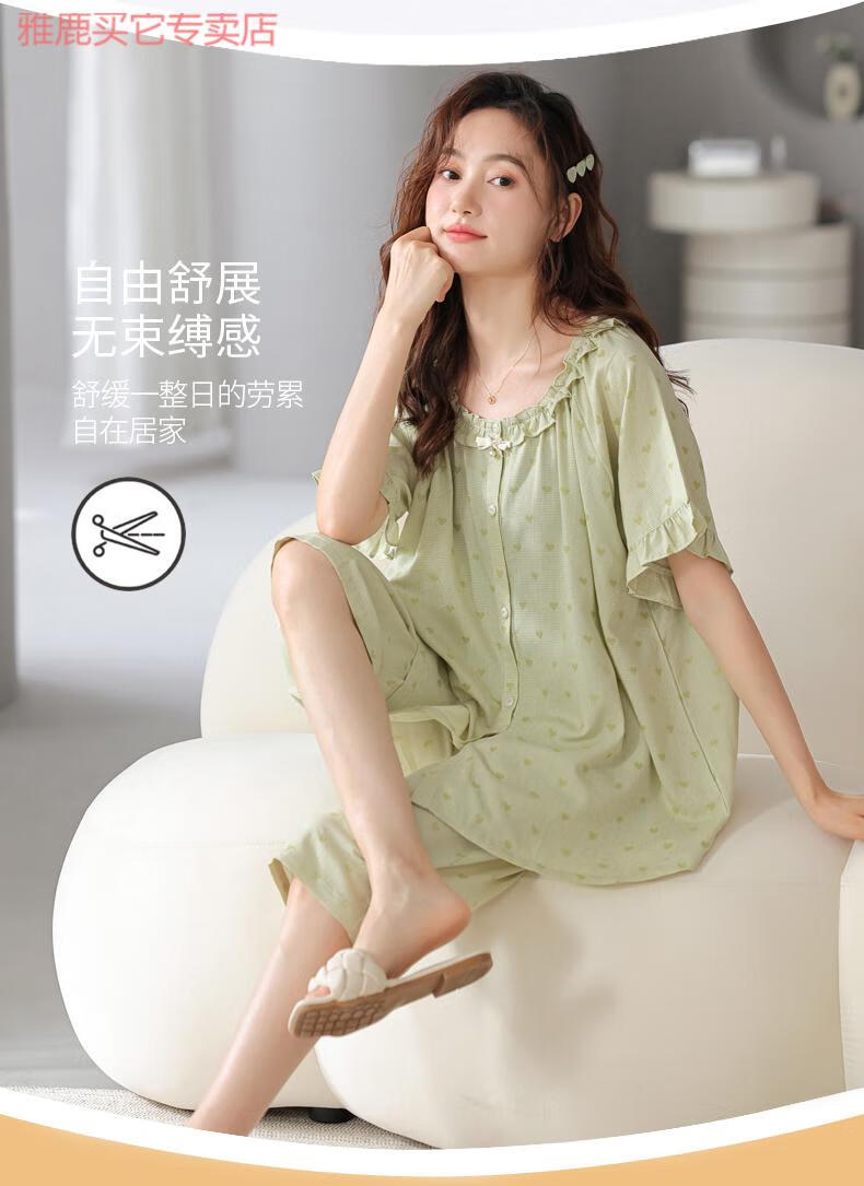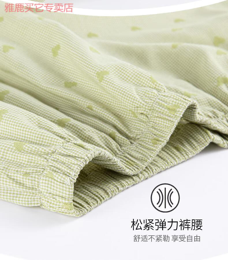 雅鹿梭织纯棉睡衣女夏季薄款短袖七分裤纱布全棉显瘦休闲家居服套装 5021 170(XL) 120-160斤