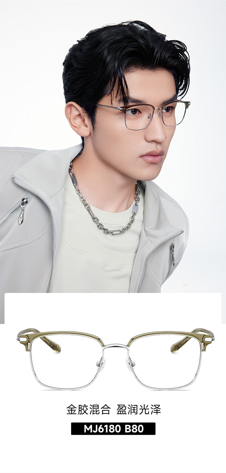 MOLSION陌森眼镜眉架肖战同款男女眼镜框配度数防蓝光MJ6180 B80银色|橄榄绿 框+优可视防蓝光1.60片(600度内)