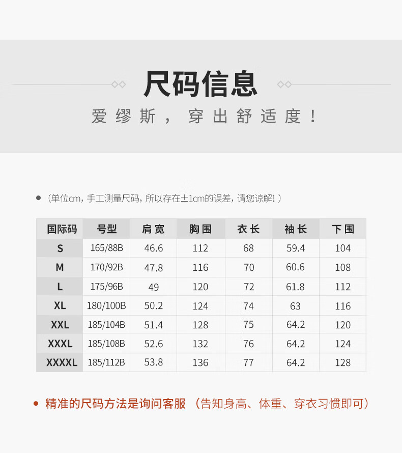 China (cm) 165 / 88-90 170 / 96-98 175 / 108-110 180 / 118-122 185 / 126-130