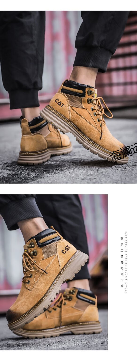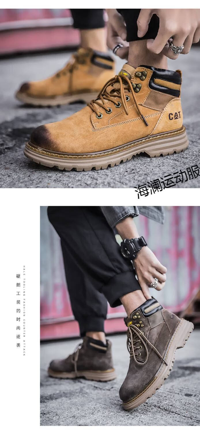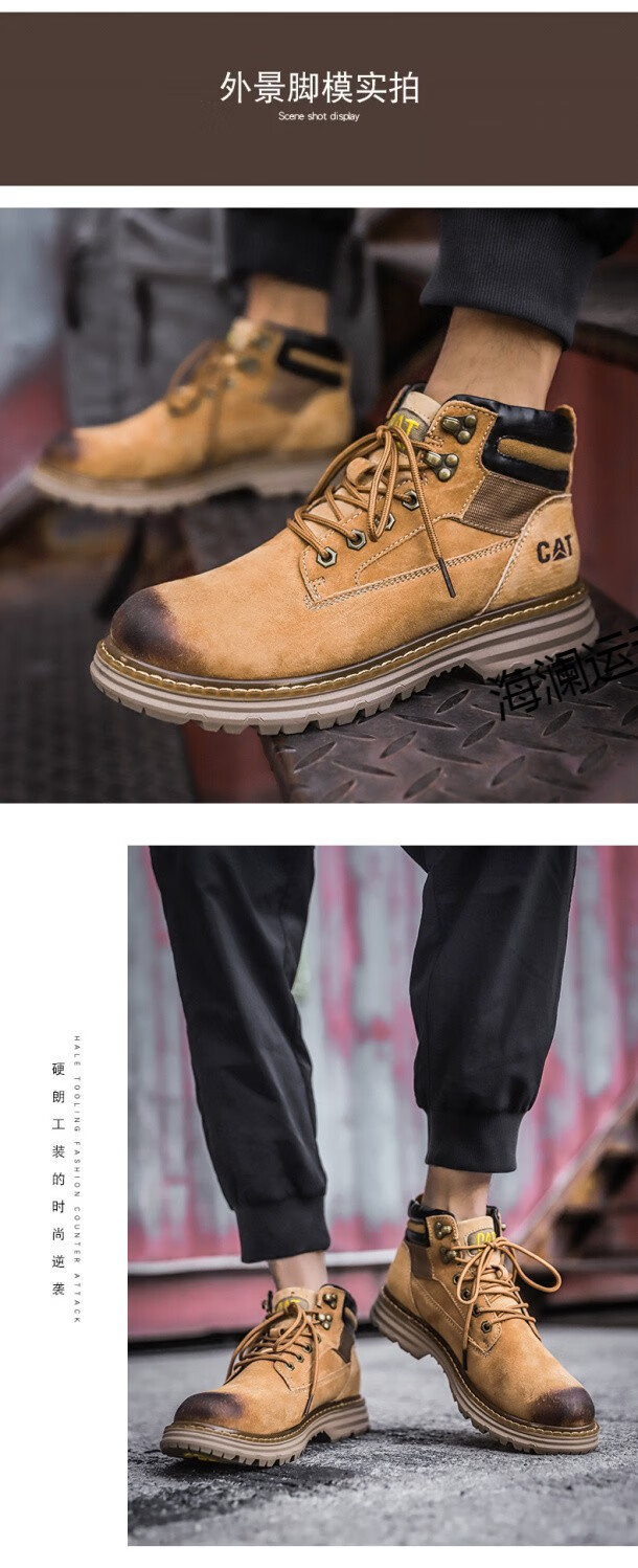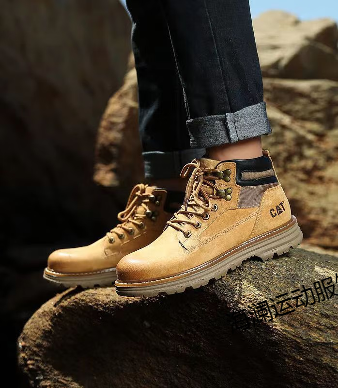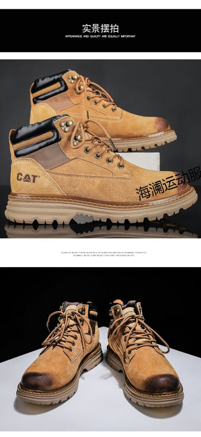 卡特cat男鞋中高帮马丁靴防滑耐磨户外登山鞋真皮复古英伦风工装靴 黄棕色 41