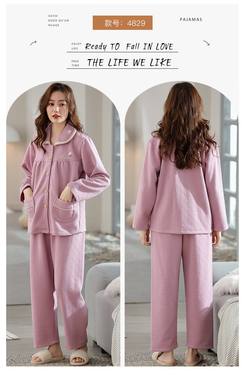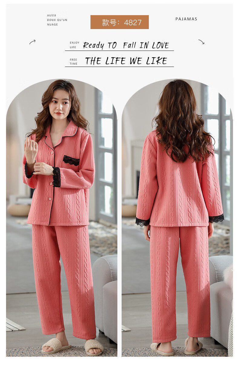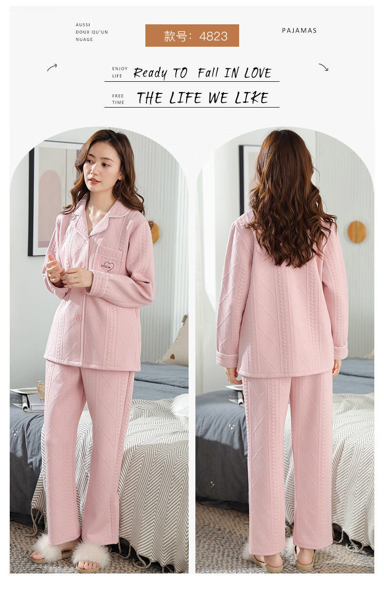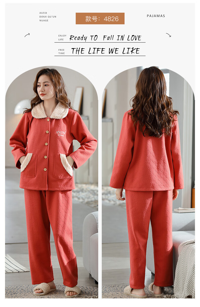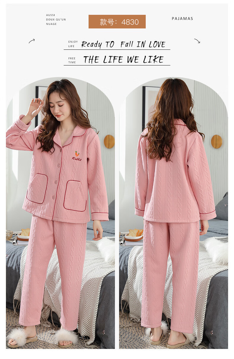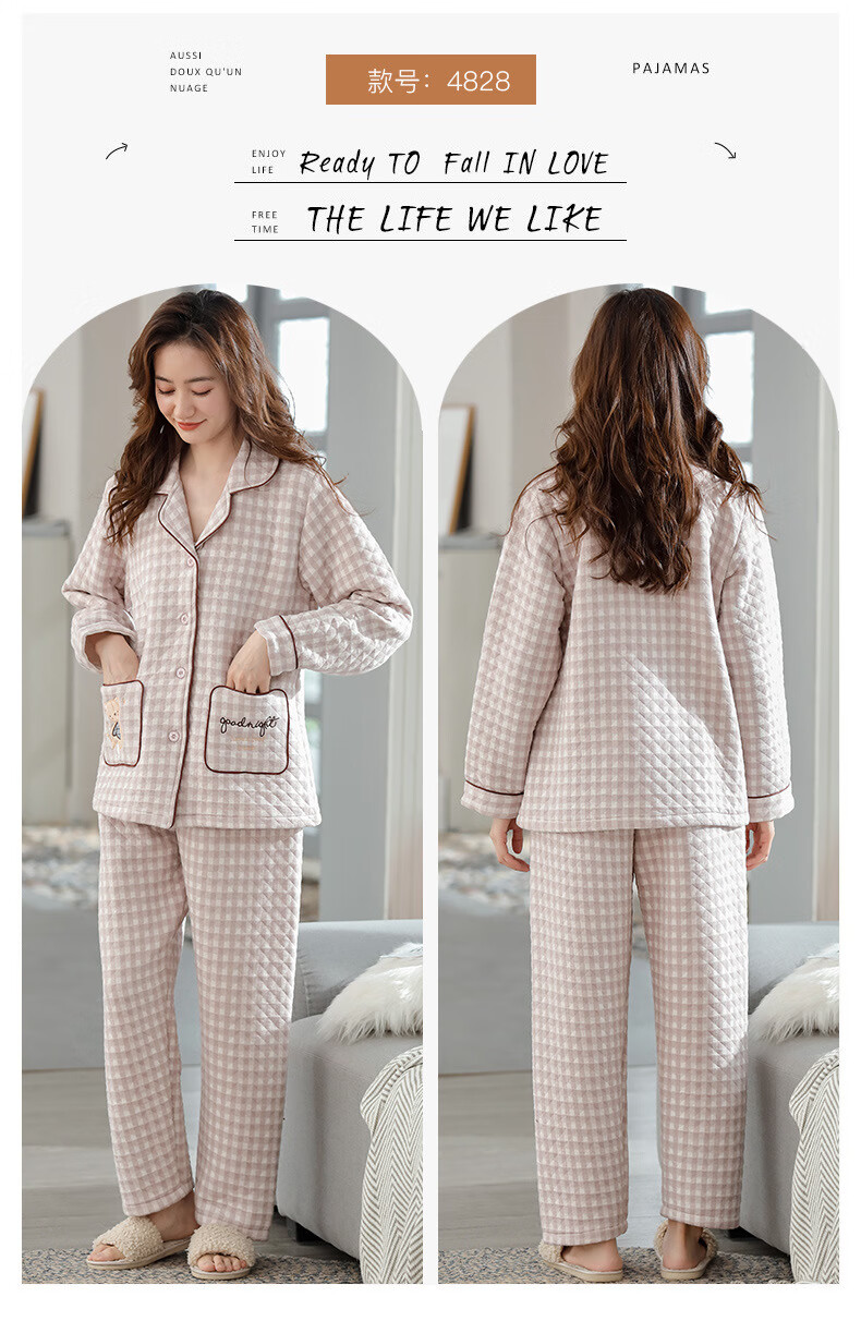 莫代尔三层夹棉睡衣女秋冬新款长袖大码空气棉夹层加厚套装可外穿家居服 4839 L 建议110-120斤