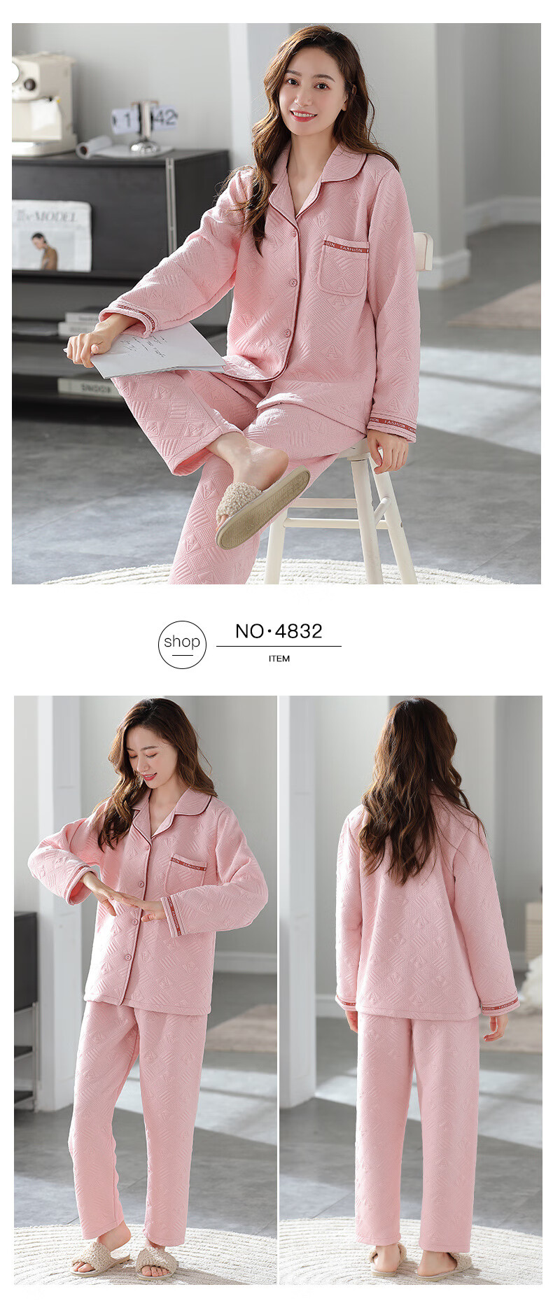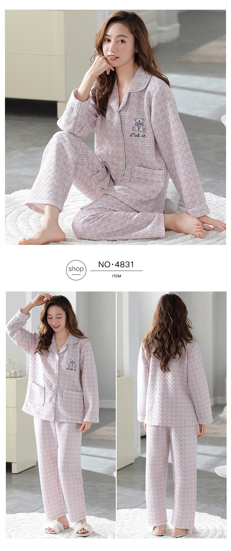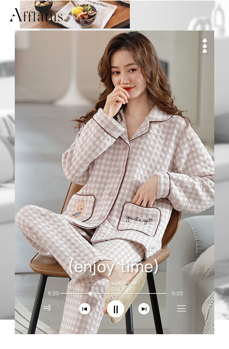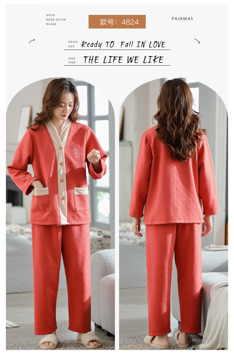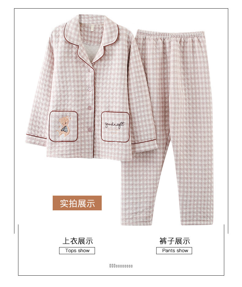 莫代尔三层夹棉睡衣女秋冬新款长袖大码空气棉夹层加厚套装可外穿家居服 4839 L 建议110-120斤