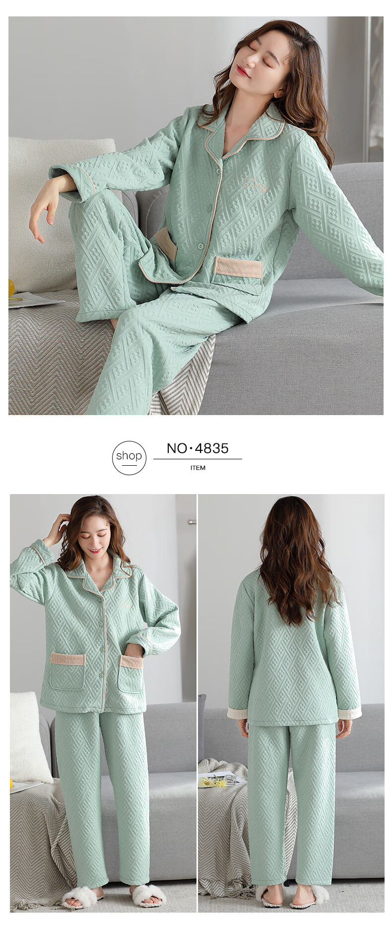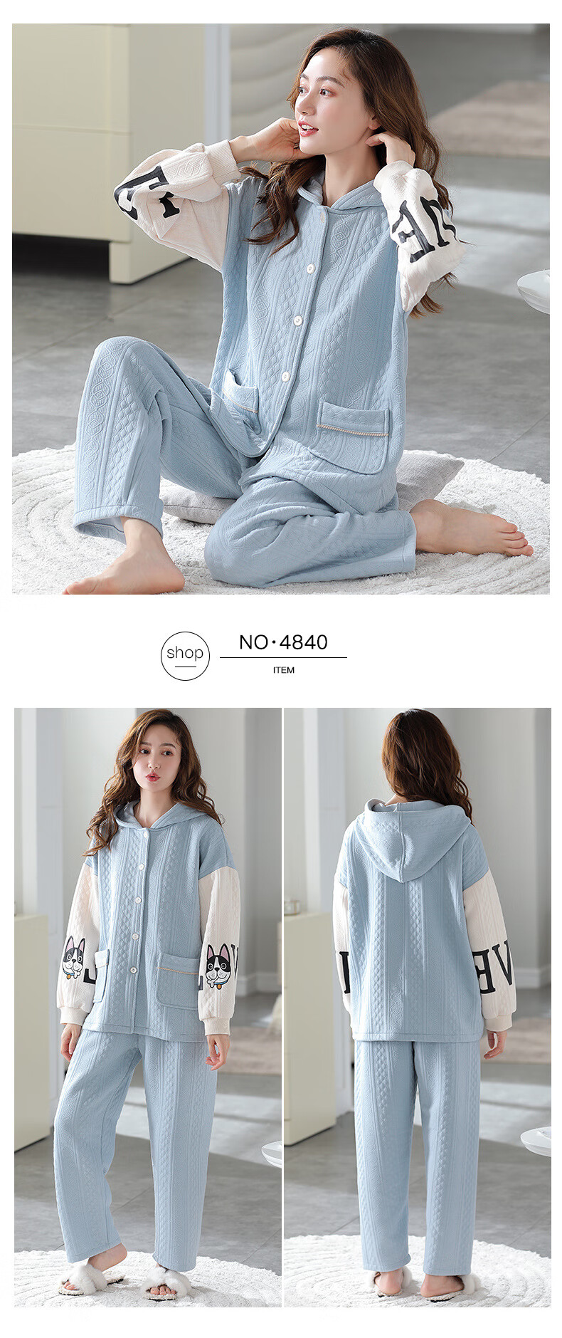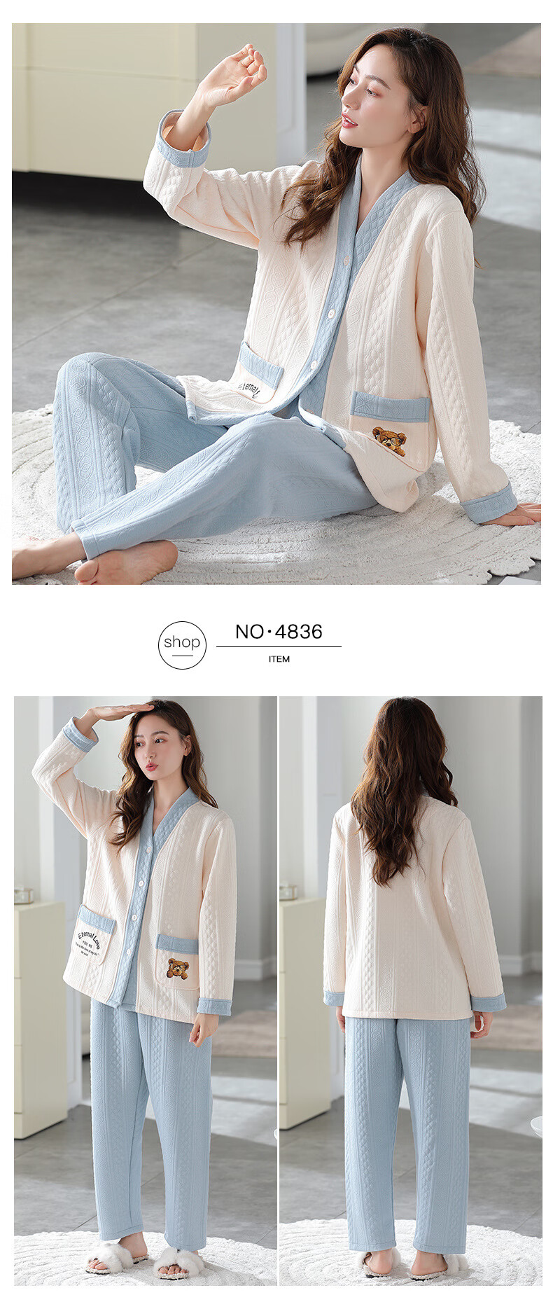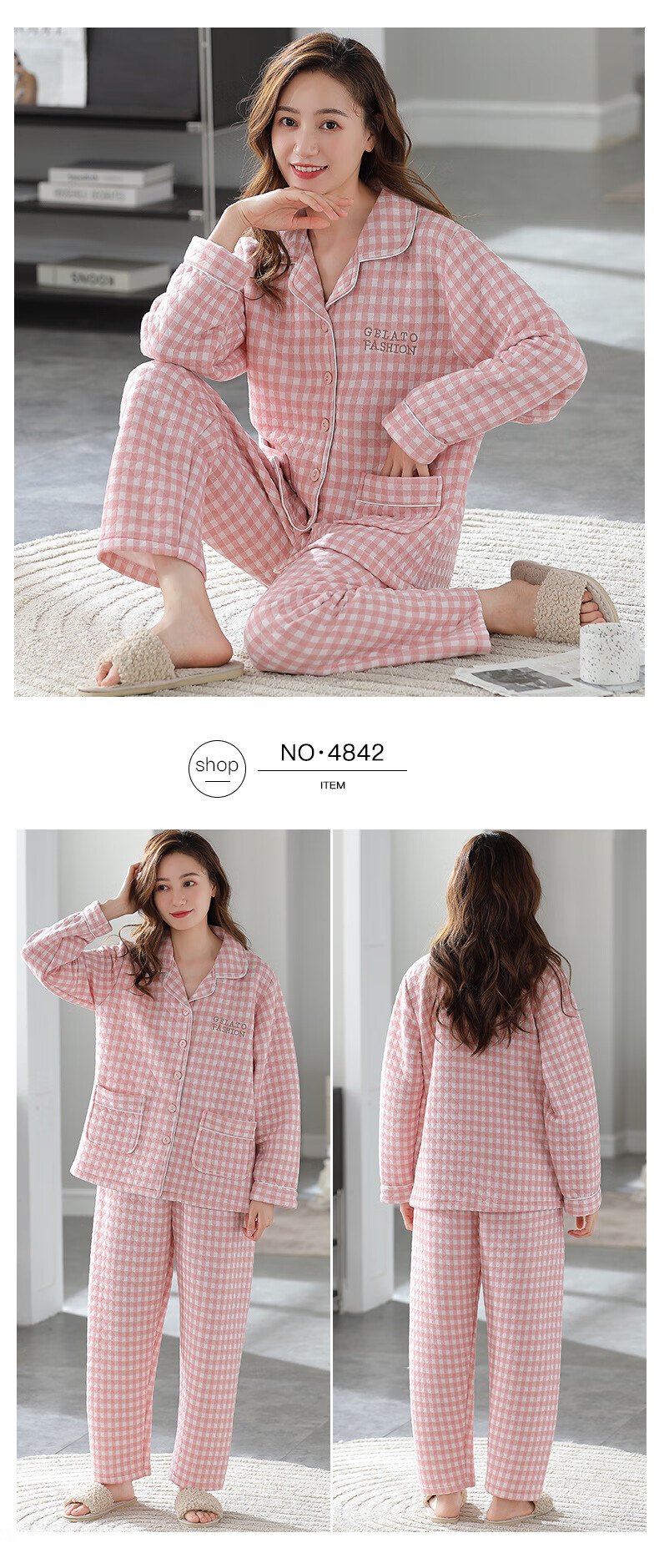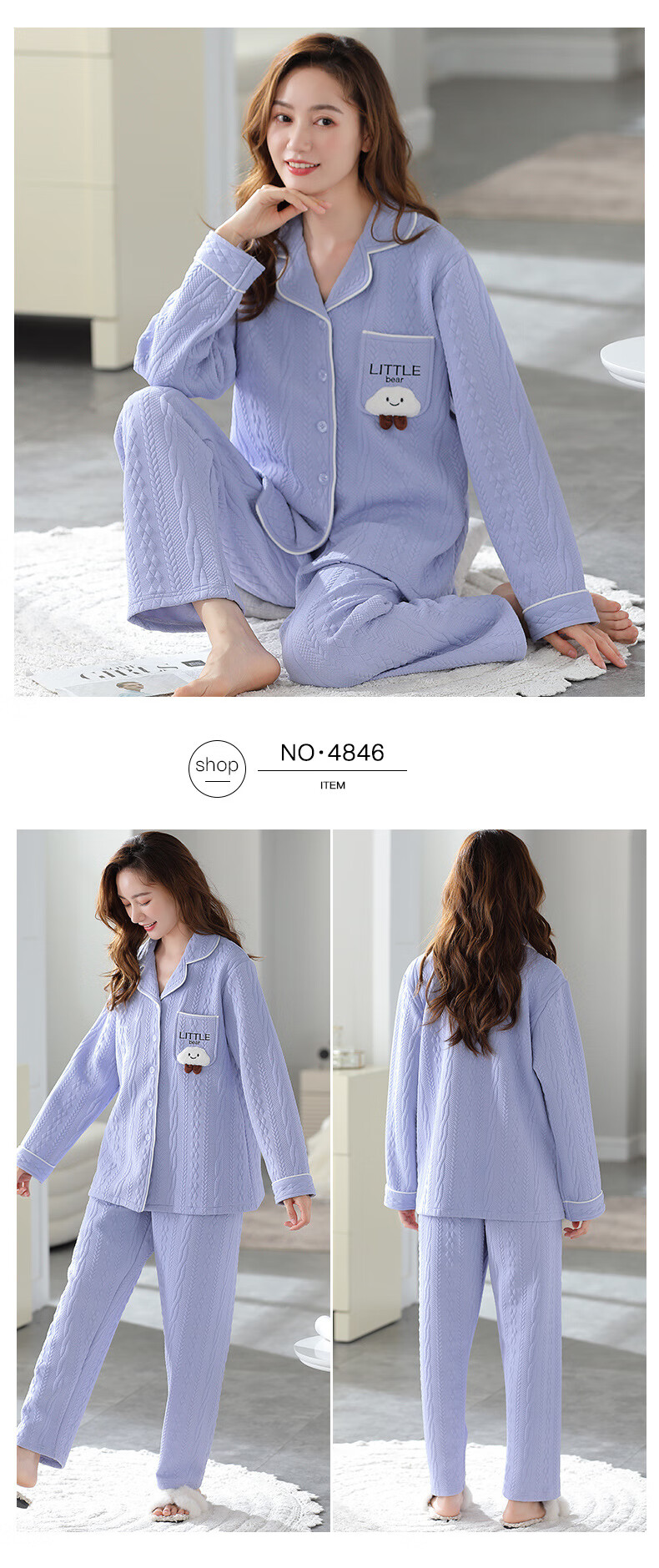 莫代尔三层夹棉睡衣女秋冬新款长袖大码空气棉夹层加厚套装可外穿家居服 4839 L 建议110-120斤