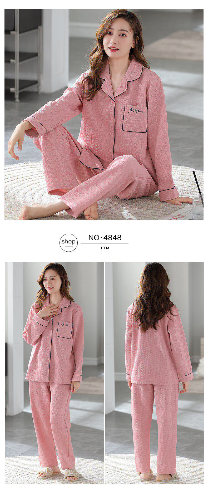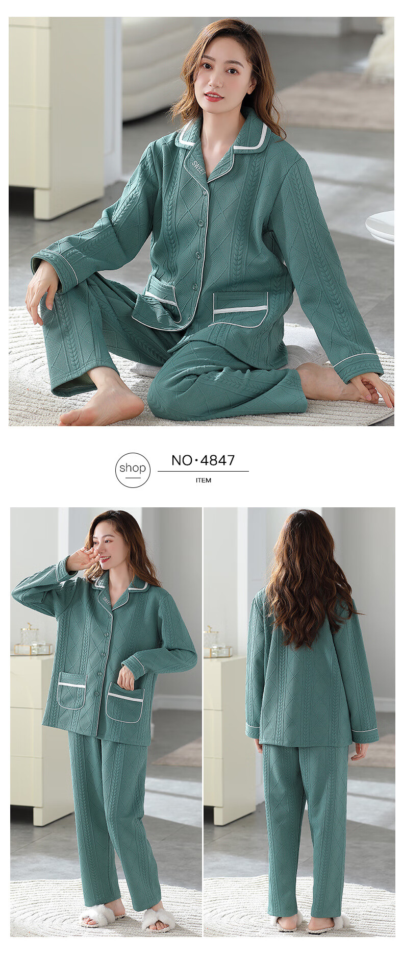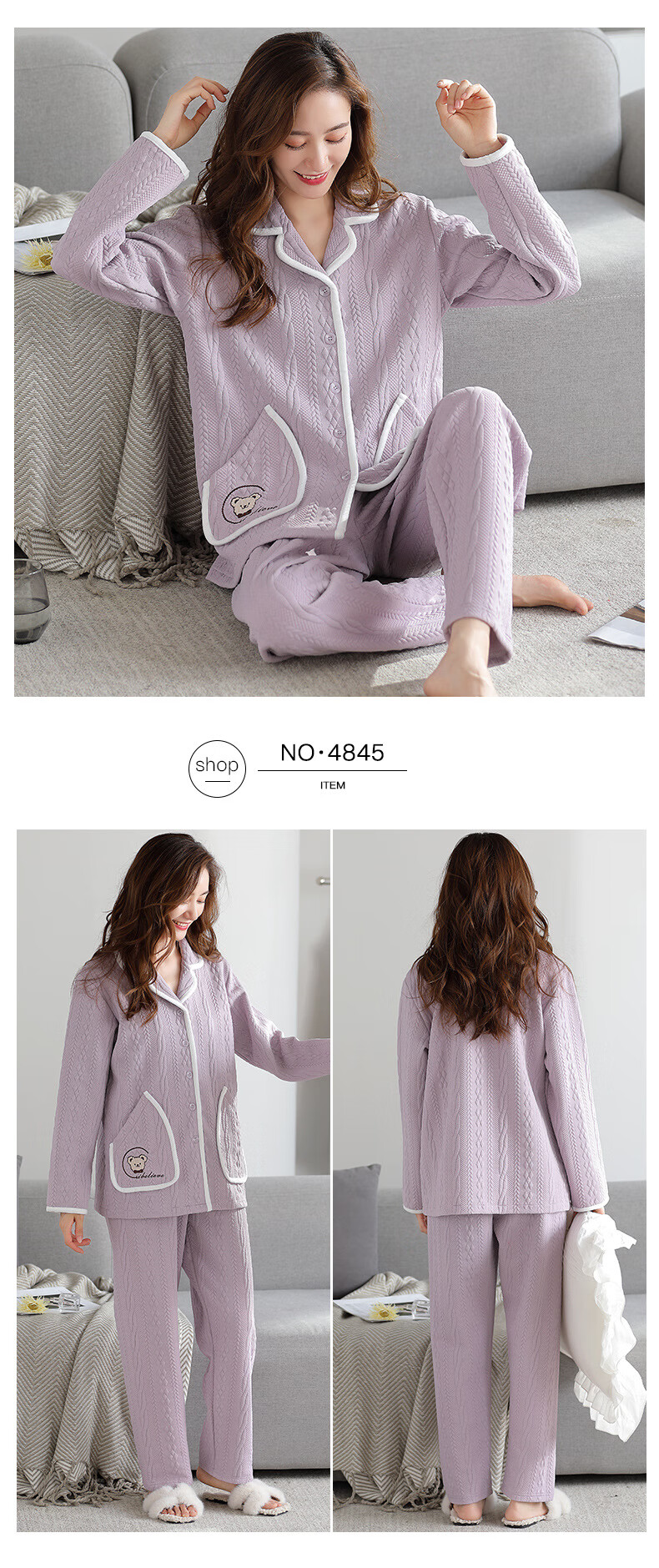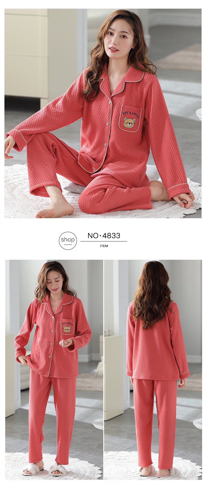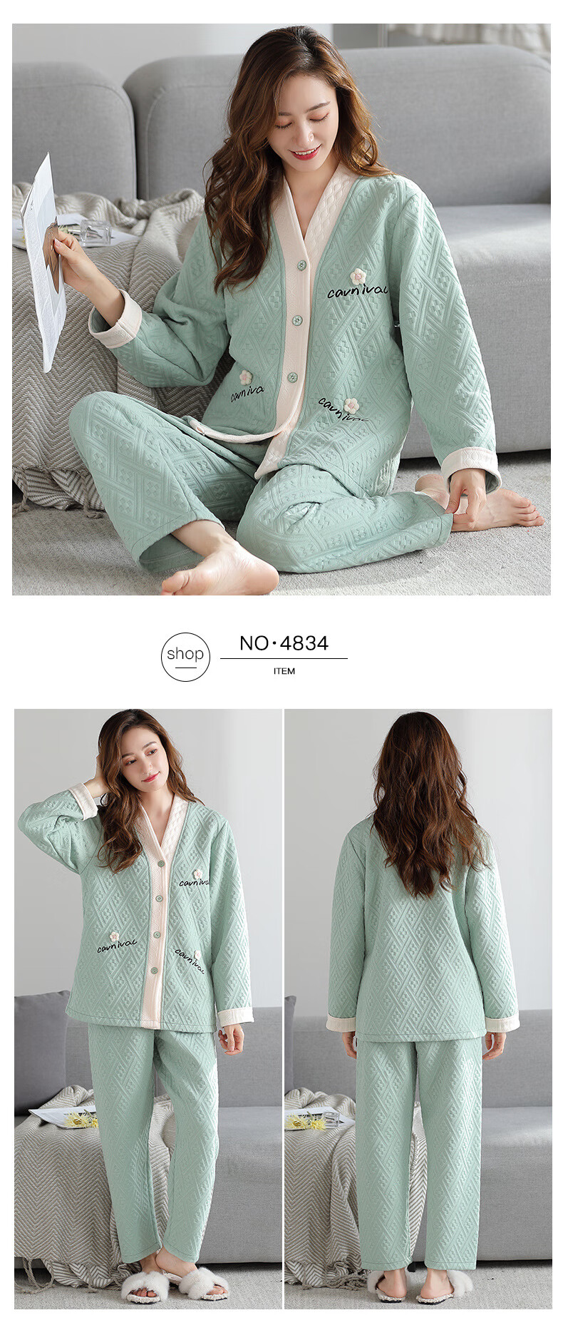 莫代尔三层夹棉睡衣女秋冬新款长袖大码空气棉夹层加厚套装可外穿家居服 4839 L 建议110-120斤