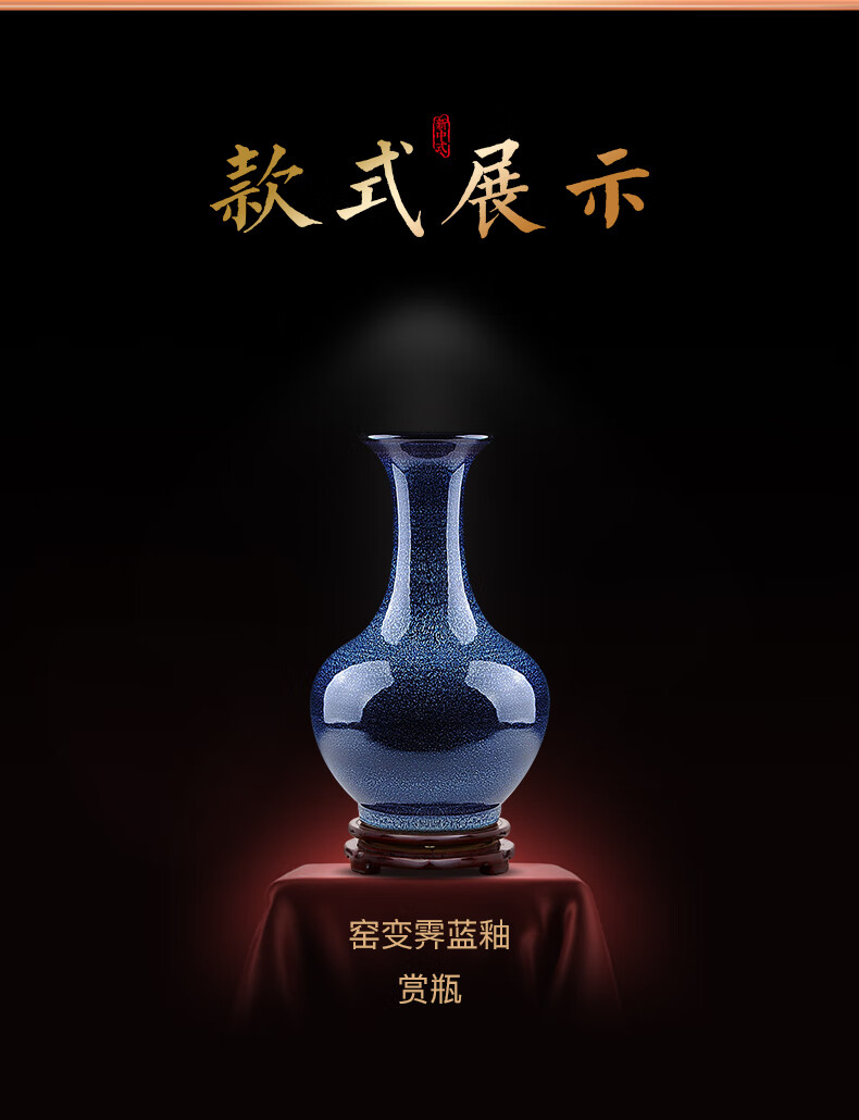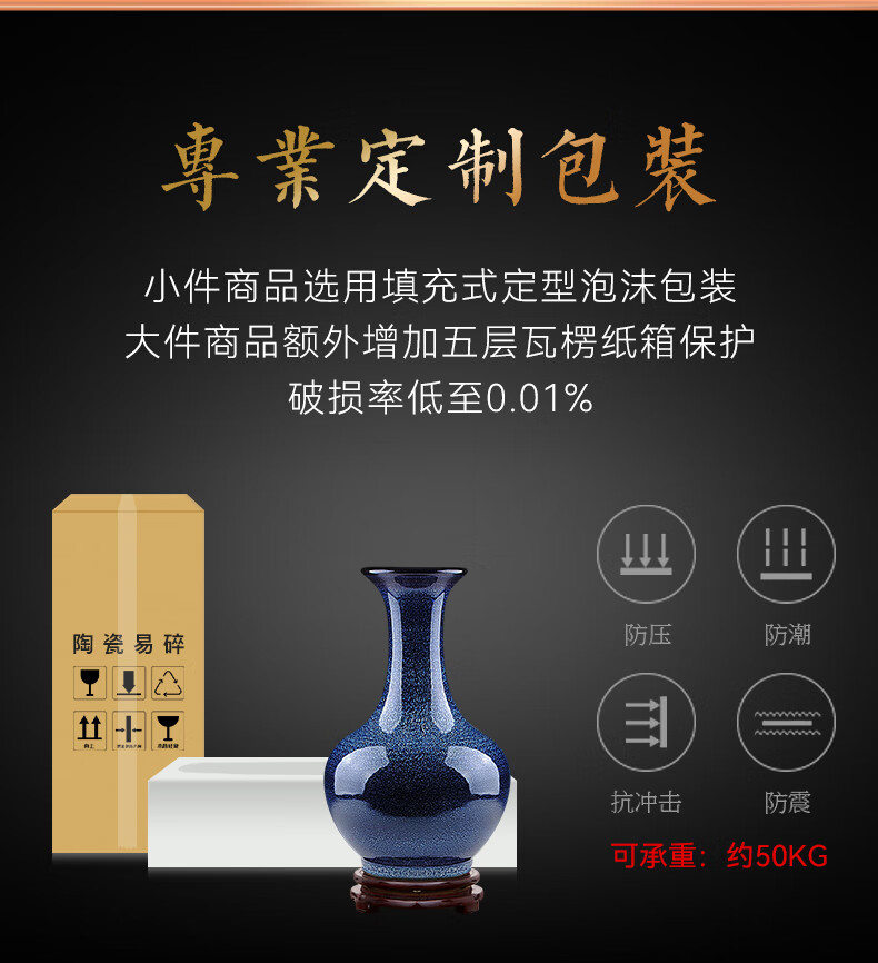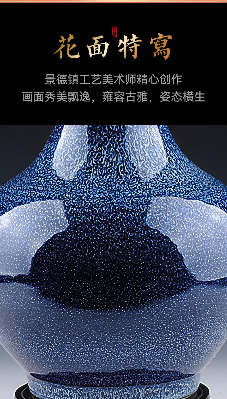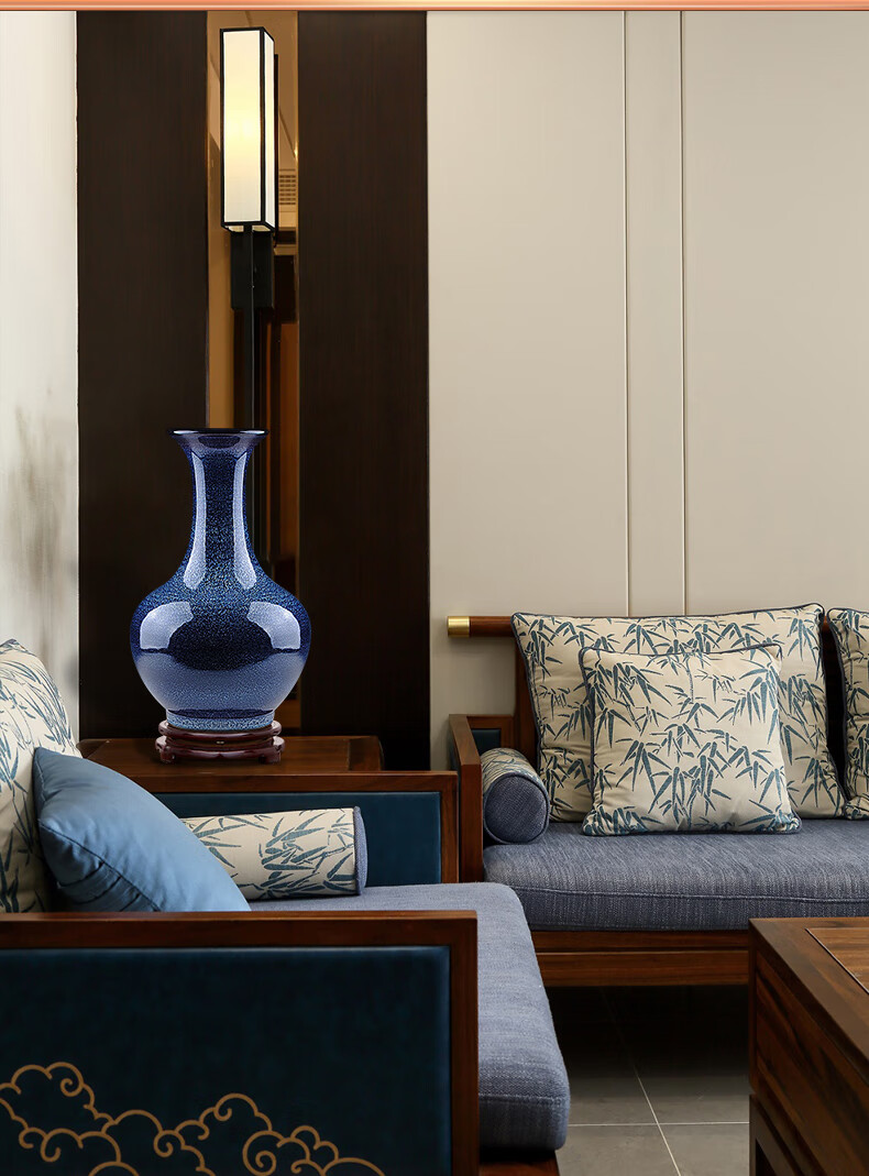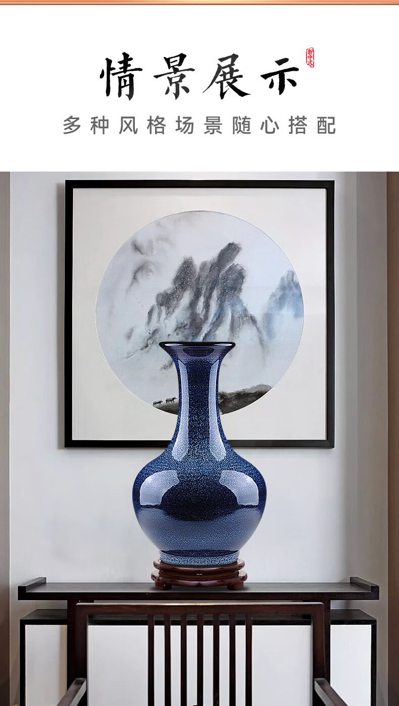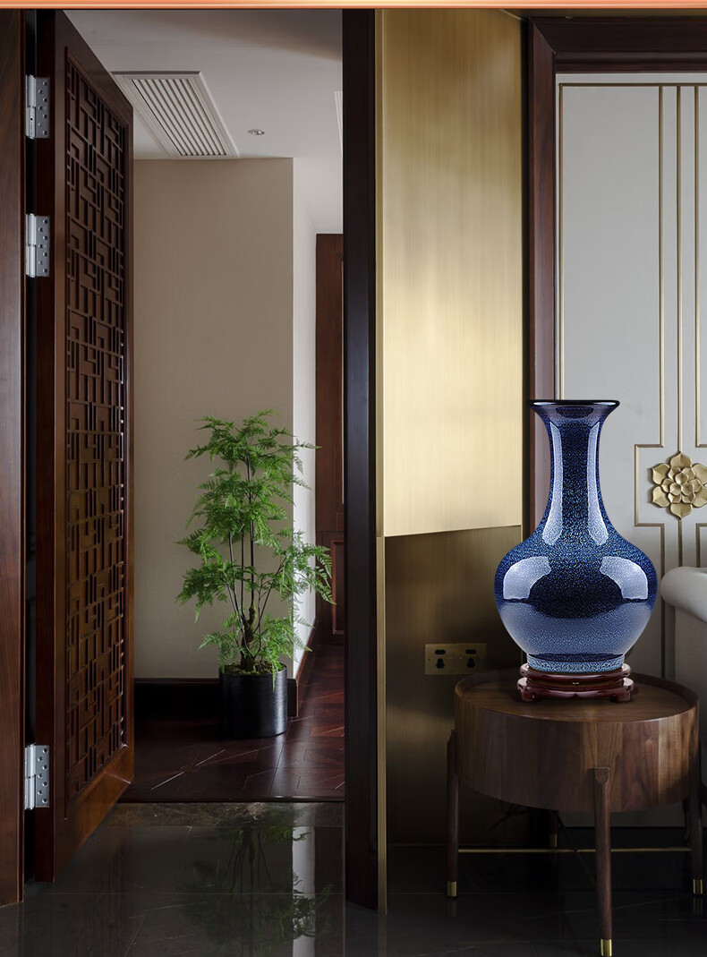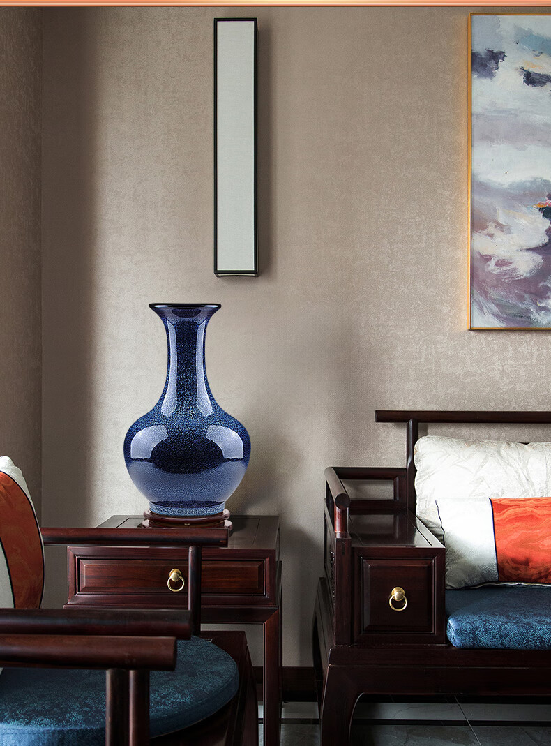 Orgulloso Jingdezhen Cerámica Nuevo jarrón de estilo chino Decoración de oficina Sala de estar Entrada Artesanía Soporte arqueológico Arte Regalo Horno Transformación Ji Blue Glaze Apreciación Jarrón + Base + Certificado