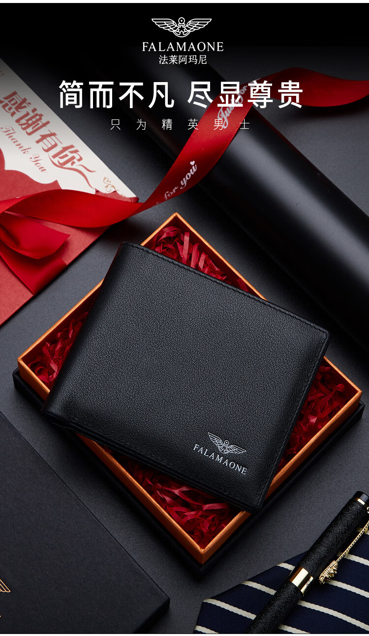 FALAMAONE first layer cowhide genuine leather men's wallet authentic high-end brand wallet short birthday gift for husband and father QB203-1 high-end gift box packaging