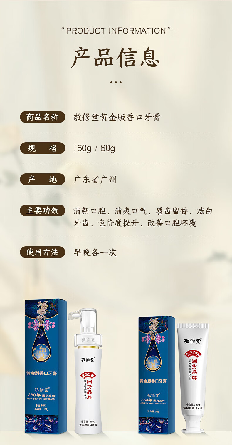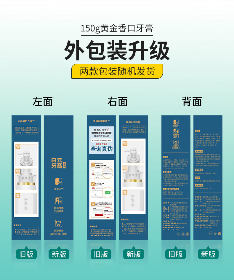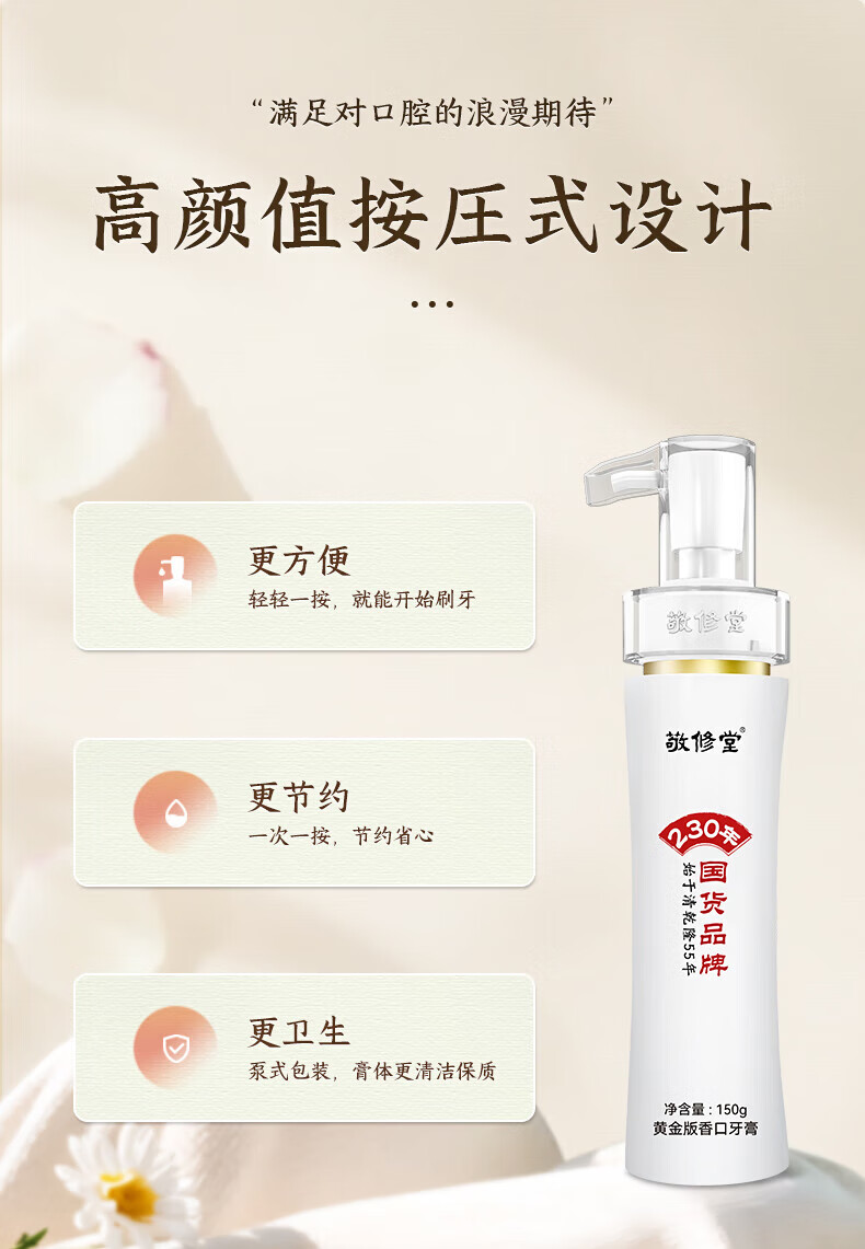 敬修堂白云山敬修堂黄金版香口牙膏亮白清新口气持久清新按压式牛黄 1瓶150g香口牙膏 150g 1支*