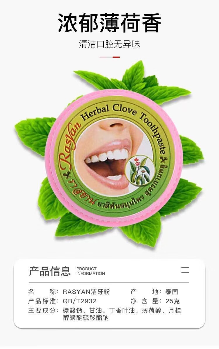 Rasyan泰国正装RASYAN牙膏洗牙粉变美白亮牙齿去除烟茶黑黄渍清新口臭气 粉色(25G)