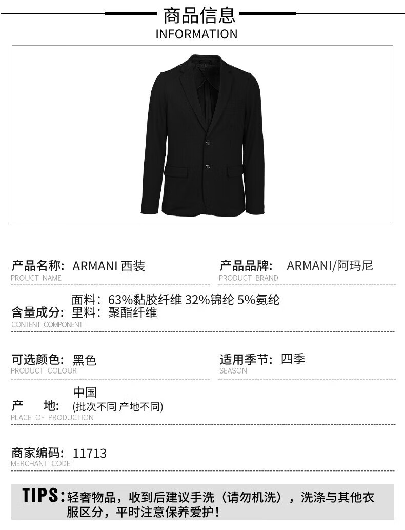 阿玛尼(ARMANI)奢侈品男装男士西装商务休闲翻领西装外套礼物 黑色 46